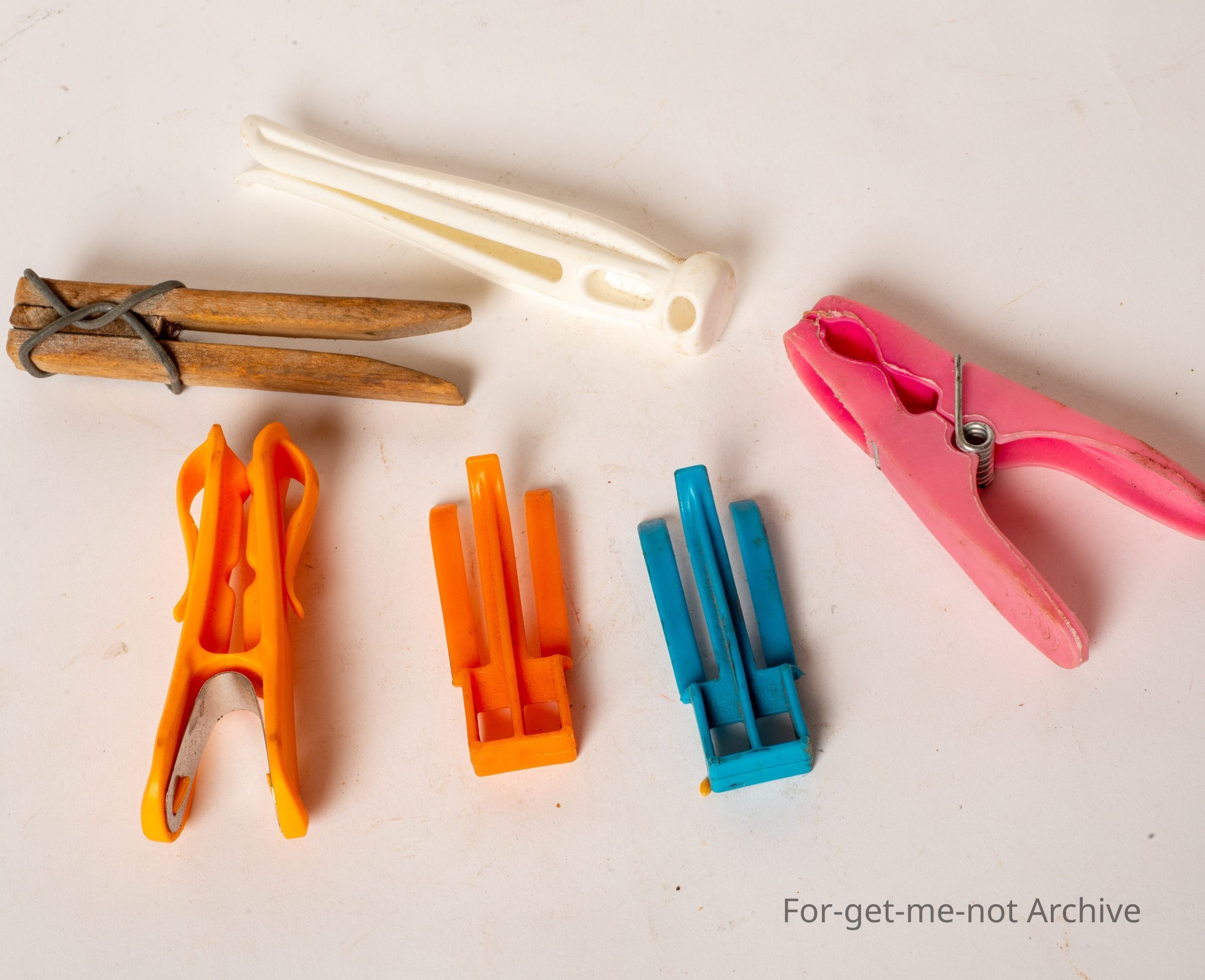 A selection of pegs, plastic, multiple colours, household clothes pegs.