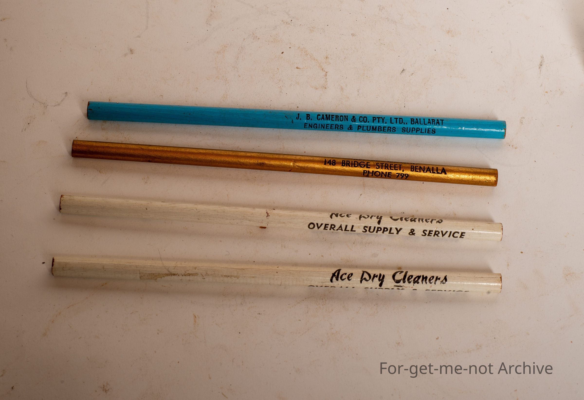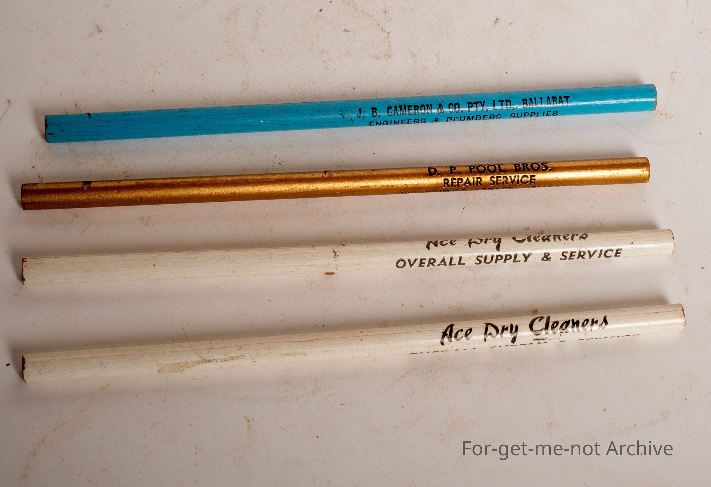 This is a group of unused advertising pencils for Ace Dry Cleaners North Melbourne. Cameron and Co. Ballarat Engineers and Plumbing Supplies. Ace Dry Cleaners again. This is for D. Poole Brothers Repairs, Vanilla.Collection