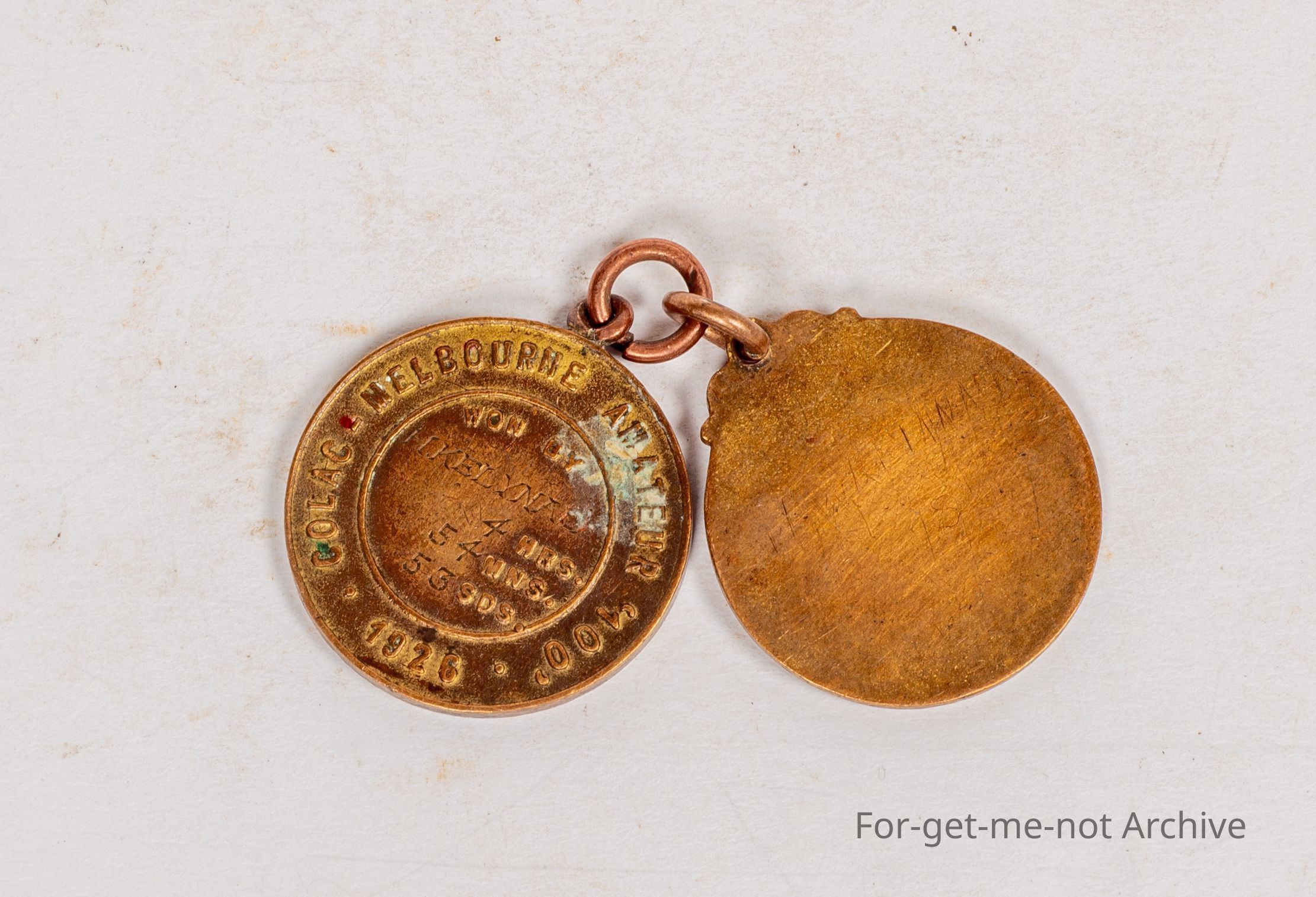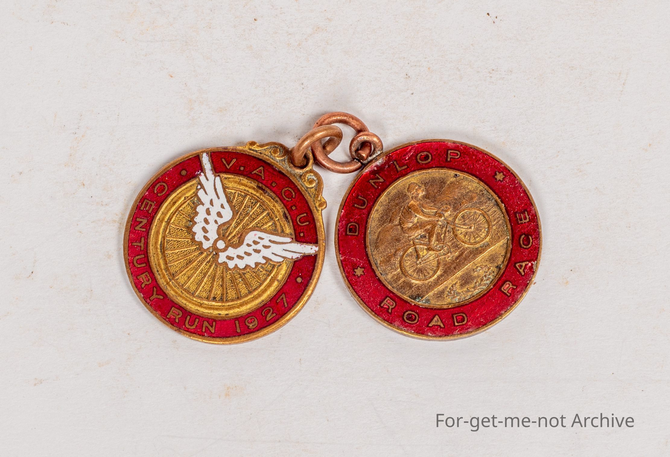 A pair of pendant bicycle related badges. Description. Centenary Run.1927. Victorian Amateur Cycled Union. The other one, Dunlop Road Race. Melbourne Amateur 100 with the winner 4 hours 54 minutes 53 seconds.Collection
