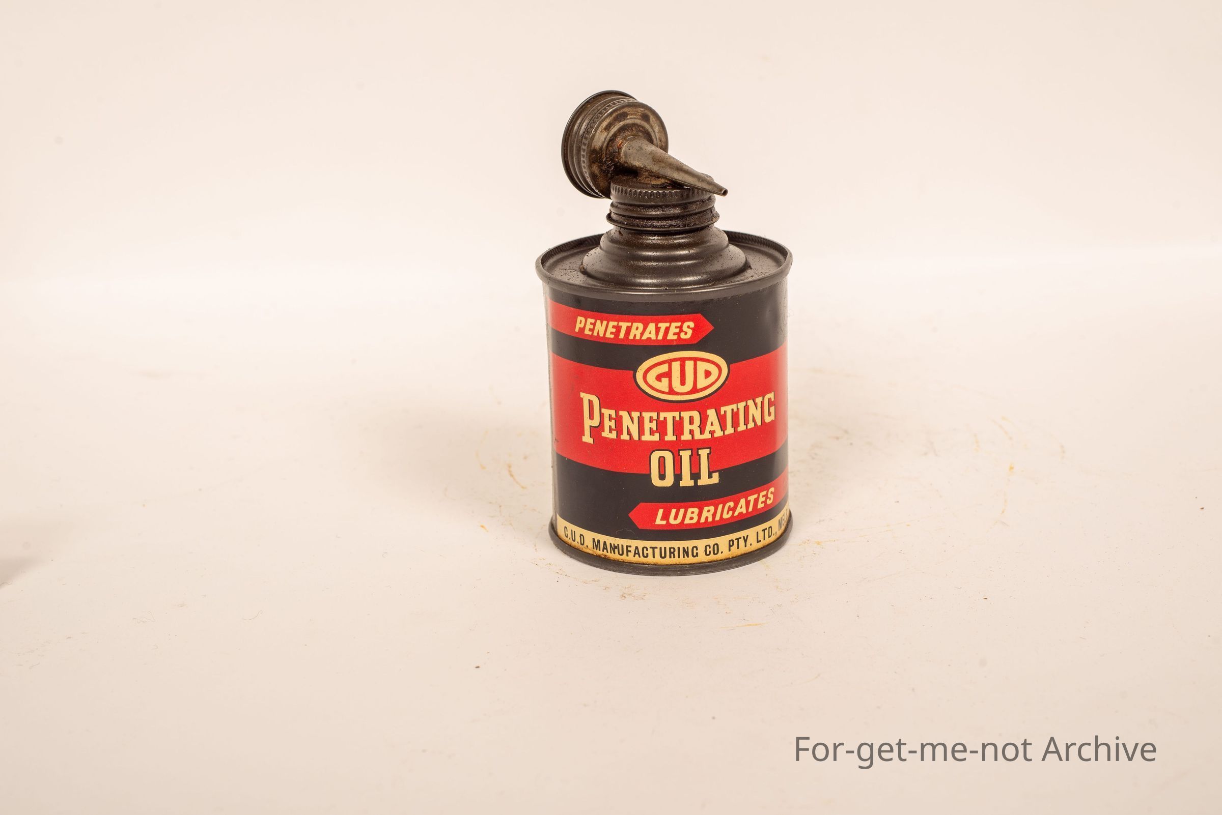 GUD product penetrating oil, penetrates and lubricates. GUD Manufacturing Melbourne. A pore attached to the lid. This thing is 6 fluid ounces and in very good order