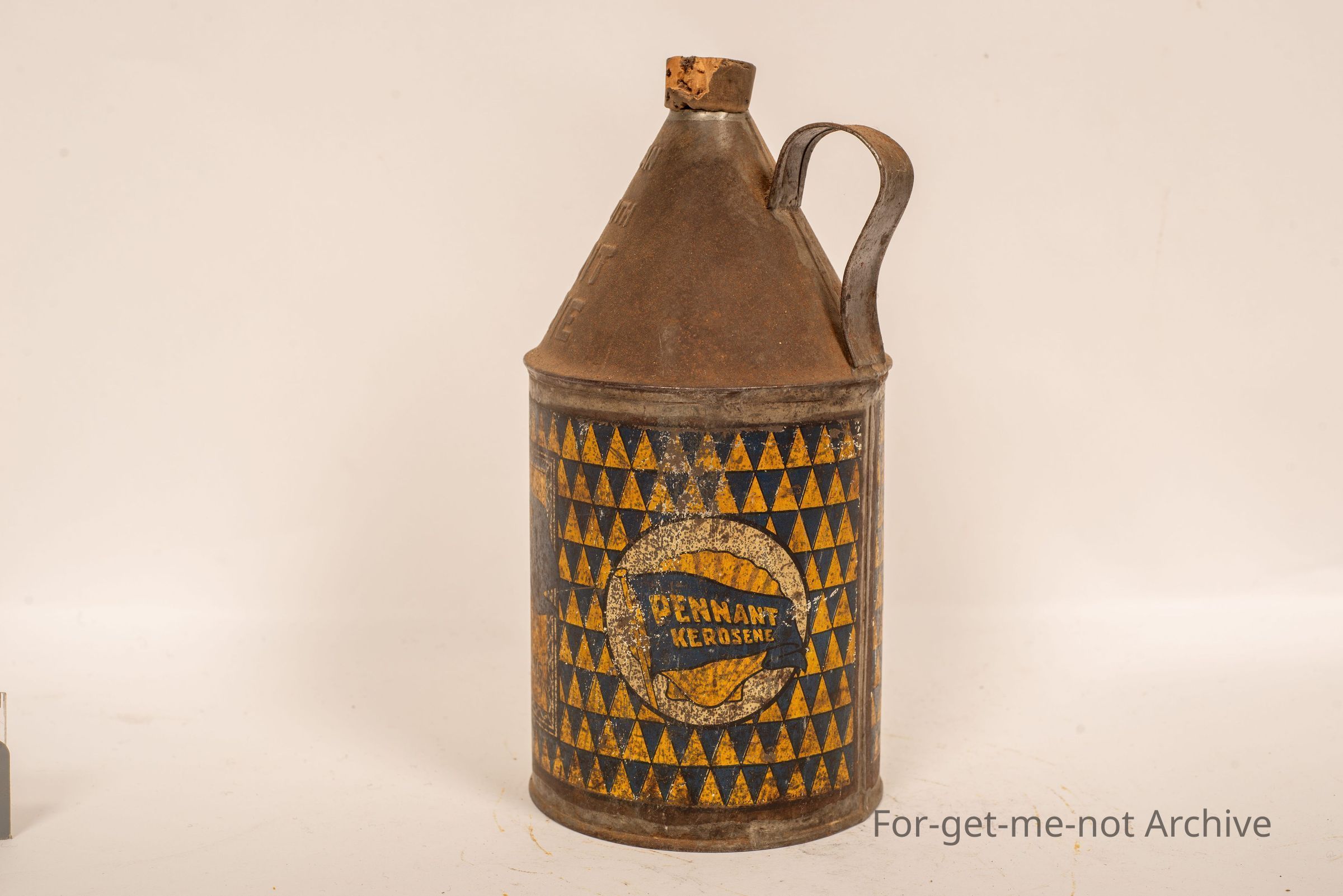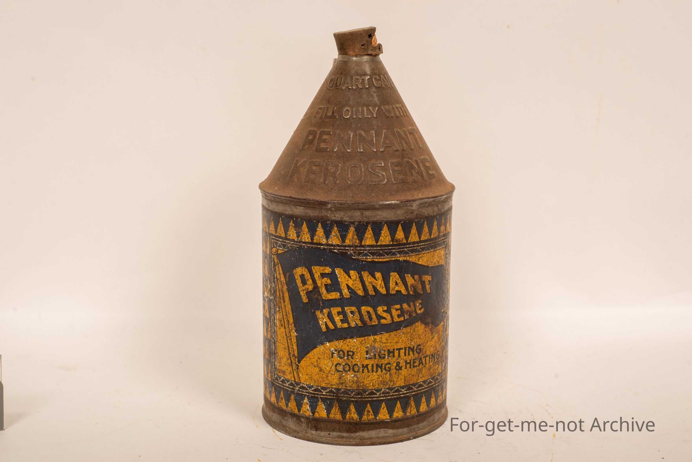 Pennant Kerosene, tin for lighting, cooking, heating. Embossed on the top is a quart can pennant Kerosene. This is very early.