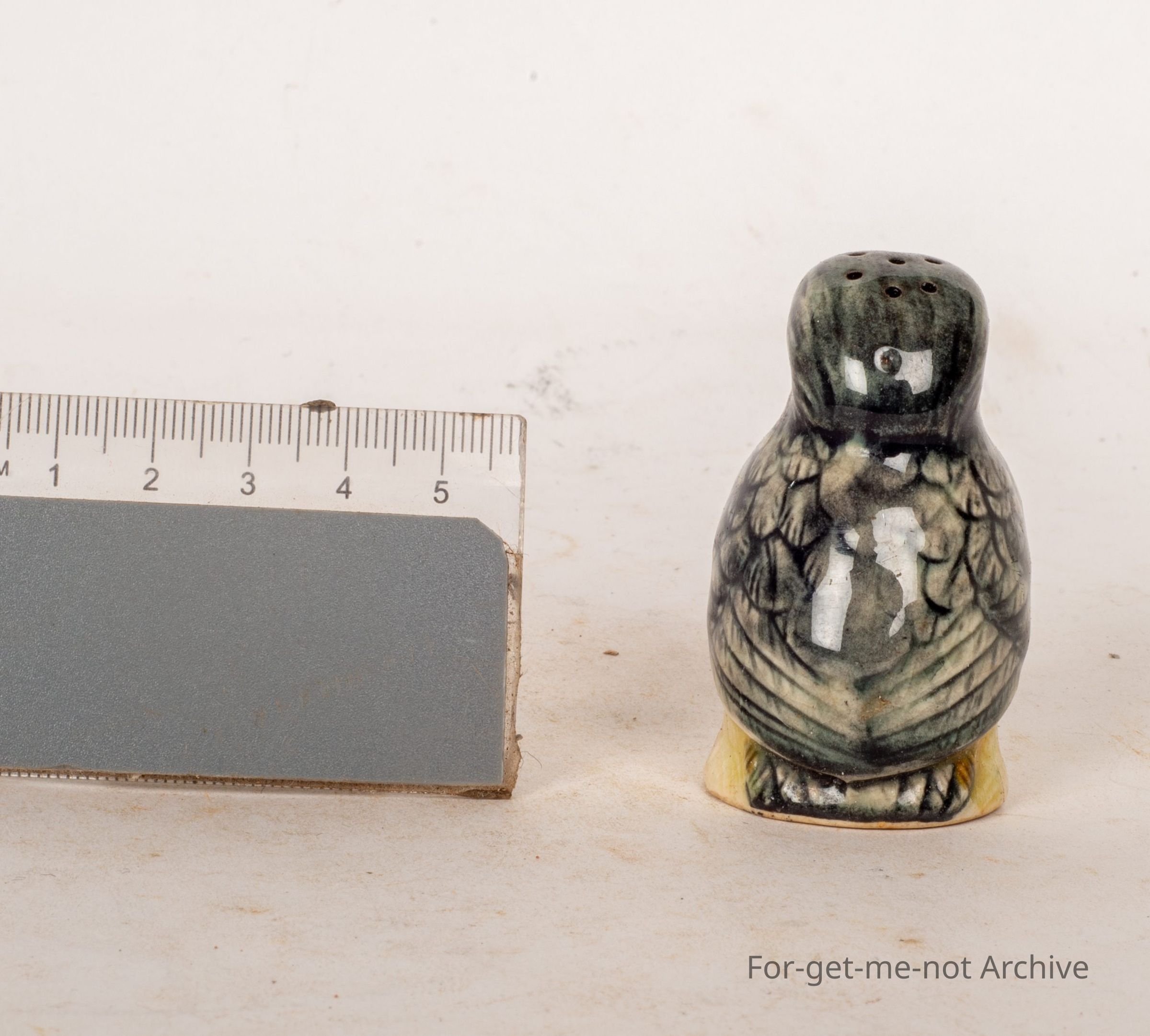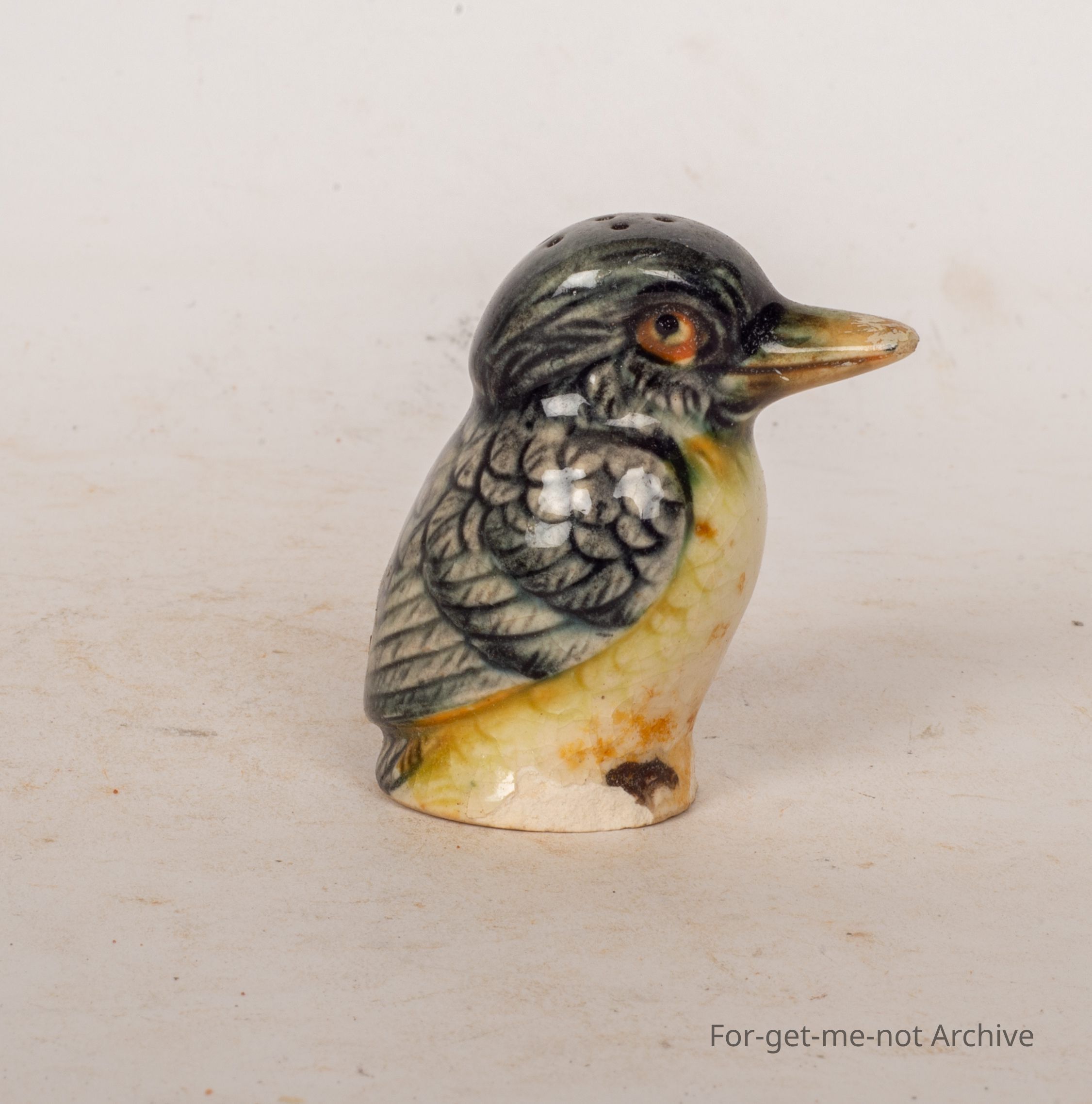 This is a little, pepper shaker in the shape of a kookaburra. Beautifully hand painted. Couple of chips at the bottom. Not extremely old, but quite a beautifully done thing.Collection