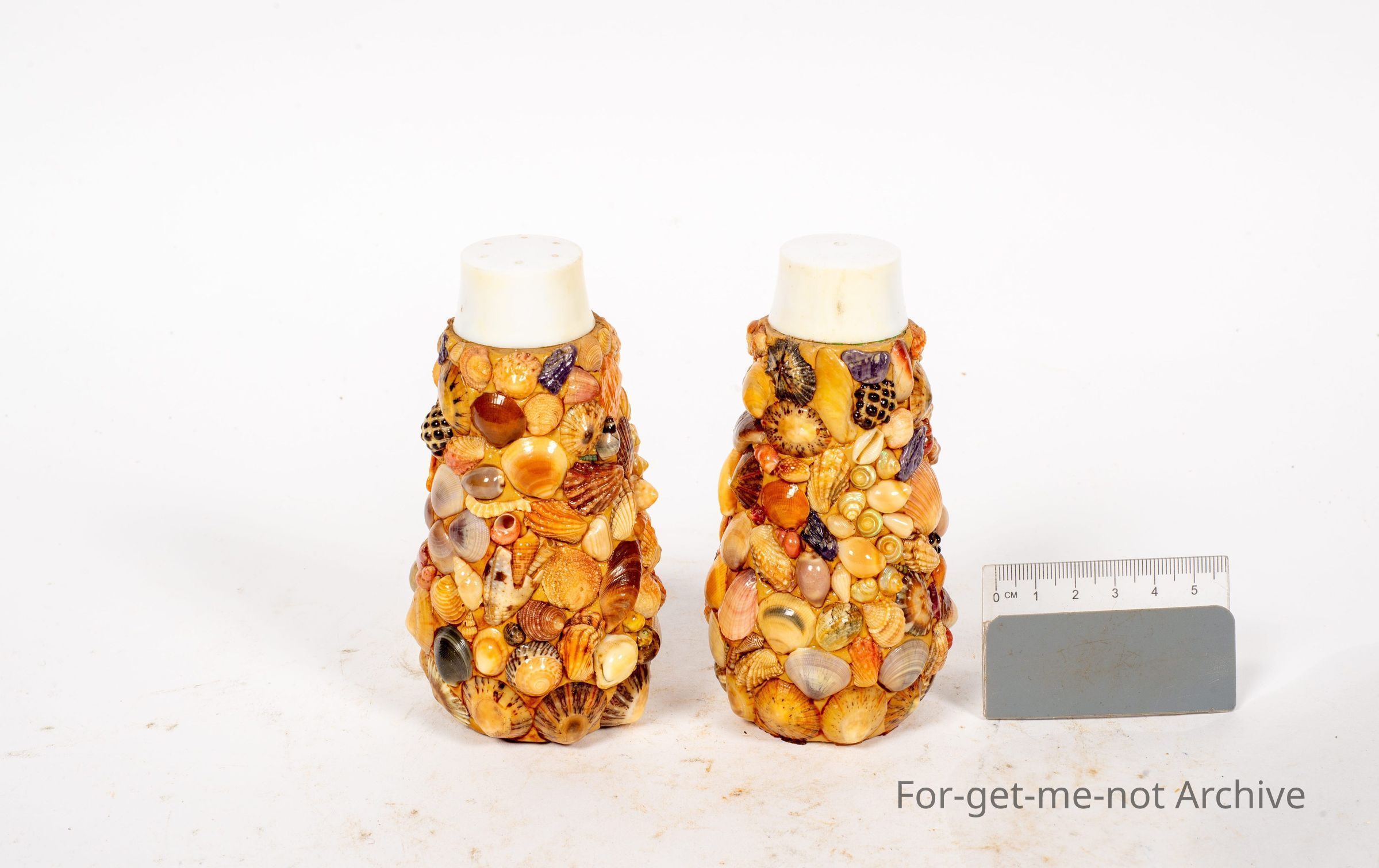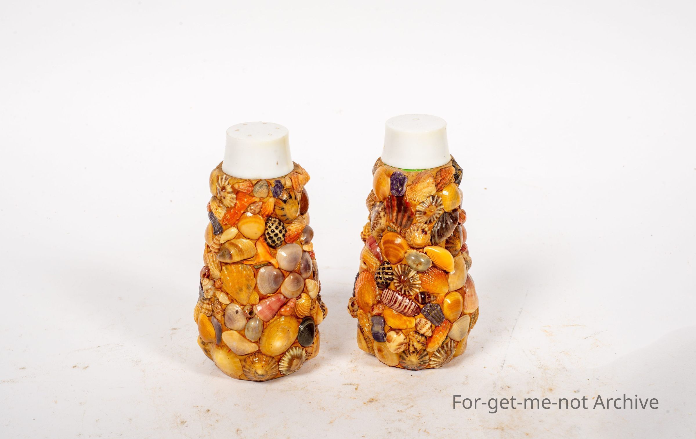Pair of salt and pepper shakers. There was a craft in using doing mosaics with shells. These are very good examples. Wide variety of shells, very skilfully done.