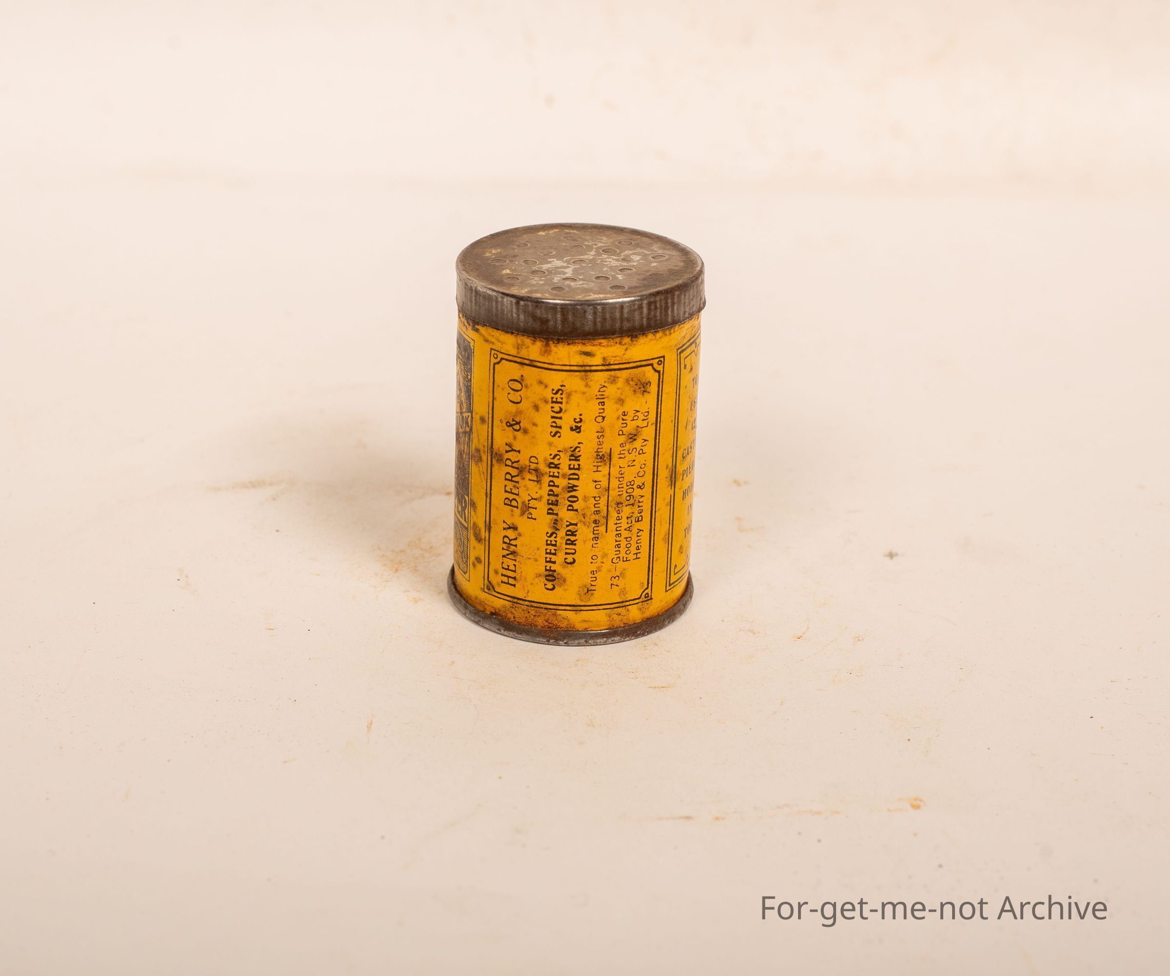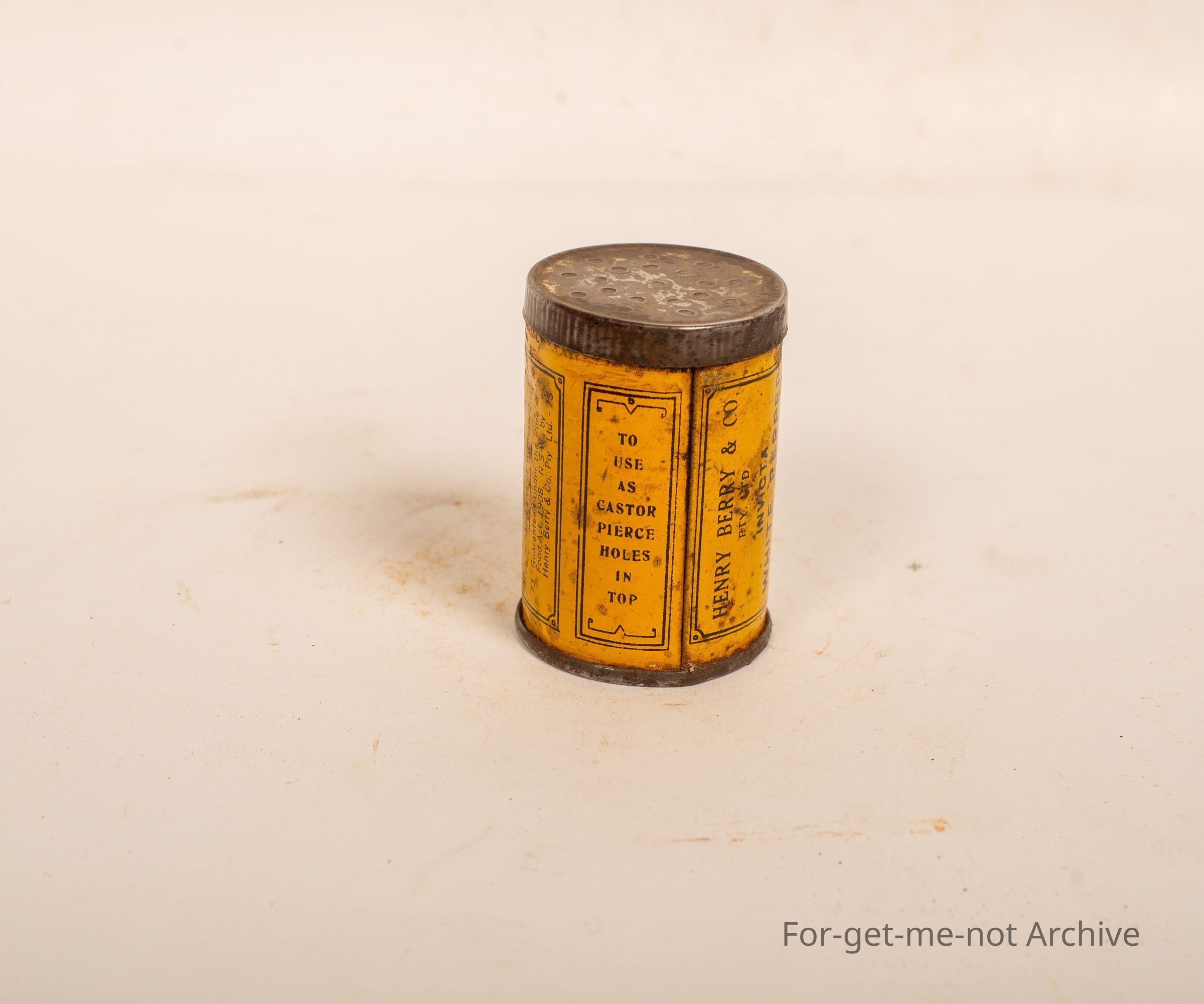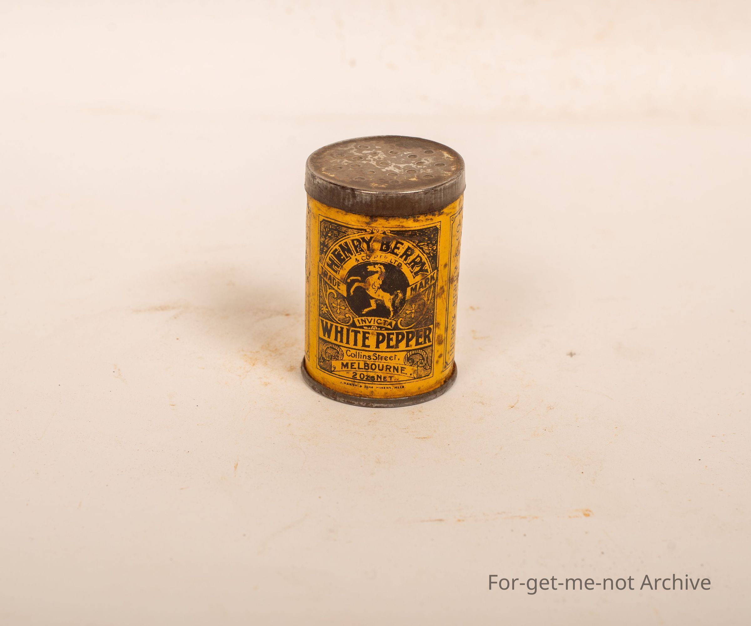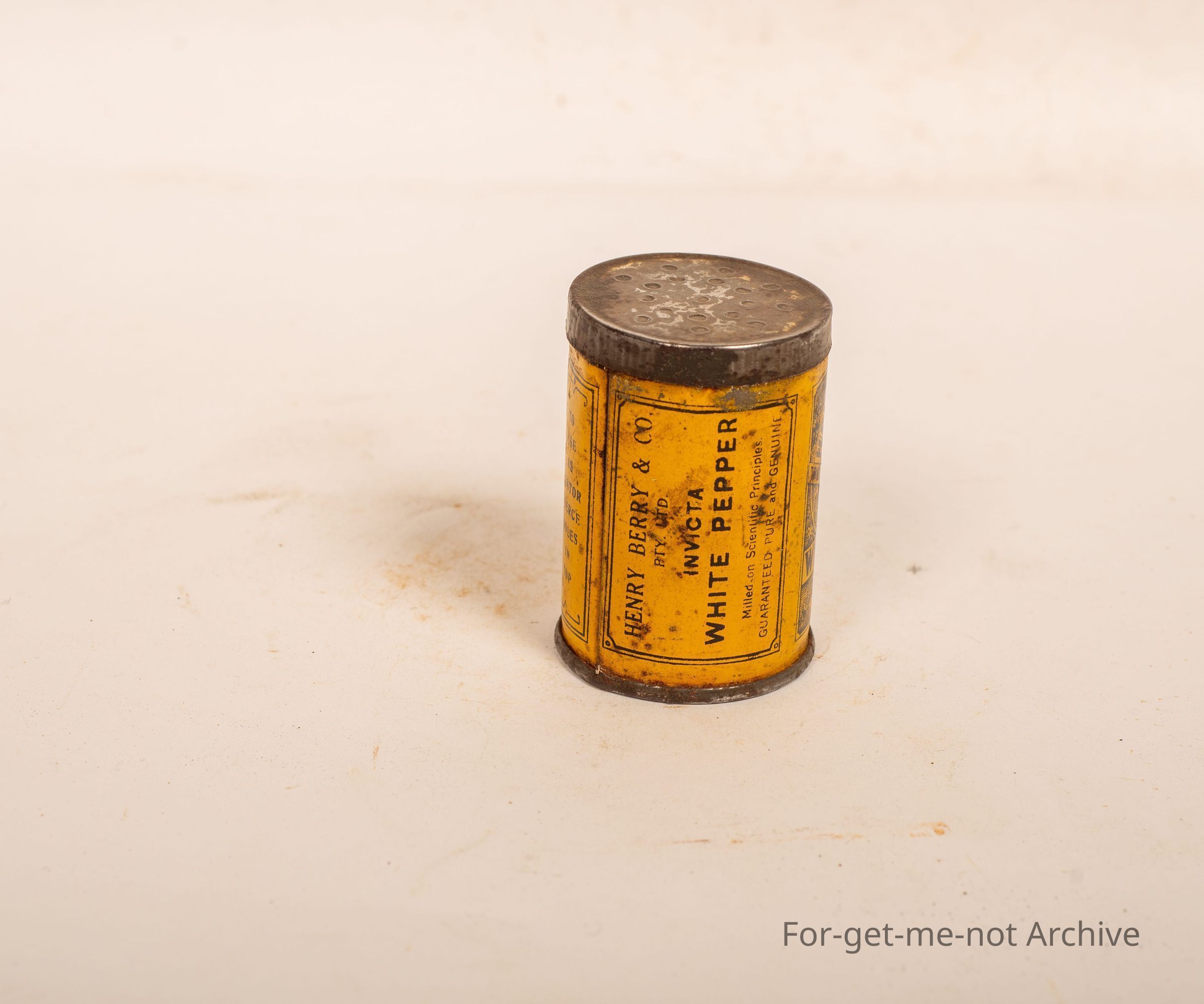 A tin of Henry Berry, white pepper, Invicta, name. Packed Collins Street, Melbourne, 2 ounces net. Lovely little tin. Quite early