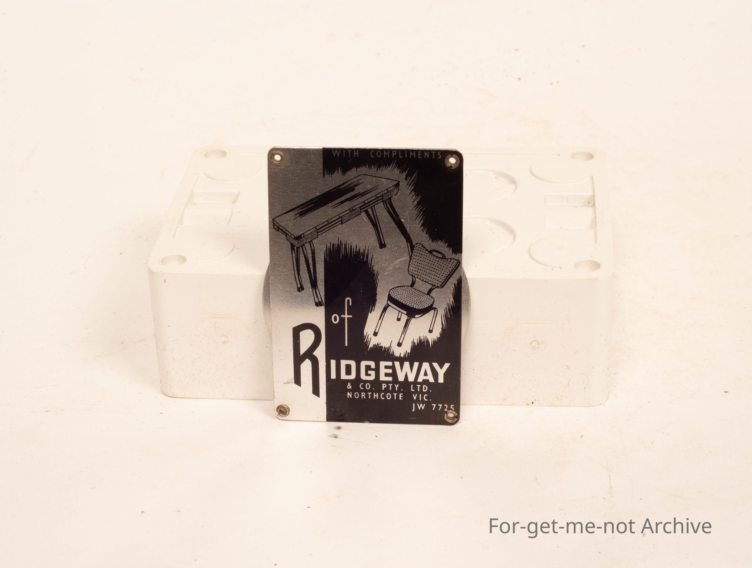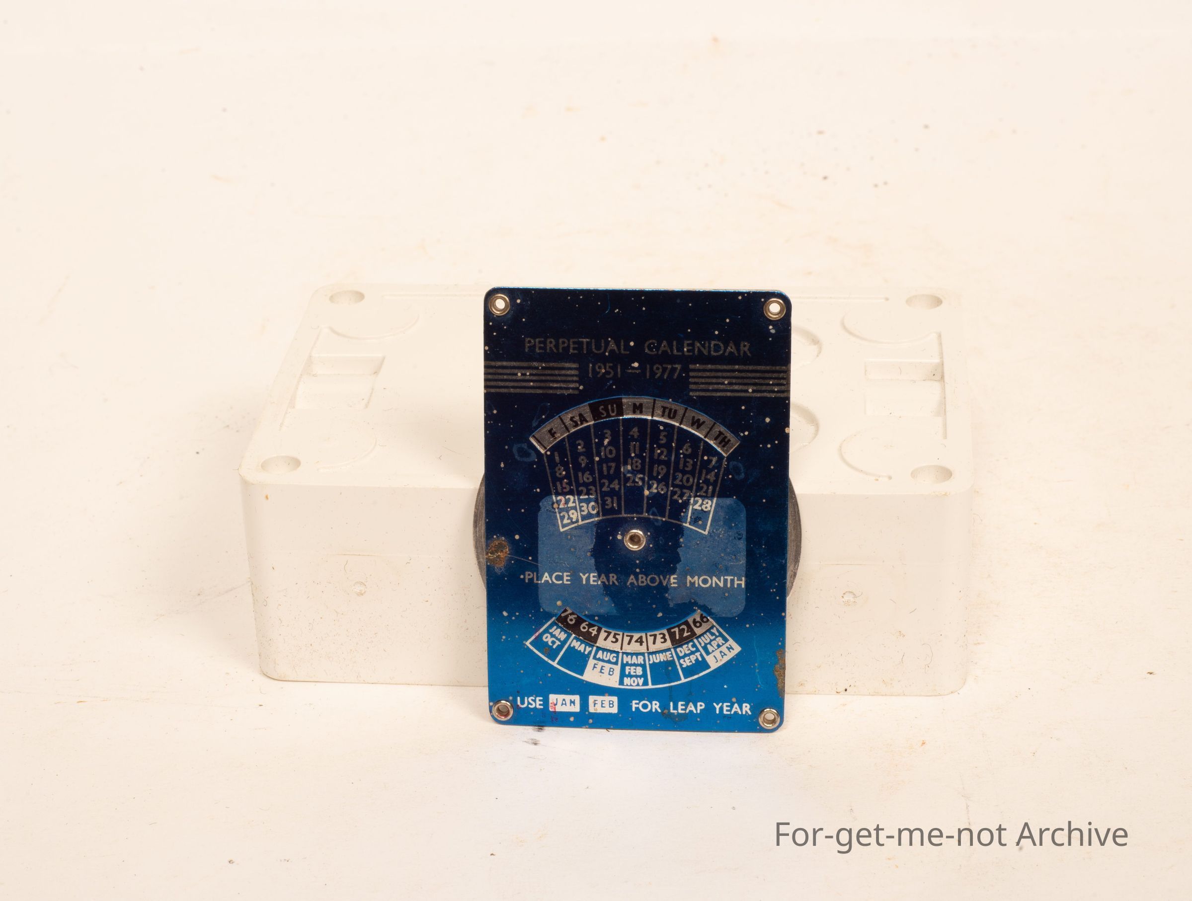 Perpetual Calendar, 1951 to 1977. Mentions use for leap year, advertising with compliments from Ridgeway and Co. Northcote Furniture Makers. Lovely early Melbourne piece.Collection
