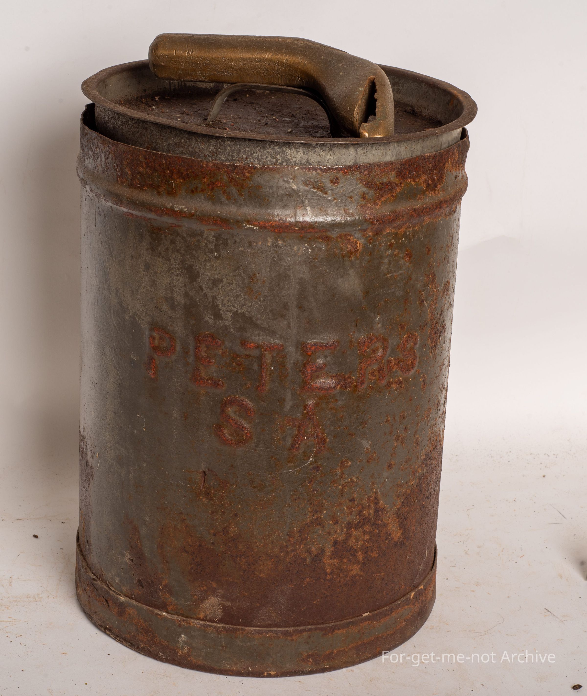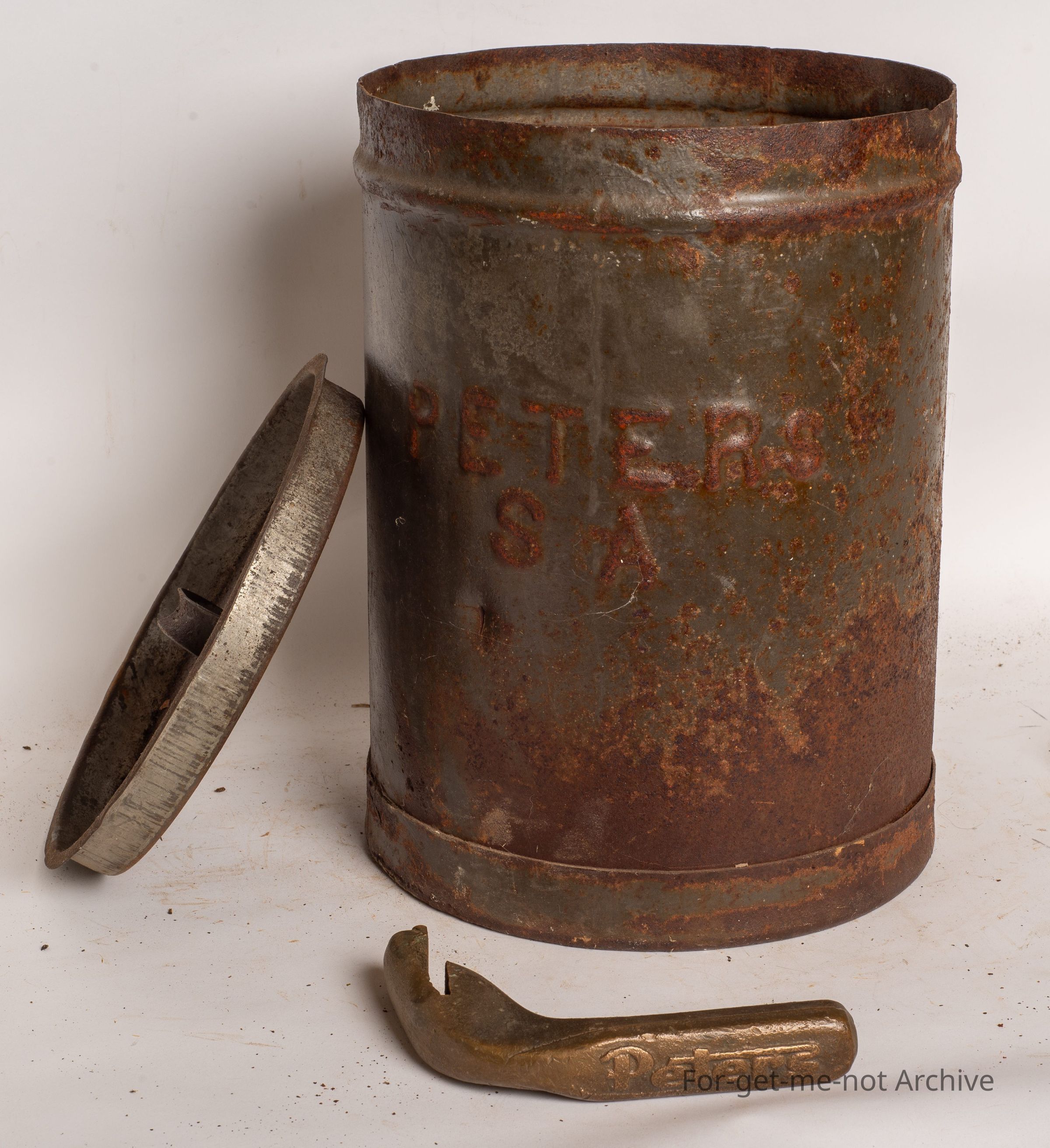 This is a half size can from Peter's ice cream when it was made in bulk. Has the lid and the Peter's ice cream brass handle, which attaches to the side of the can to lift with it.Collection