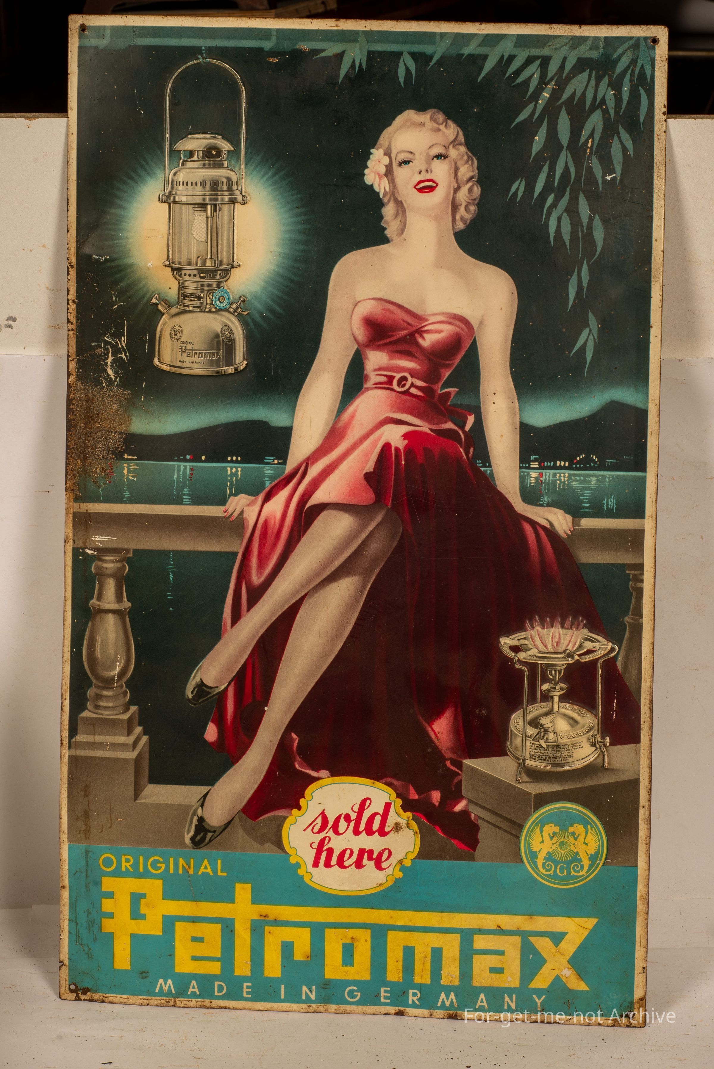 Sangeet Collection. This is a tin, Petromax sign. Beautiful graphics of a woman sitting in a lamp light. Images of pressure lamp. Made in Germany.