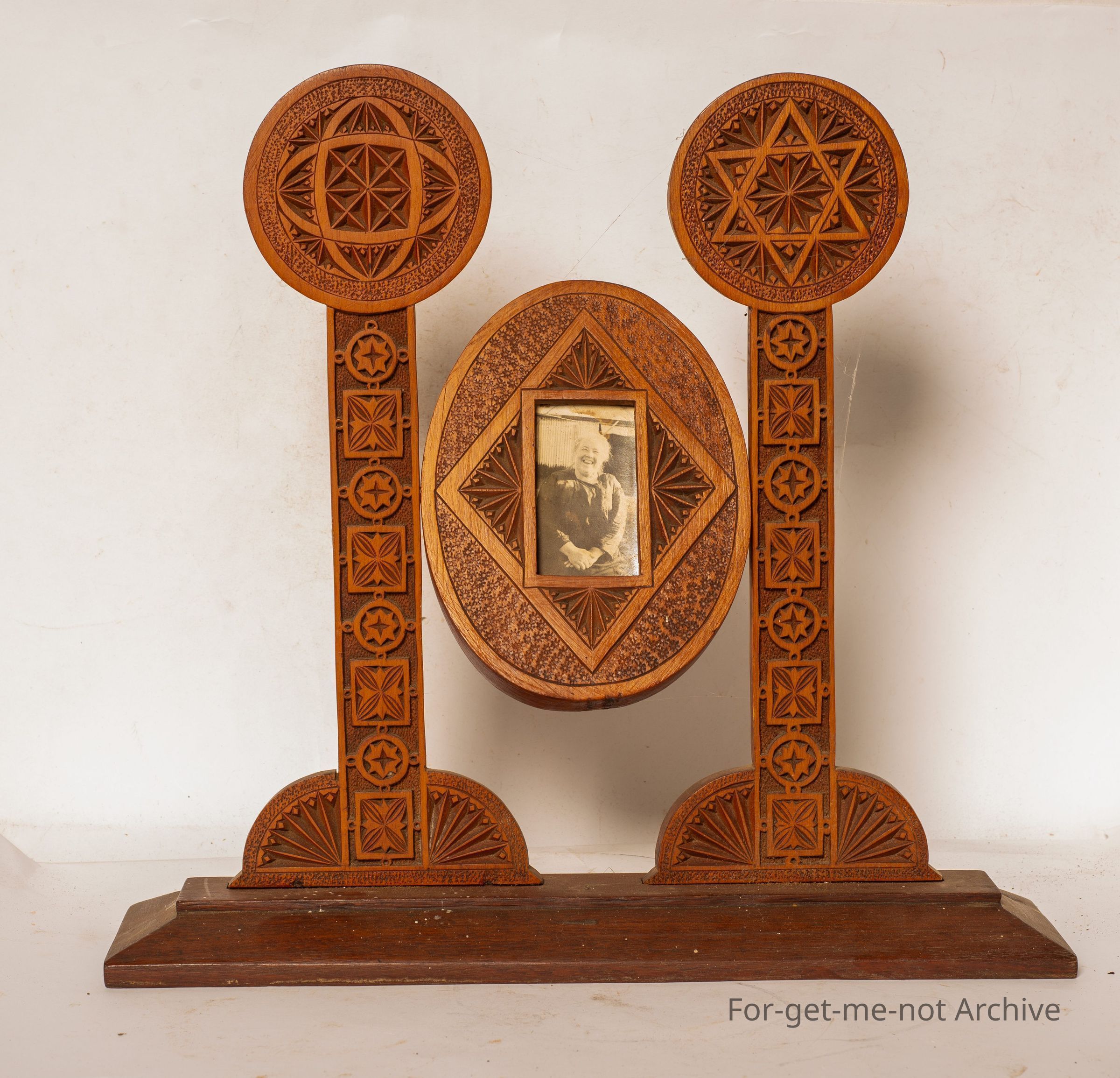 This is an example of chip craft, valuation. A glorious piece. This is studio standard. Very intricate work. It's 2 columns with 2 circular pieces on top. The base in the centre is a, small frame for a small photograph. This is a top quality piece. This was purchased in York, Western Australia.Collection