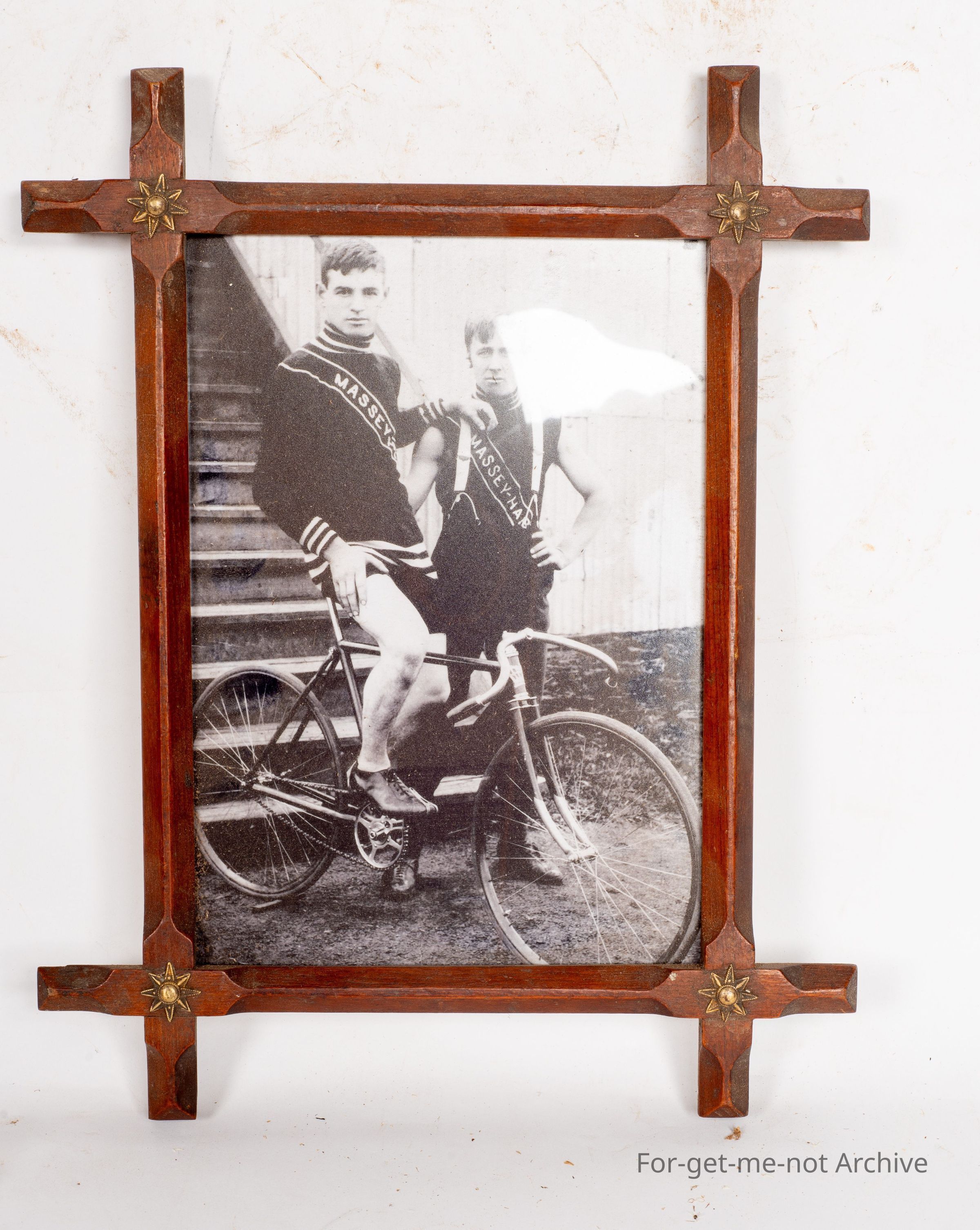 A cross corner colonial frame in beautiful condition with the little brass studs in each corner. The photograph is holding 2 bicycle riders advertising Massey Harris bikes from Canada. Lovely early piece. Clear photoCollection