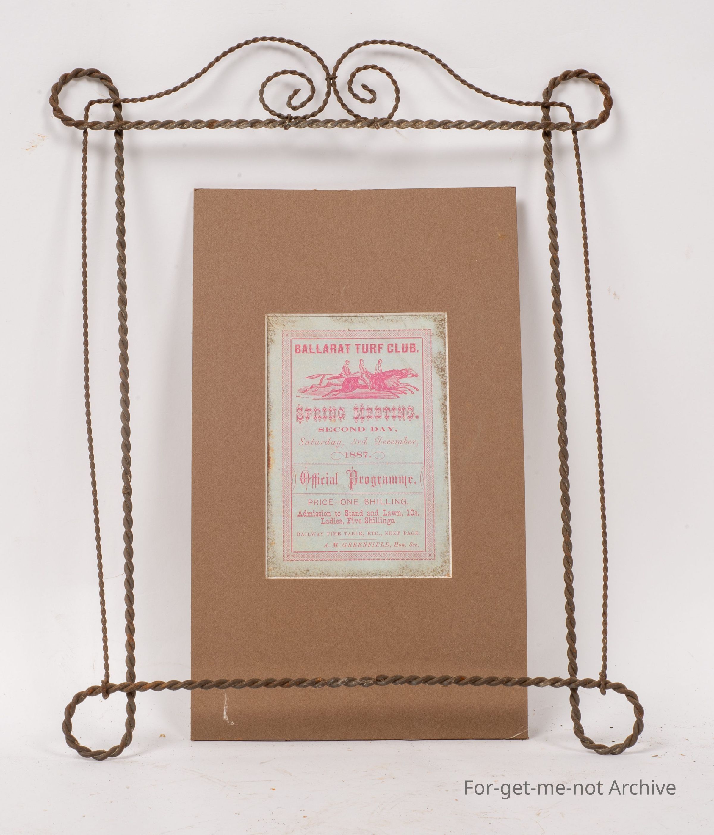 Another Depression era piece of beautiful wire work in the form of a picture frame. This one has a cardboard piece, with a photocopy of Ballarat Turf Club Spring Meeting 18/87.Collection