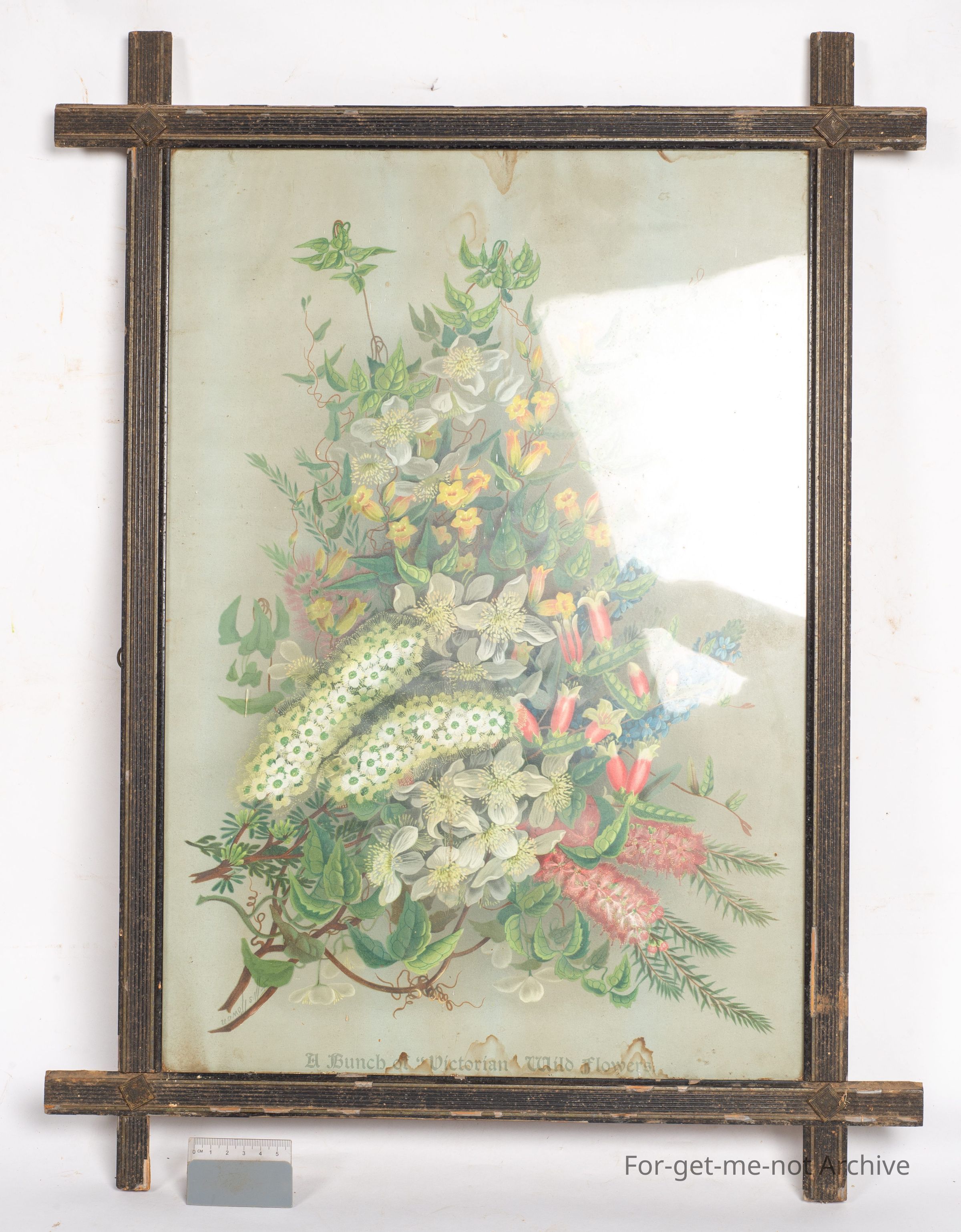 This is a colonial framed, print, I imagine, of wildflowers of Victoria. Quite good condition, bit of water damage at the top and the bottom, but still a lovely piece