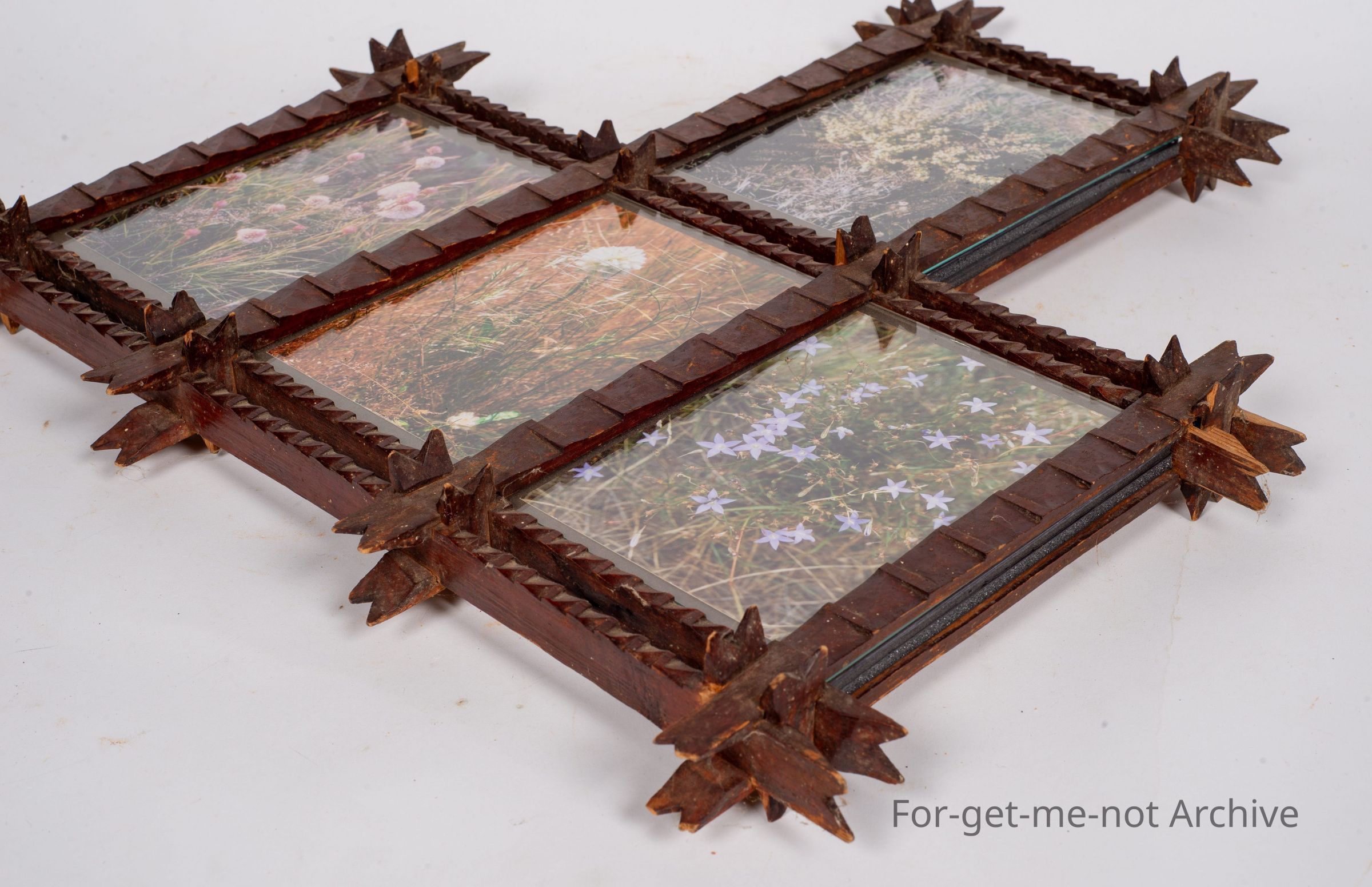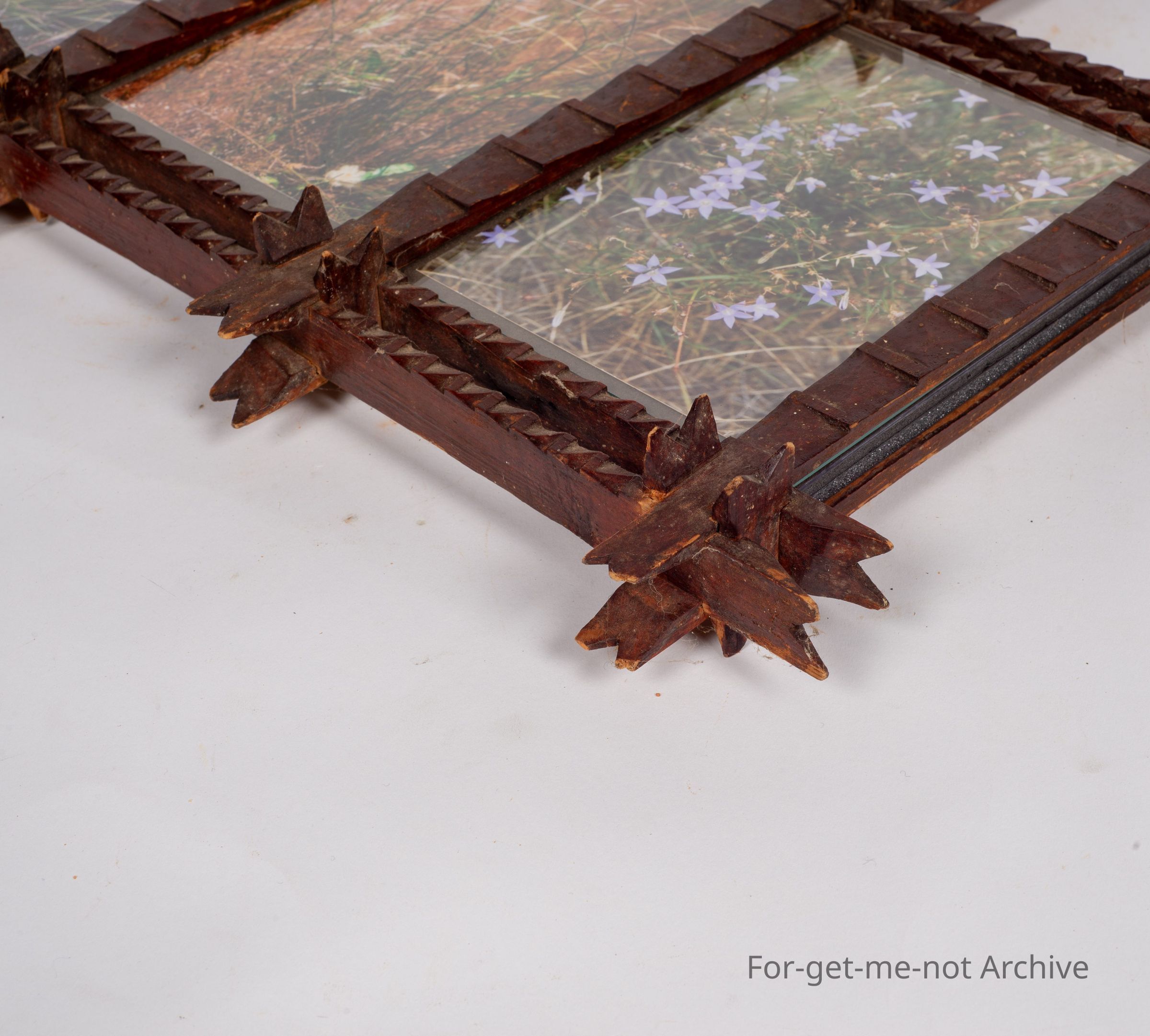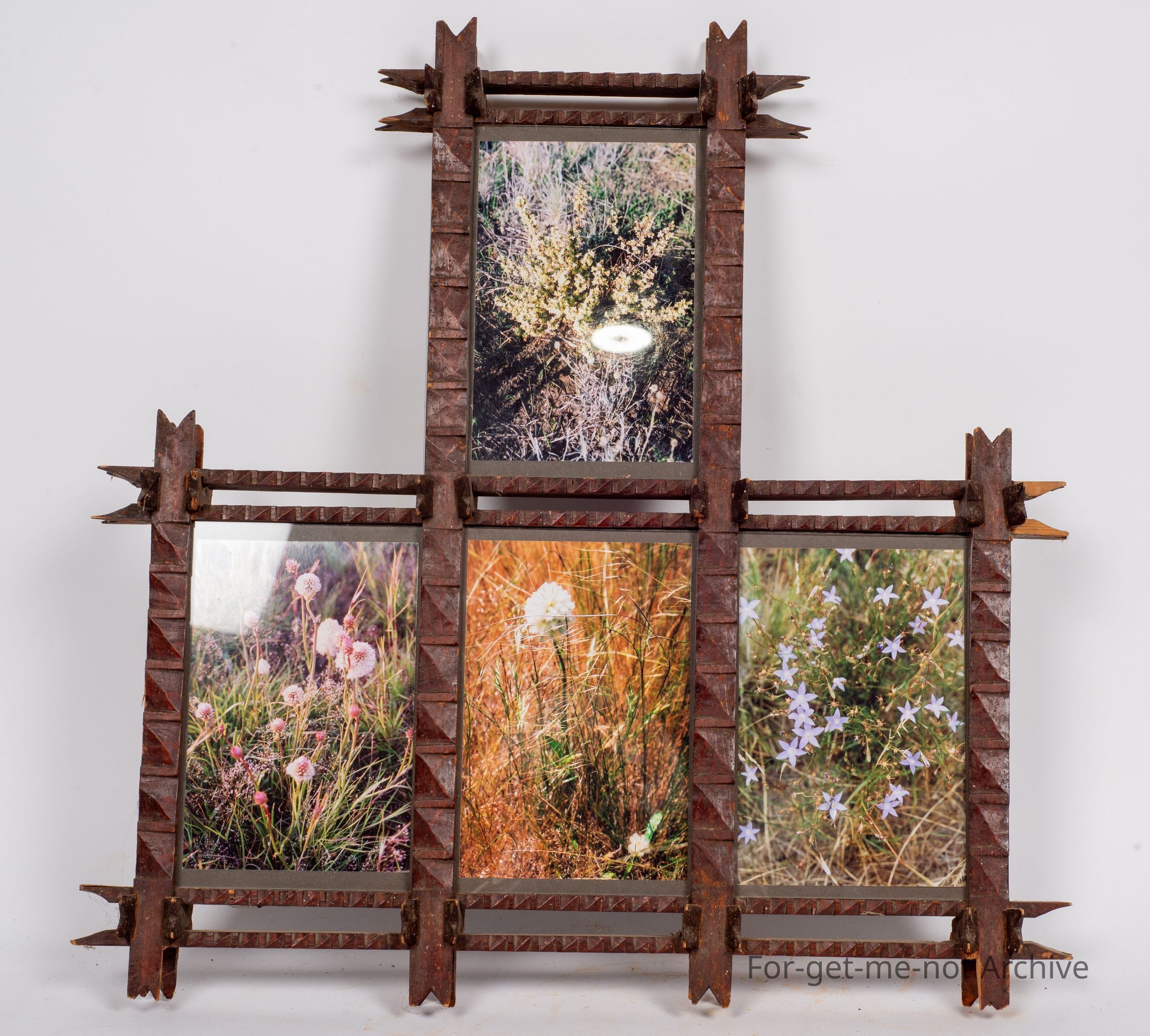Is a Tramp art Picture Frame divided into 4 separate sections. This is quite an early piece. There are photographs of native vegetation in each piece. Fire Lotus, Blue Bell and Primelia.Collection