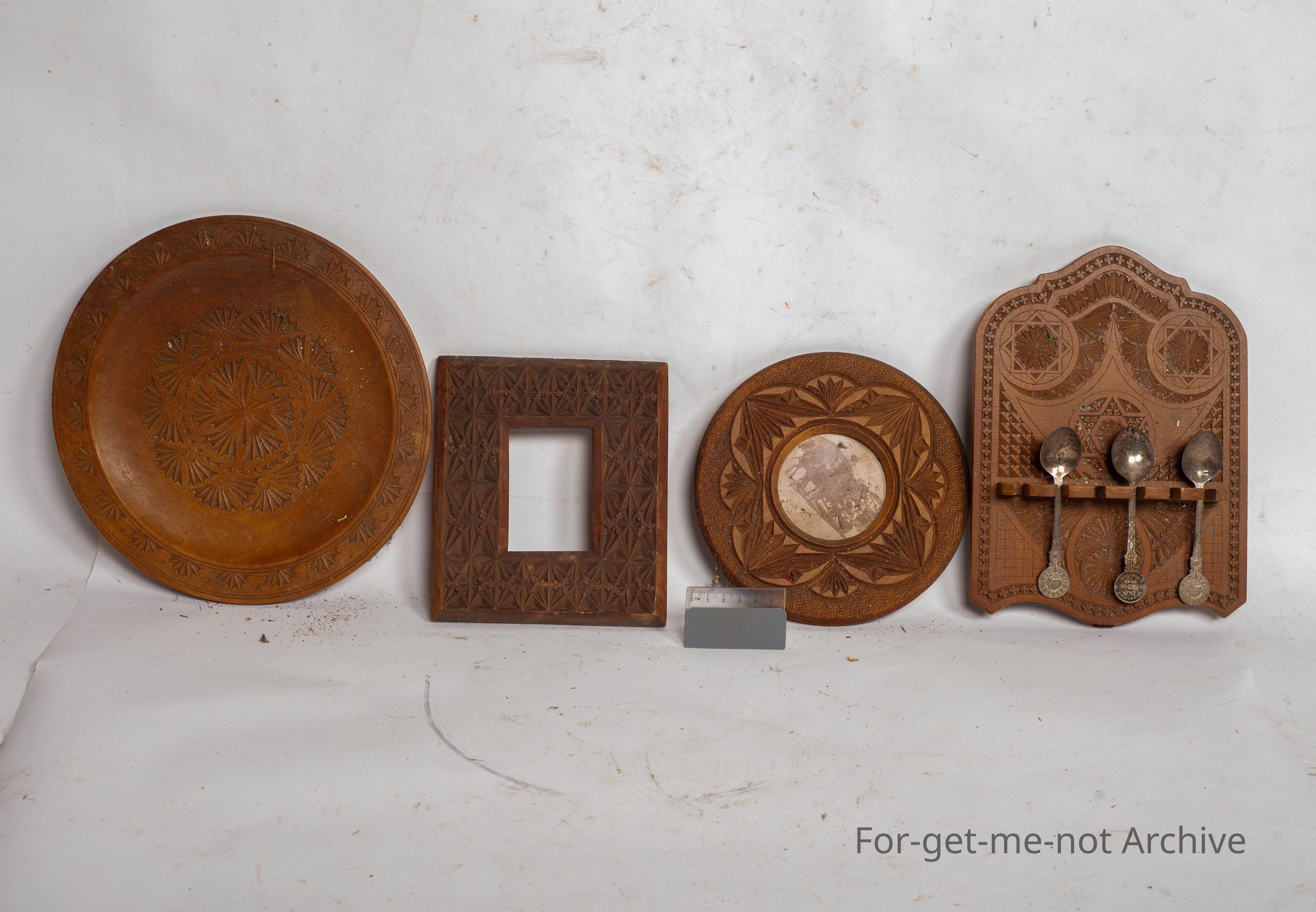 These are 4 small pieces of chip craft. 1 of a nice bowl, other 1 teaspoon holder. The other 2 picture frames, all in good order and quite decoratively done.
