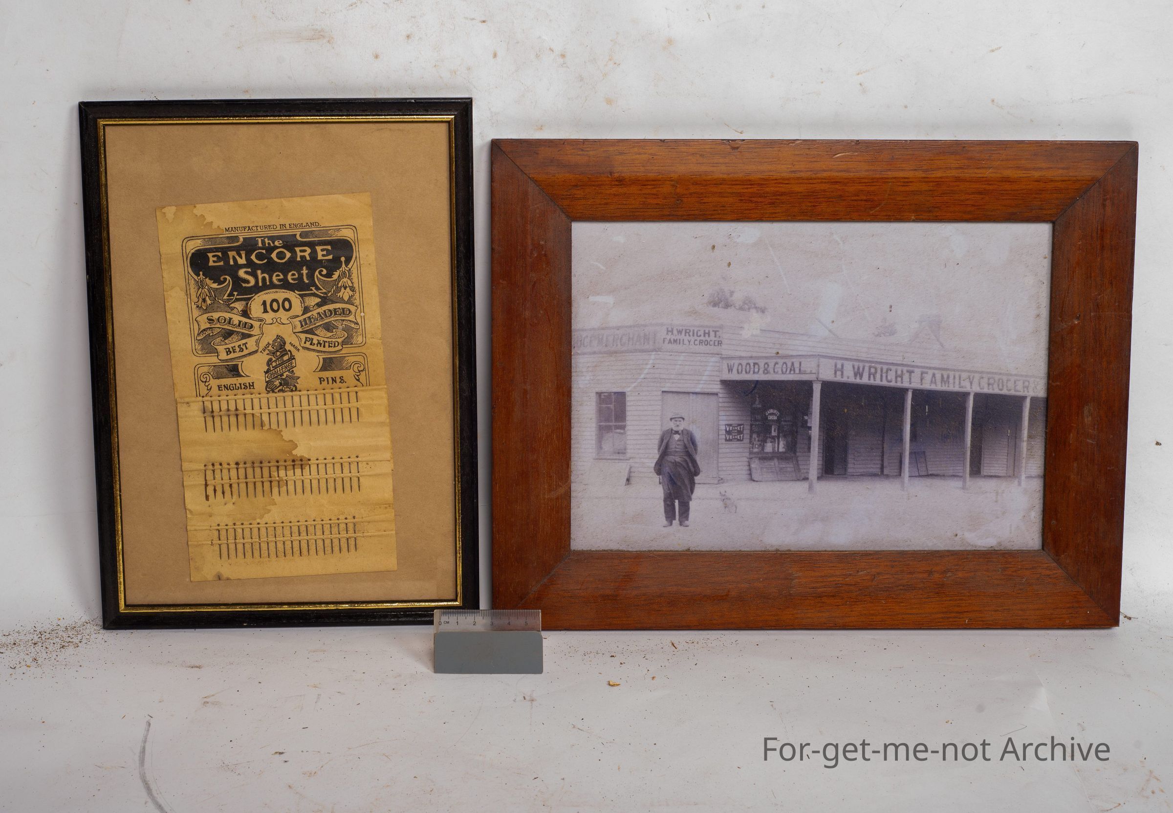 2 wooden frames, one featuring the old white grocery store in Ballarat, the other one, advertising, a sheet of encore needles.