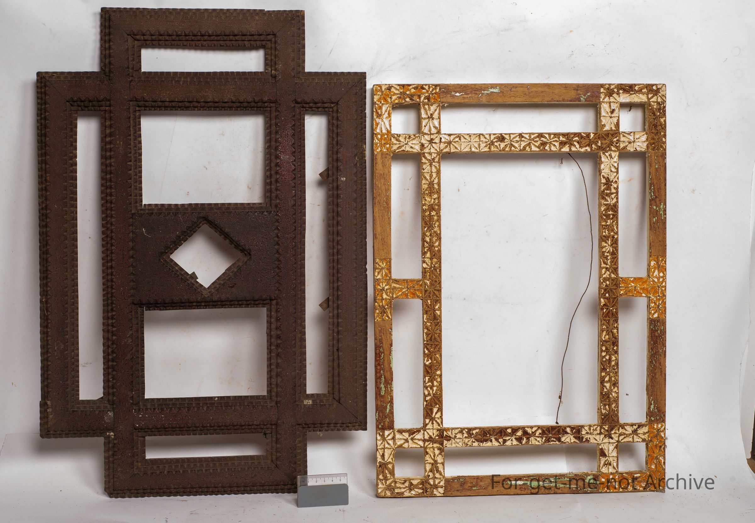 2 picture frames, 1 of chip craft, the other one trampart, both just in the form of, not having glass or photographs.