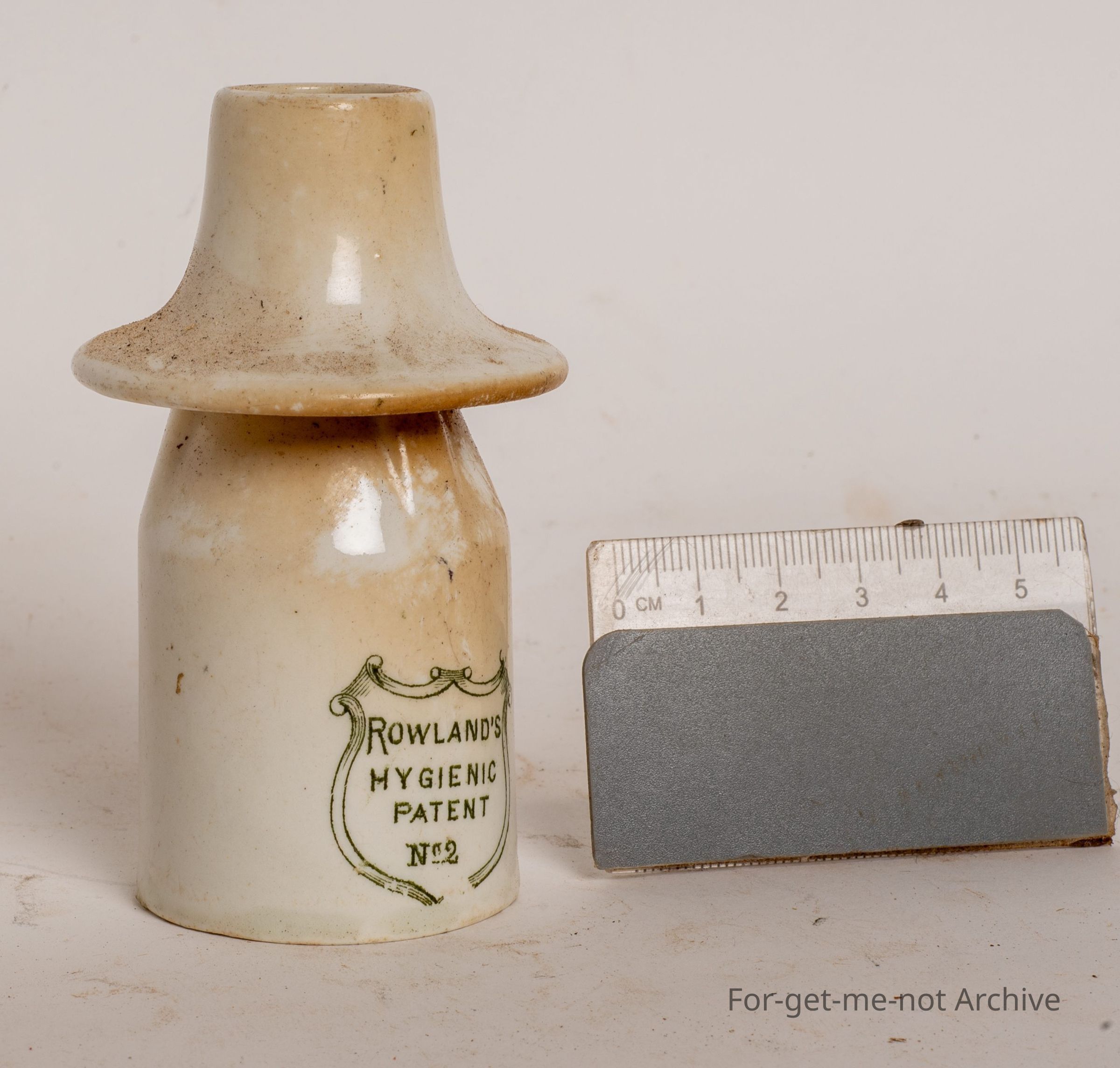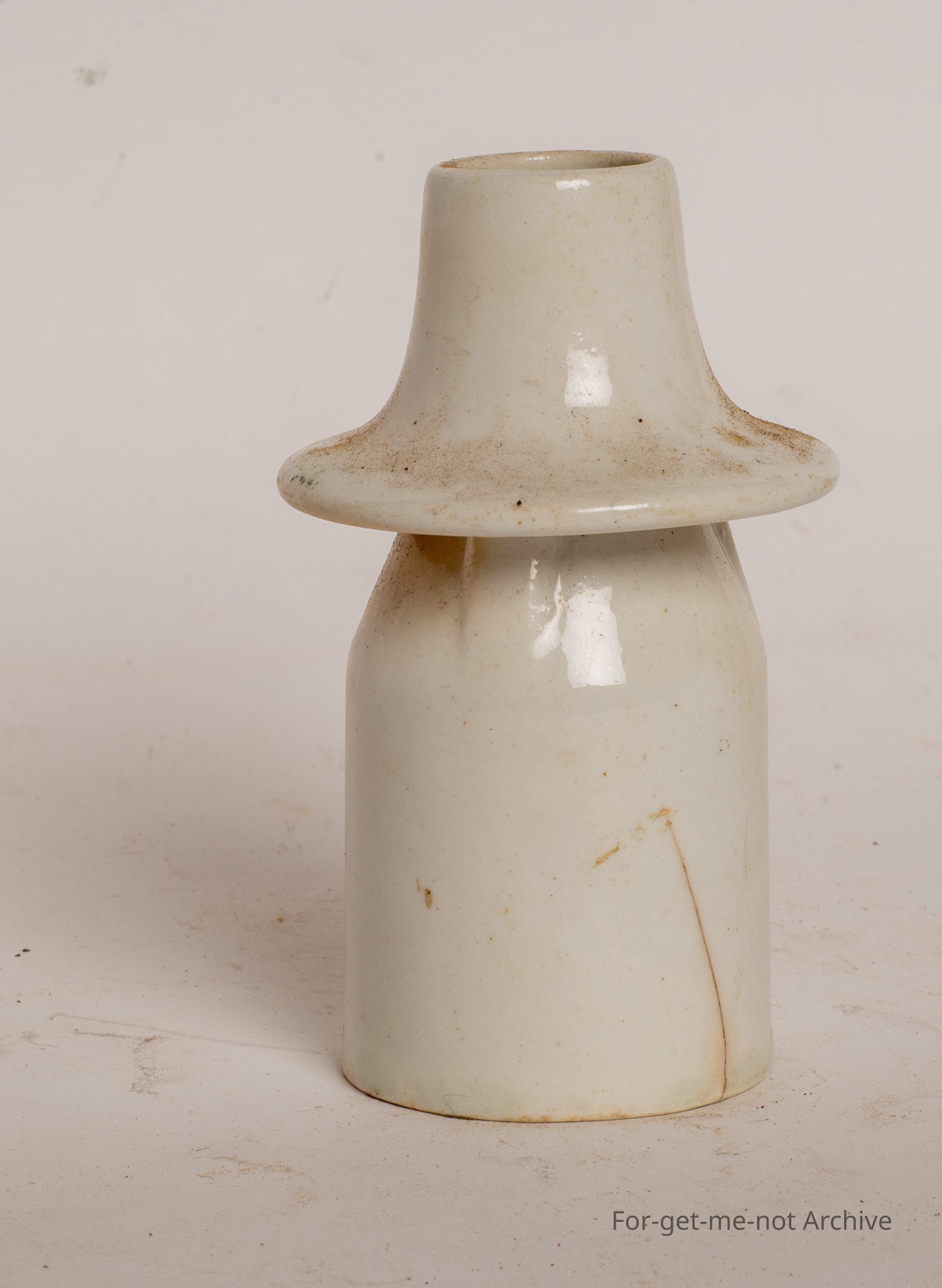 This is a ceramic pie funnel. Has an ink stamp of Rawlins hygienic patent number 2. Nice little piece. Does have a crack.