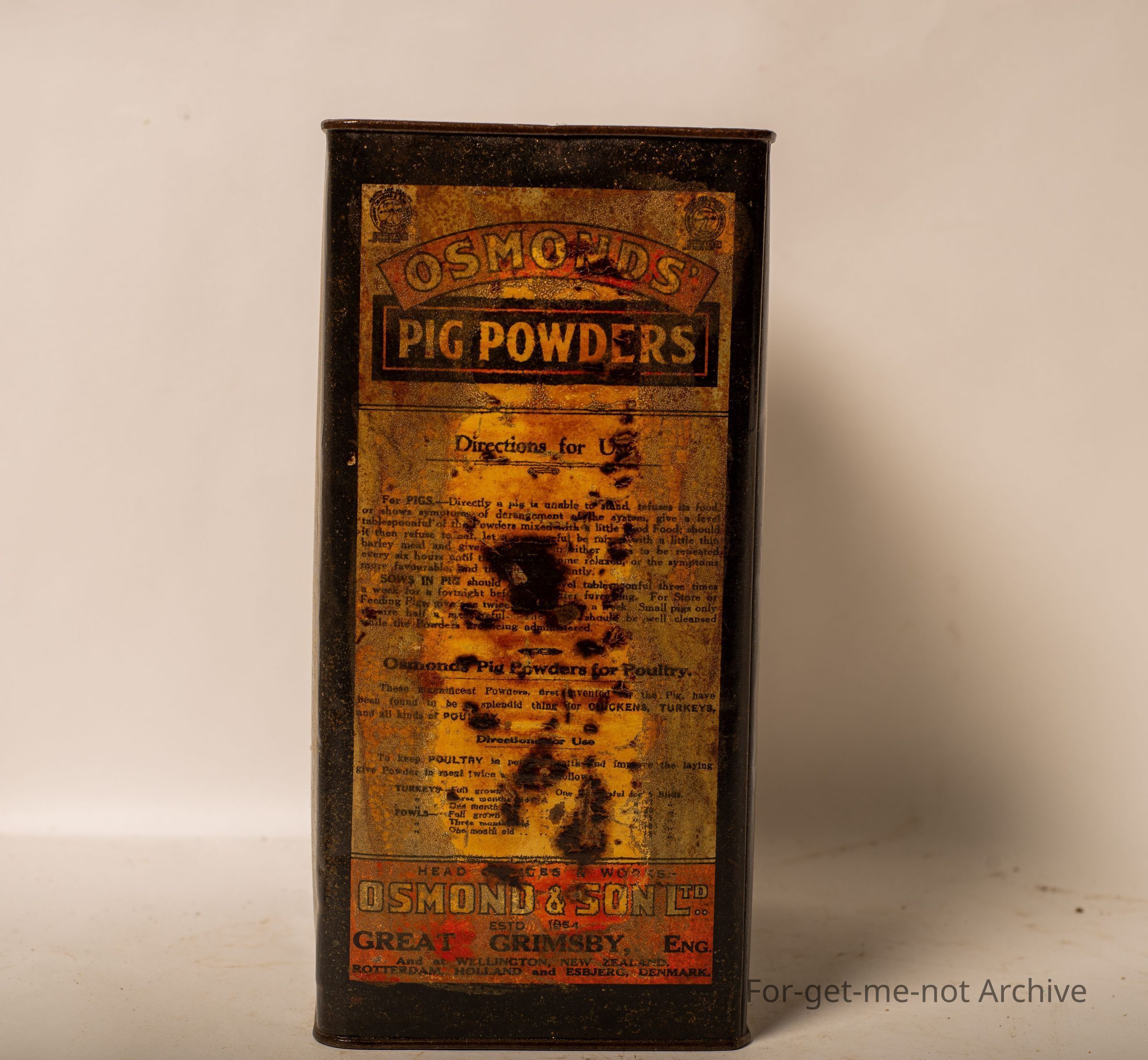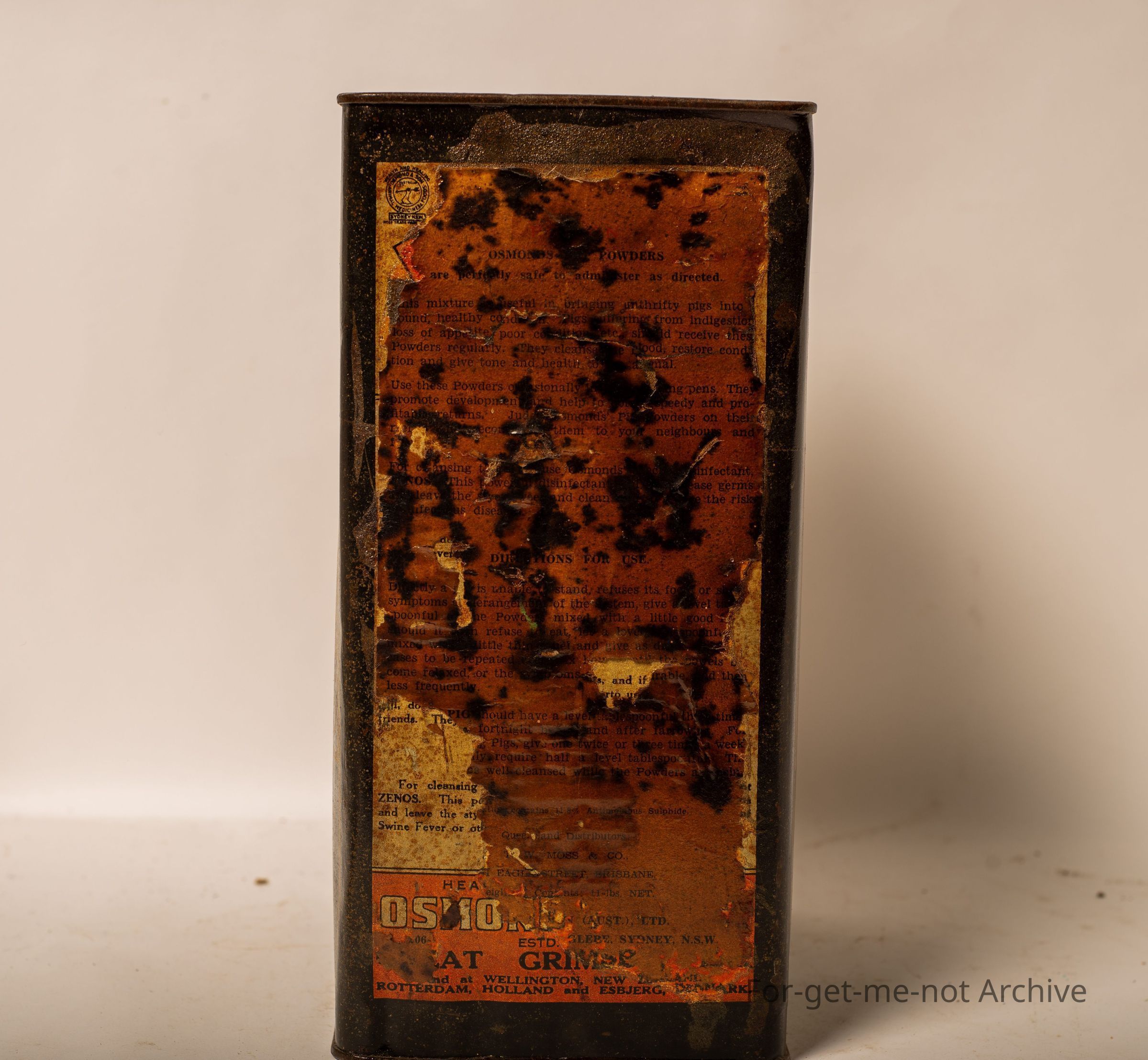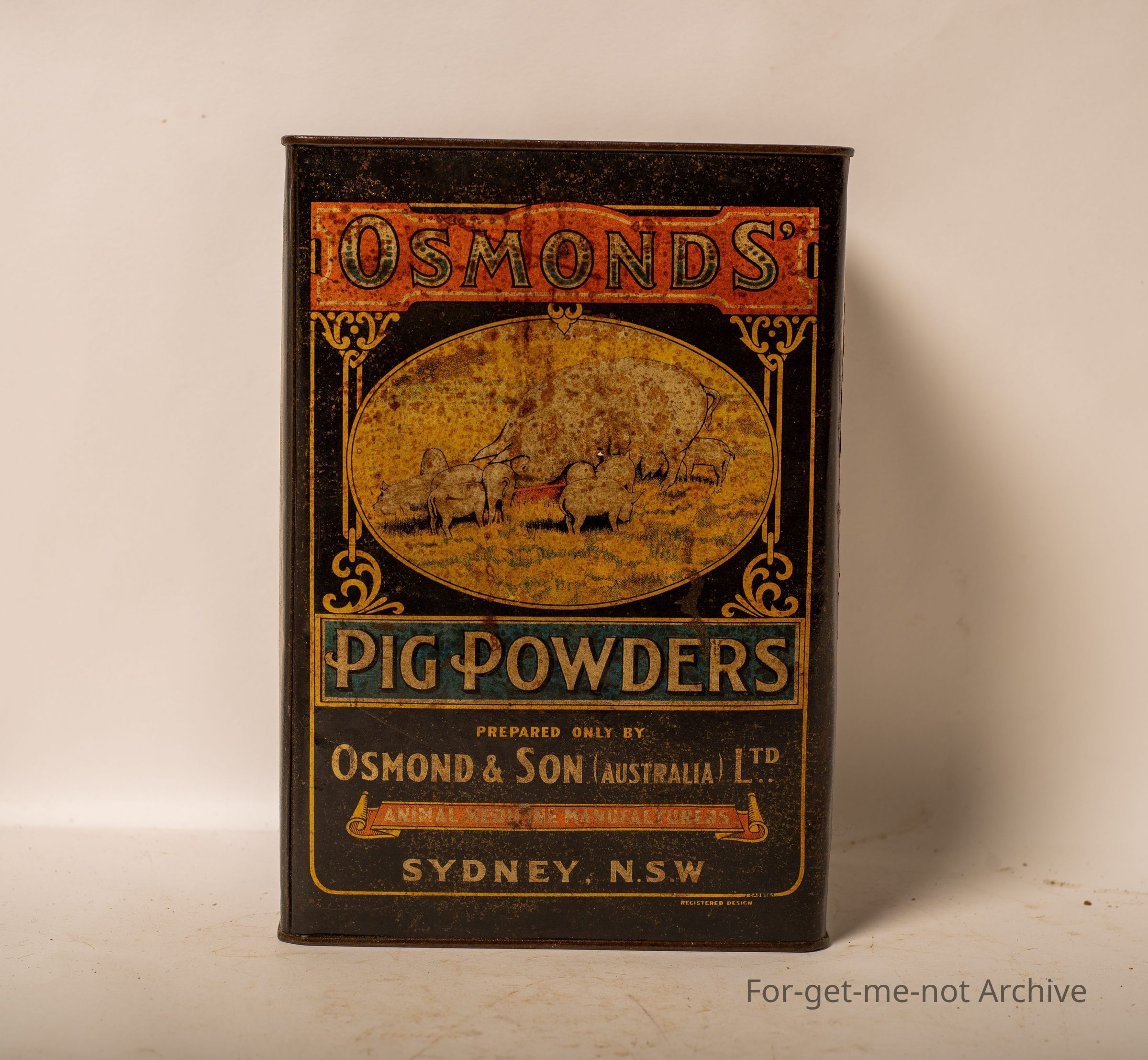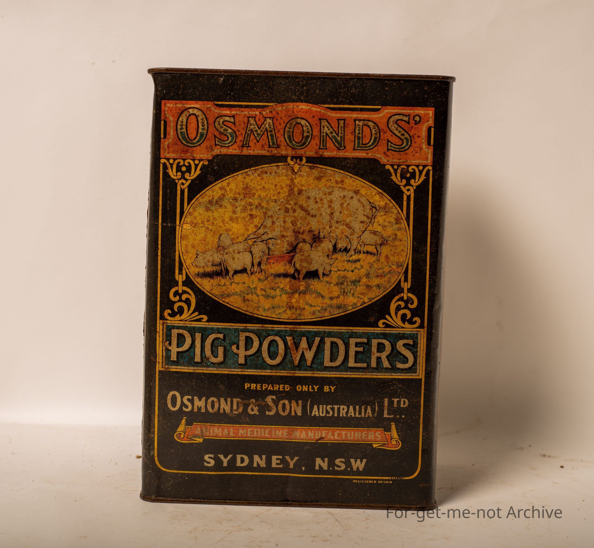 A 1 gallon tin of Osmonds pig powders, prepared by Osmonds and Son, Sydney, New South Wales. Quite nice graphics. Probably in reasonable order for the tin.