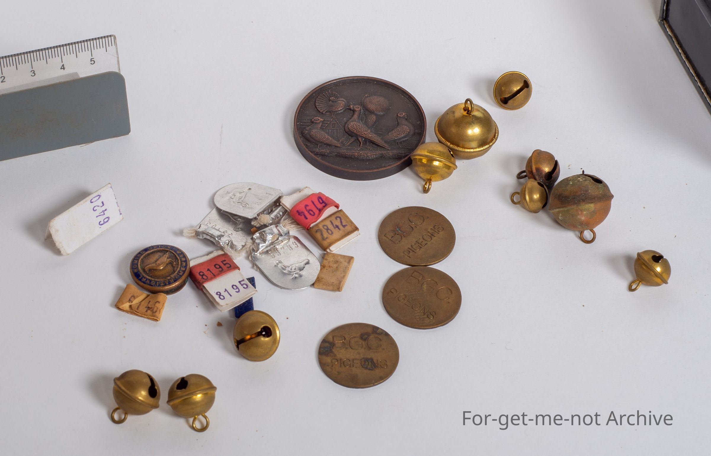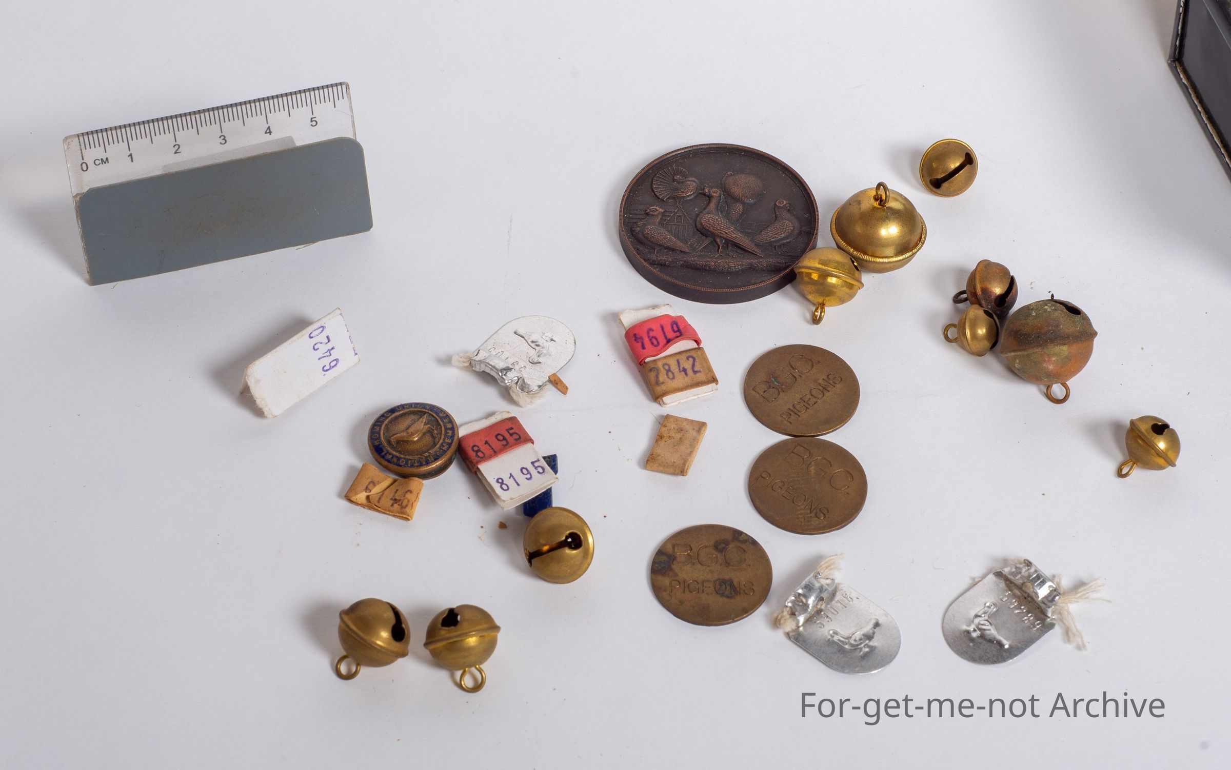 Pigeon racing, This is odds and ends related to pigeons with, the racing, lead band which was rubber and slipped on and off, or put on at departure and slipped off on arrival, couple of brass discs possibly from a bird show for pigeons, numerous pigeon related itemsCollection
