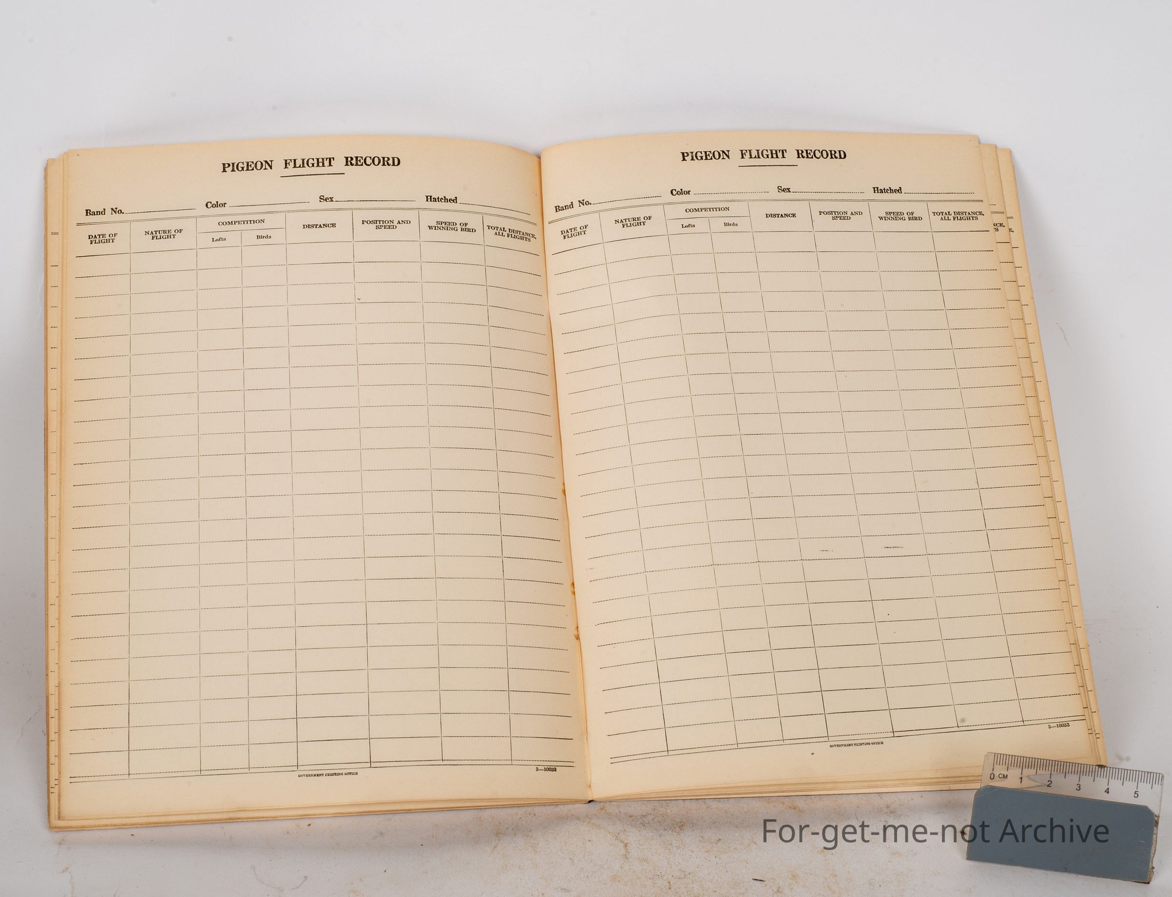 This is a book called The Pigeon Flight Record, which records the, time of release and the time of arrival. Very important document for pigeon racing. Never been used in very good condition.Collection