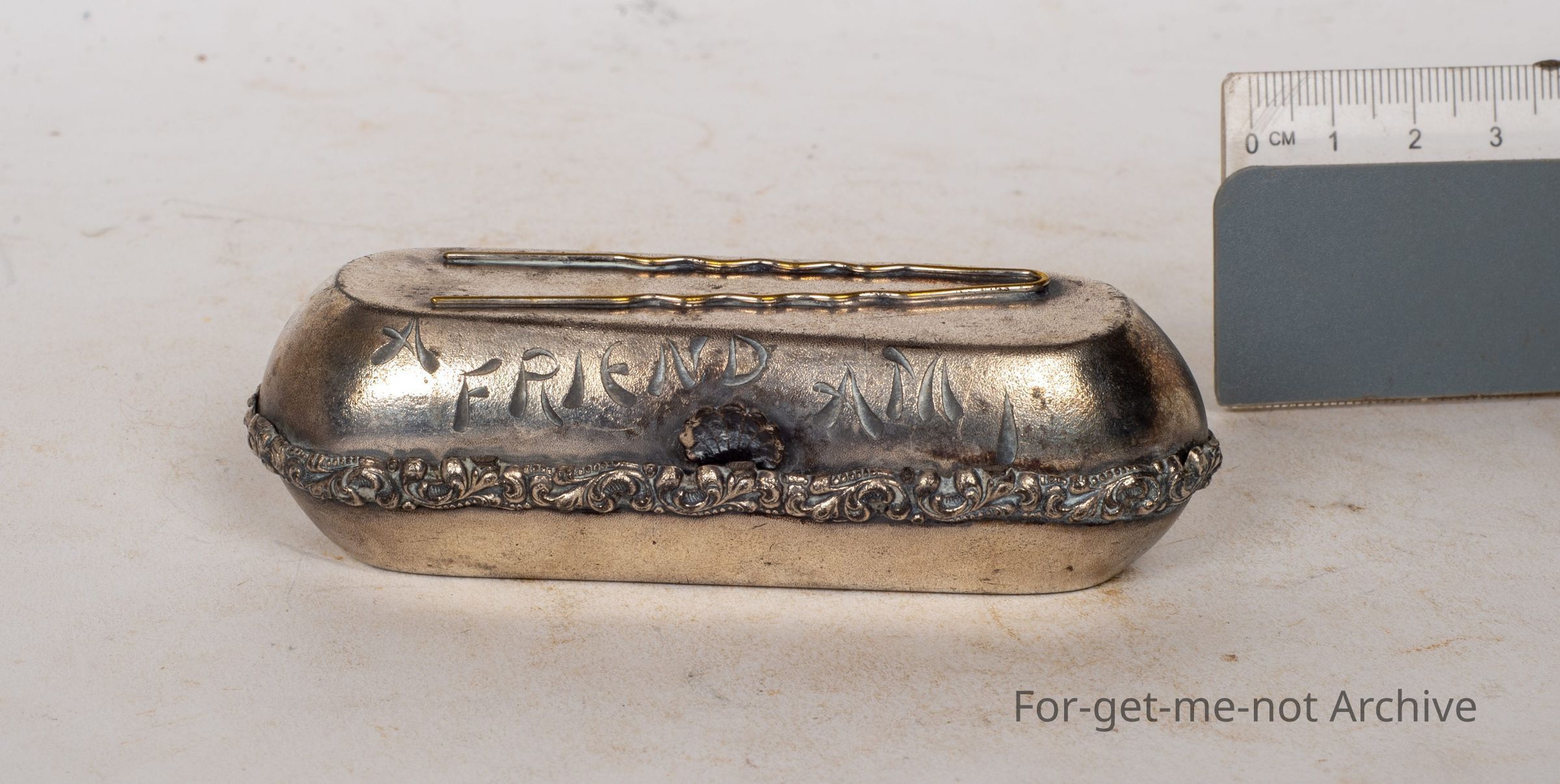 This is a little, container, for keeping pins in on your dressing table, good condition, image of a pin on the top with the, engraved text of friend am I.