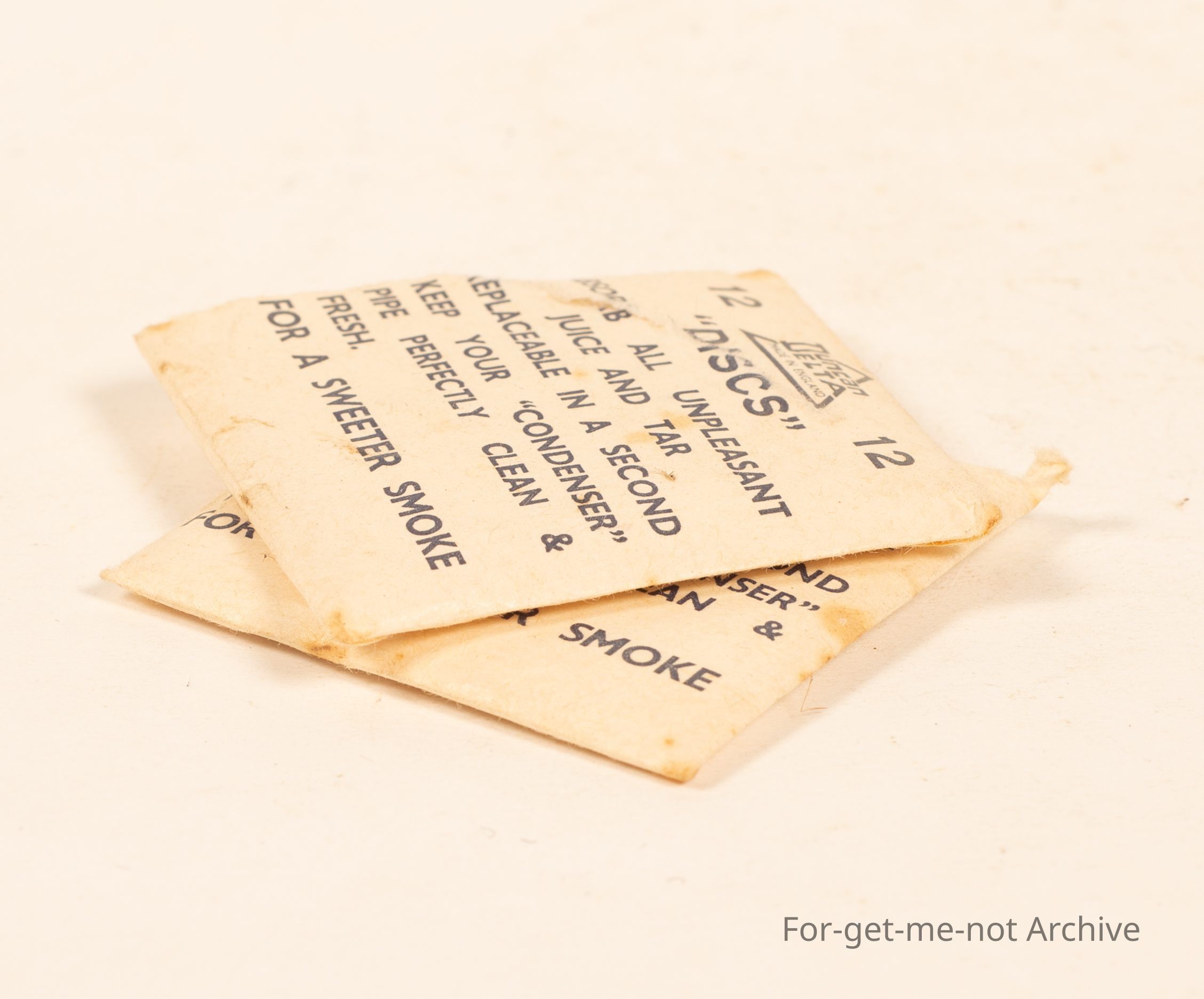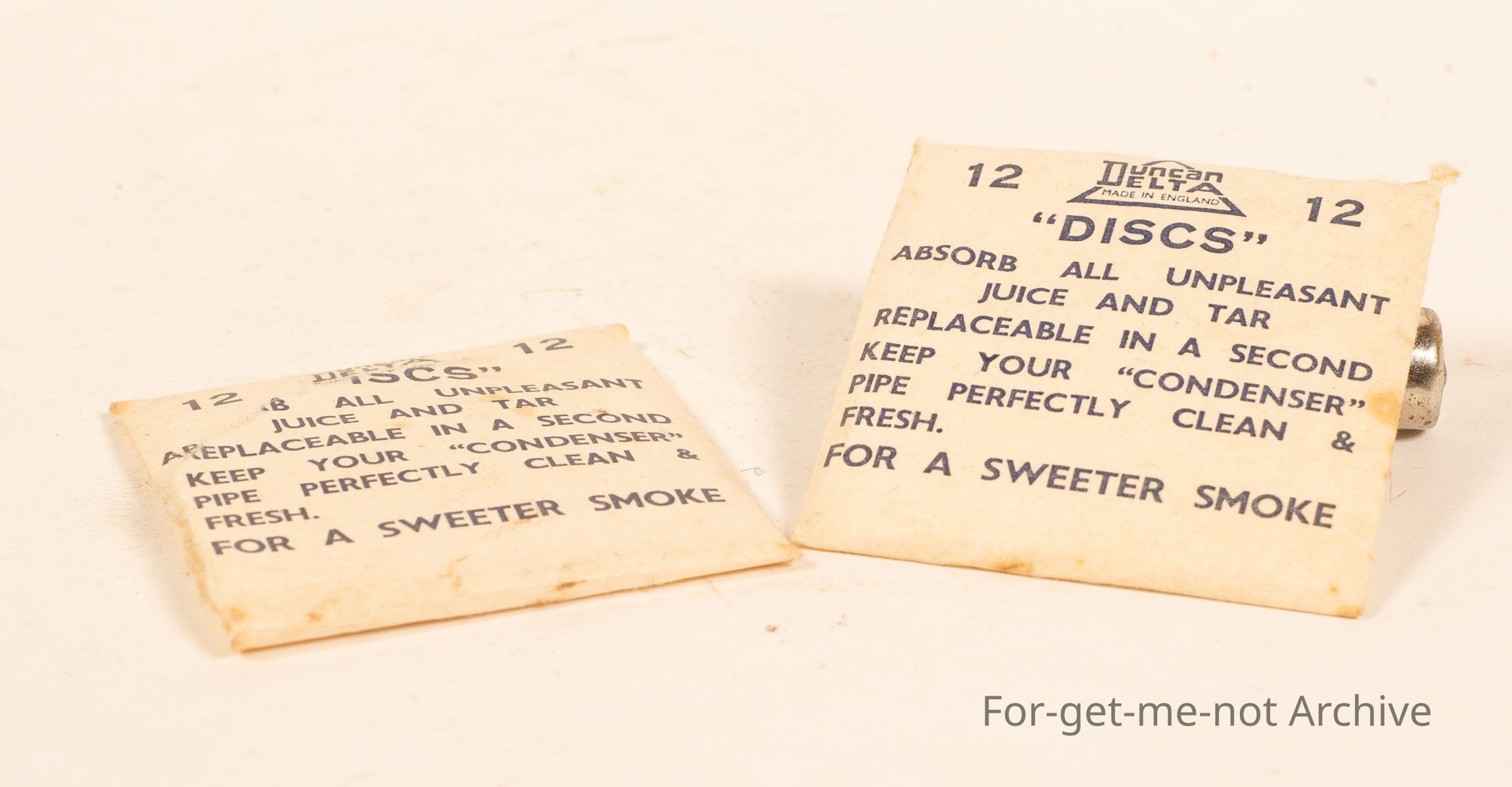 2 little paper packets of "Duncan Delta Discs" to absorb all the unpleasant juice and tar from the pipe. 12 in each packet.