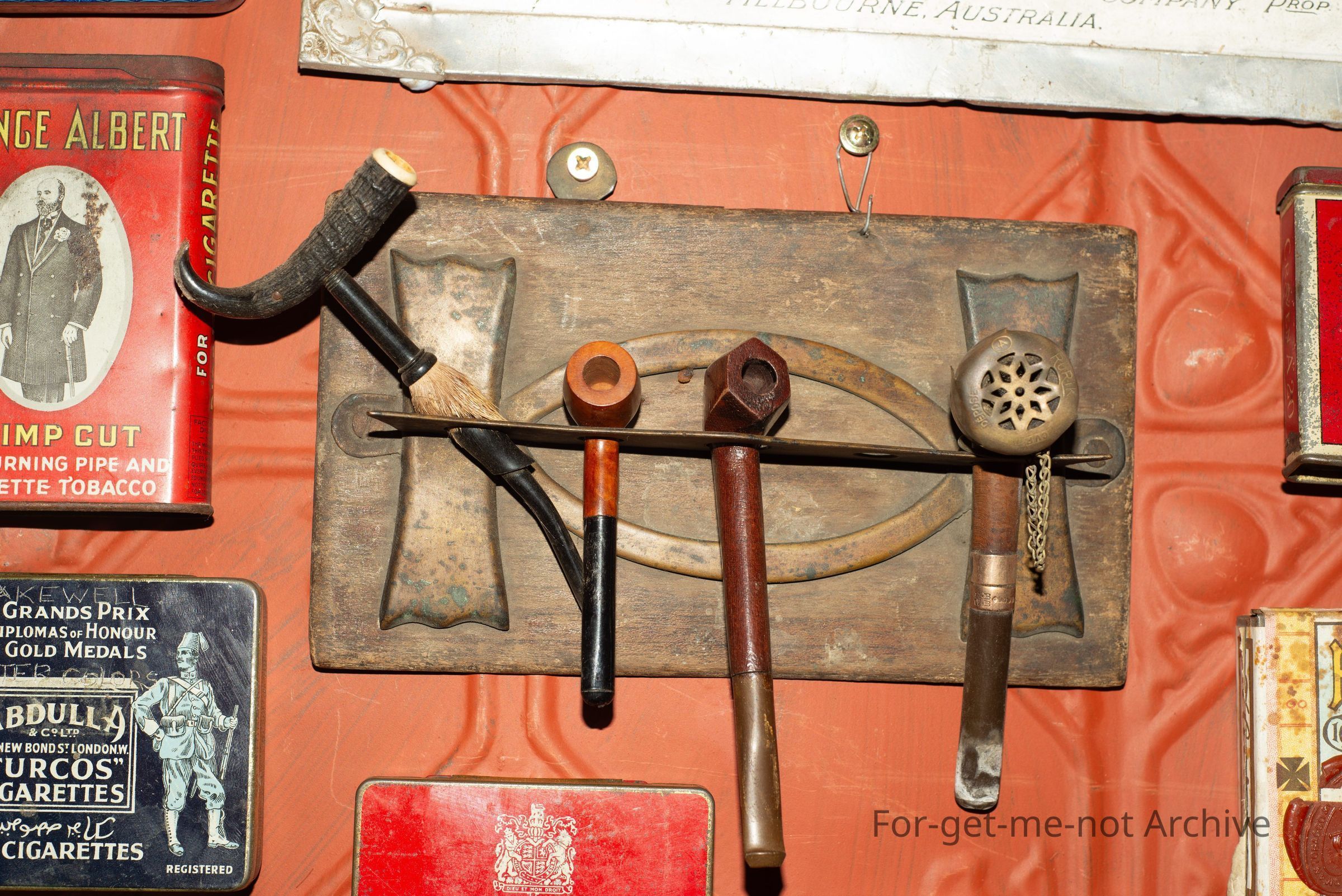 A wooden pipe rack. 5 pipes, Depression era pipe rack. Made from a cigar case.