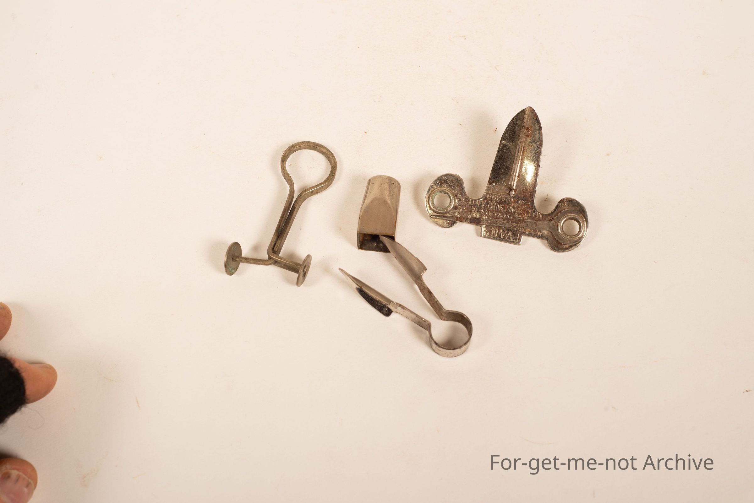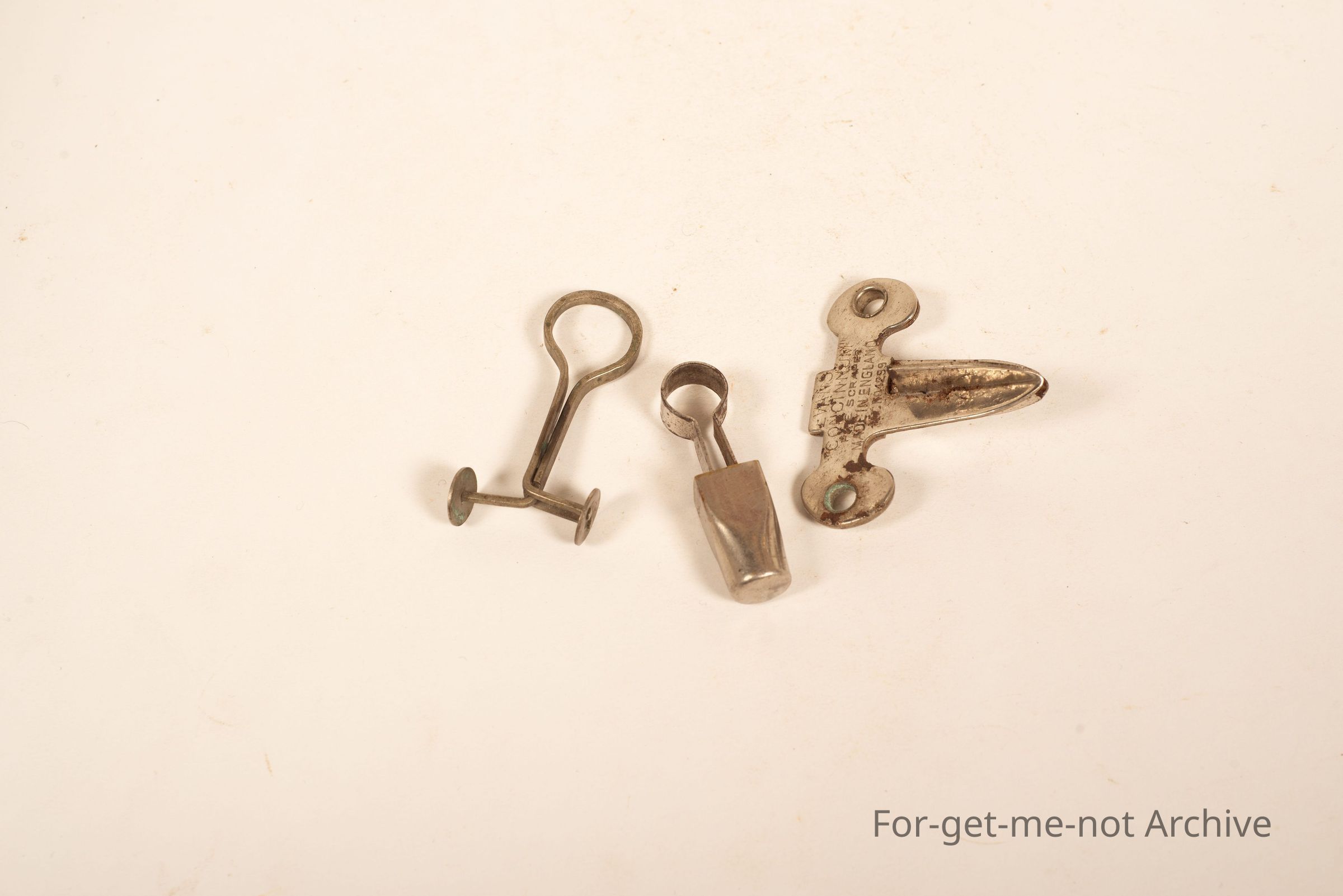 A group of 2 pipe reamers. Evans, and an unnamed one in a sleeve, the third item is a hose clamp for laboratories