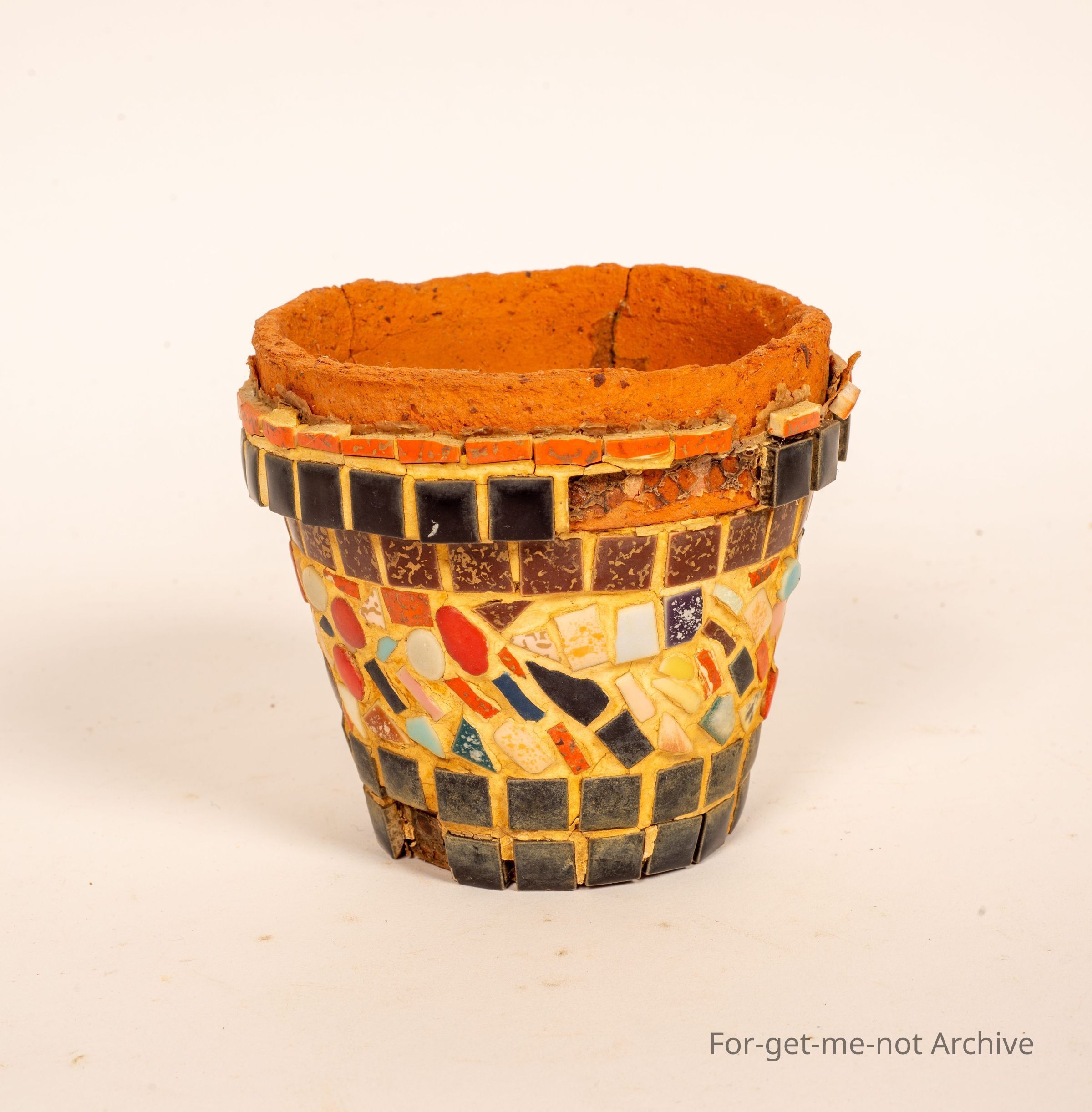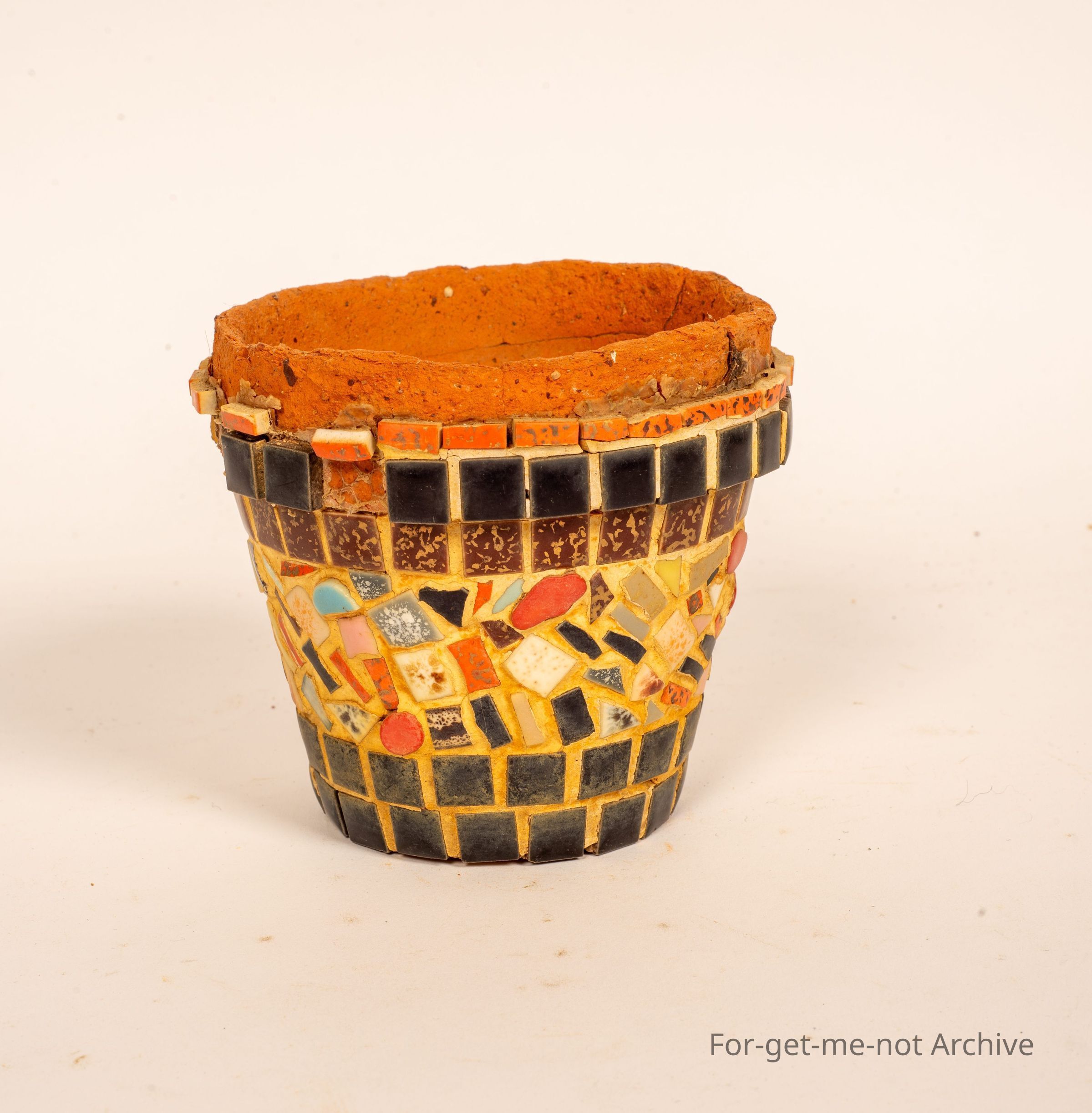 Is a small terracotta plant pot with mosaic around the outside. This was a popular craft at one stage