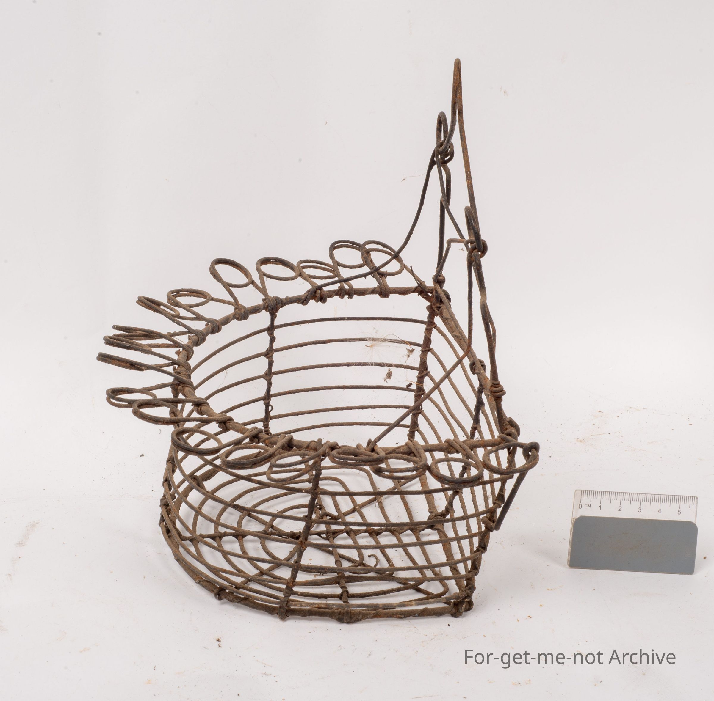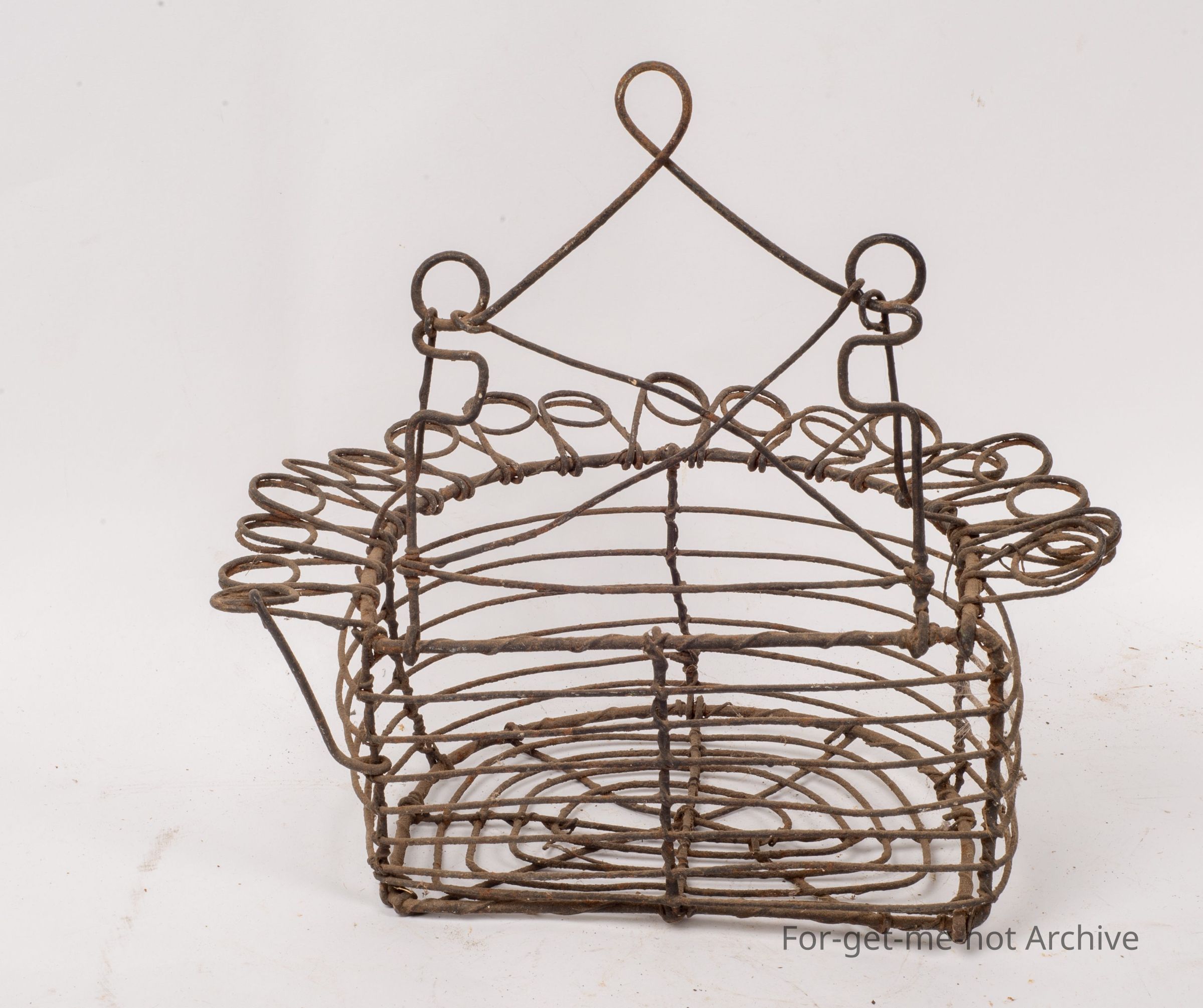 This is another piece of early wire work. Twenties or thirties. This piece is quite a deep bowl with an outside decorated edge. This would have hung on a wall, possibly for a plant stand or to grow a plant in. In reasonable condition, but it's been out in the weather a lot.Collection