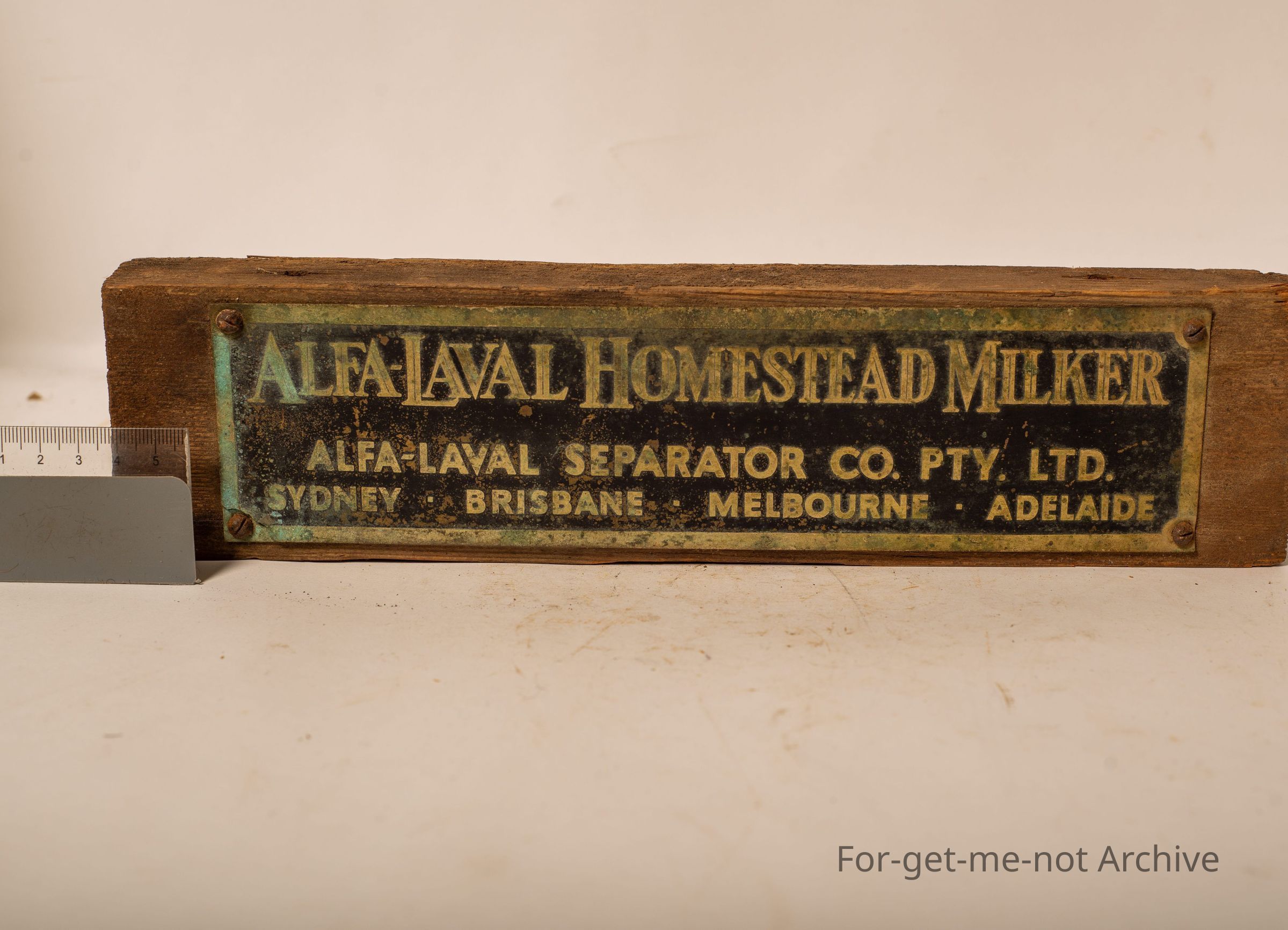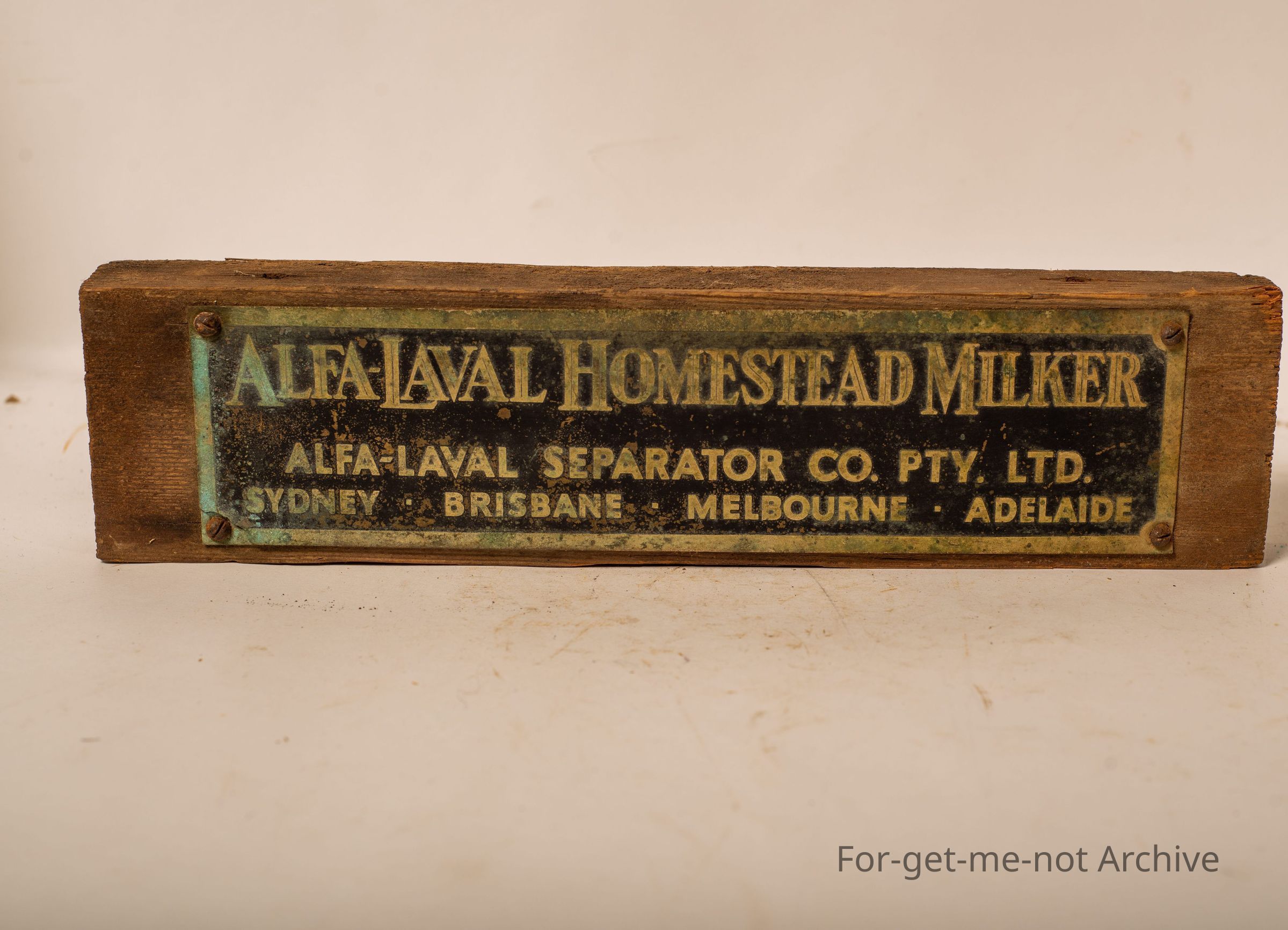 Is an advertising plaque for Alpha Lavel Homestead Milker. Melbourne, Sydney, Brisbane, Adelaide, on a piece of wood would clean up nicely