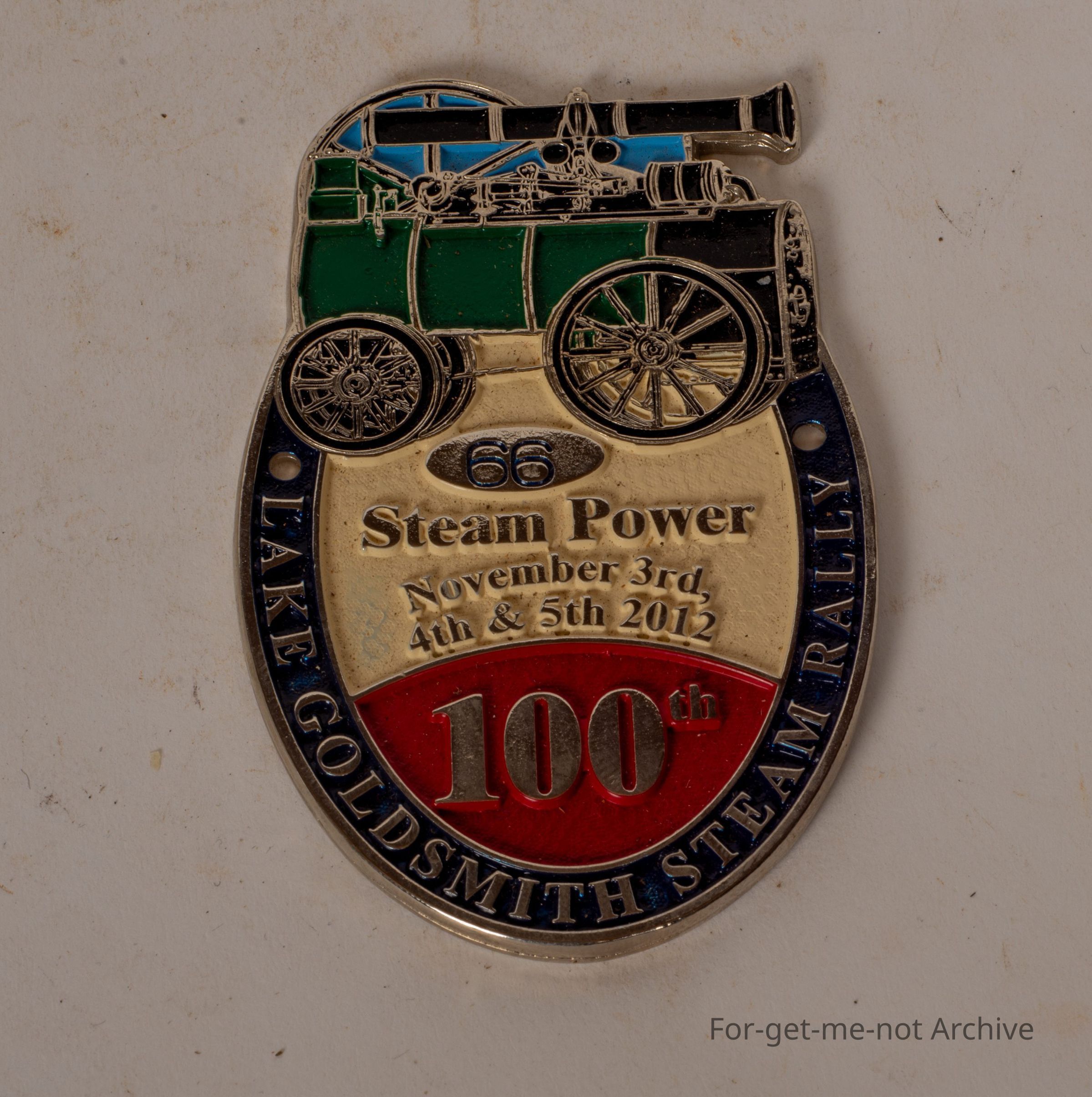 This is a little plaque produced by the Goldsmith Steam, rally people. This is advertising the 100th rally, November 3rd, 4th, and 5th, 2012. The biggest rally they've ever had, huge crowds from all over, turned up, and it was a magnificent event.Collection