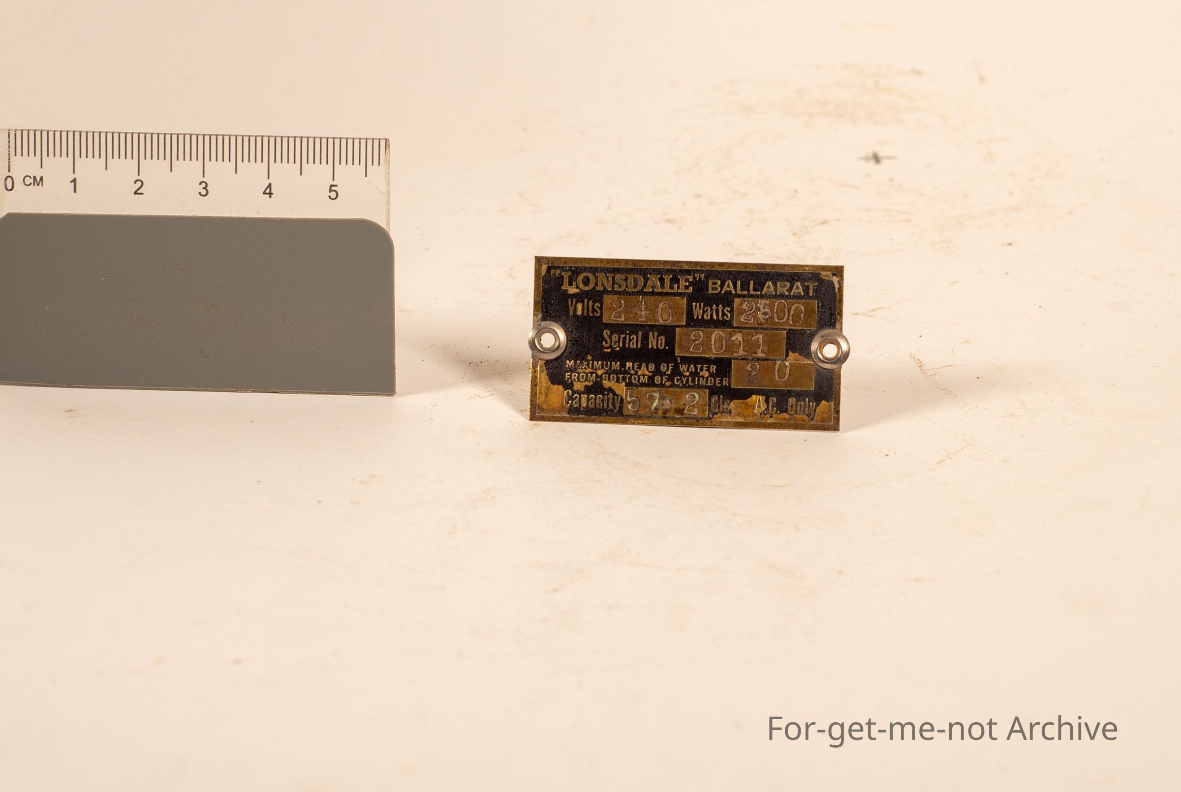 Small manufacturing plaque from Lonsdale who were hot water service makers and tank makers from Ballarat.