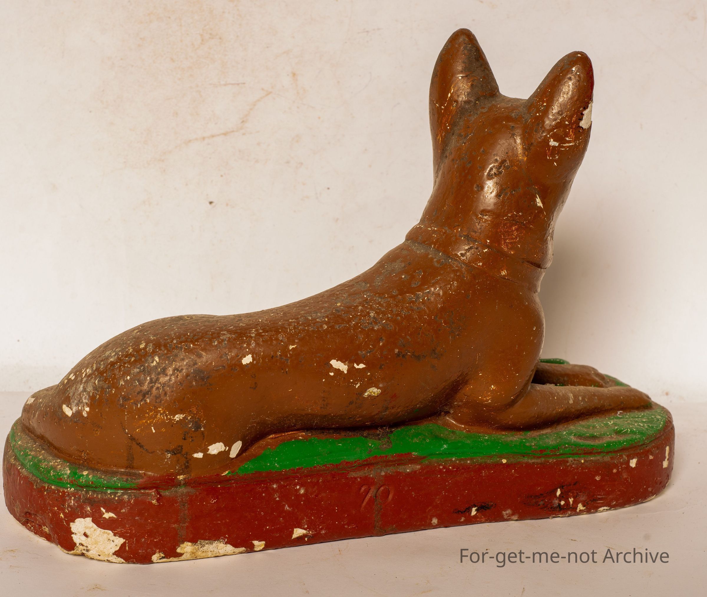 Plaster Kelpie dog, lying down. this is hand painted. The dog has a fair few chips. Nose partly missing. Not in good order, but a popular thing today.