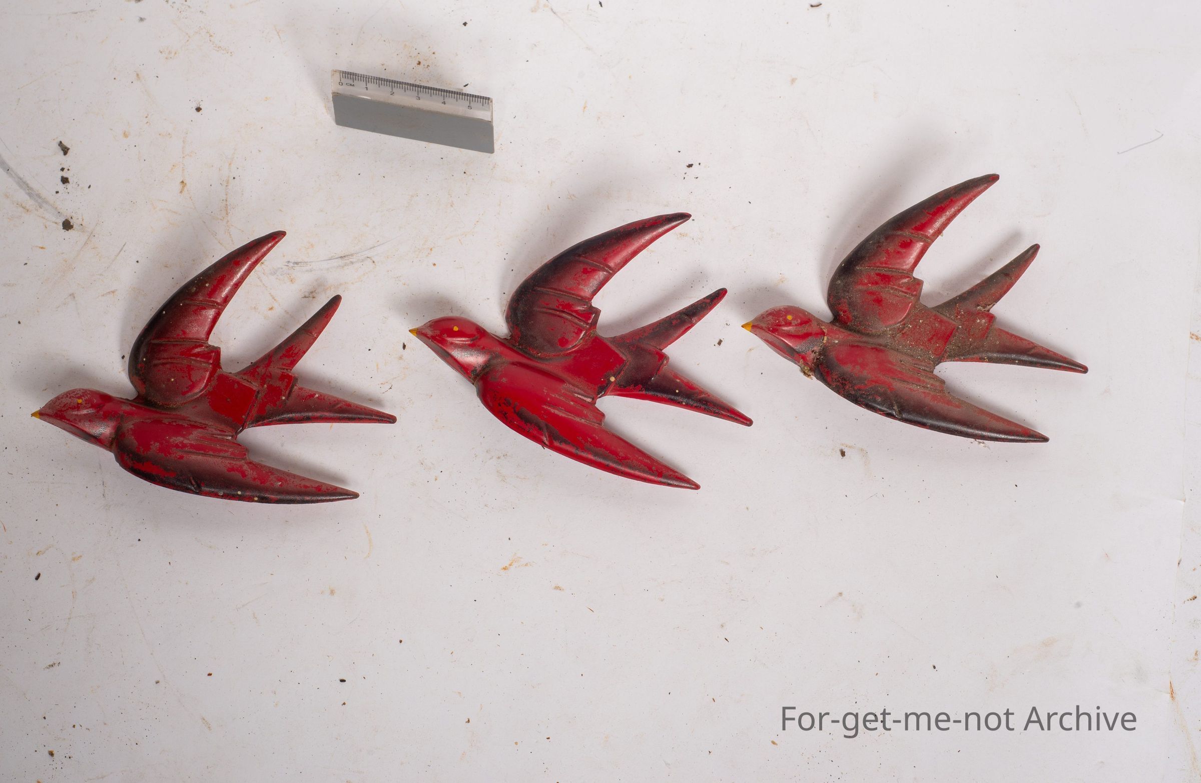 These are a group of birds, made from molded plastic. These are made to hang on the wall. They're in the shape of swallows. Quite beautifully done. Hand painted.