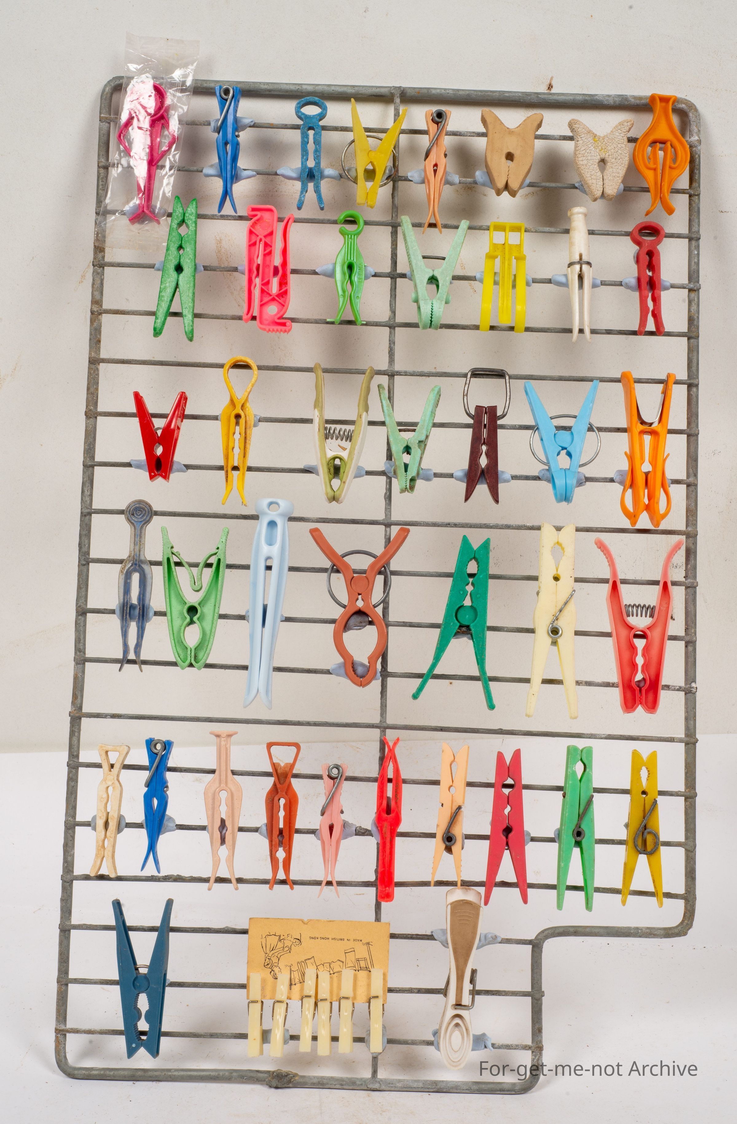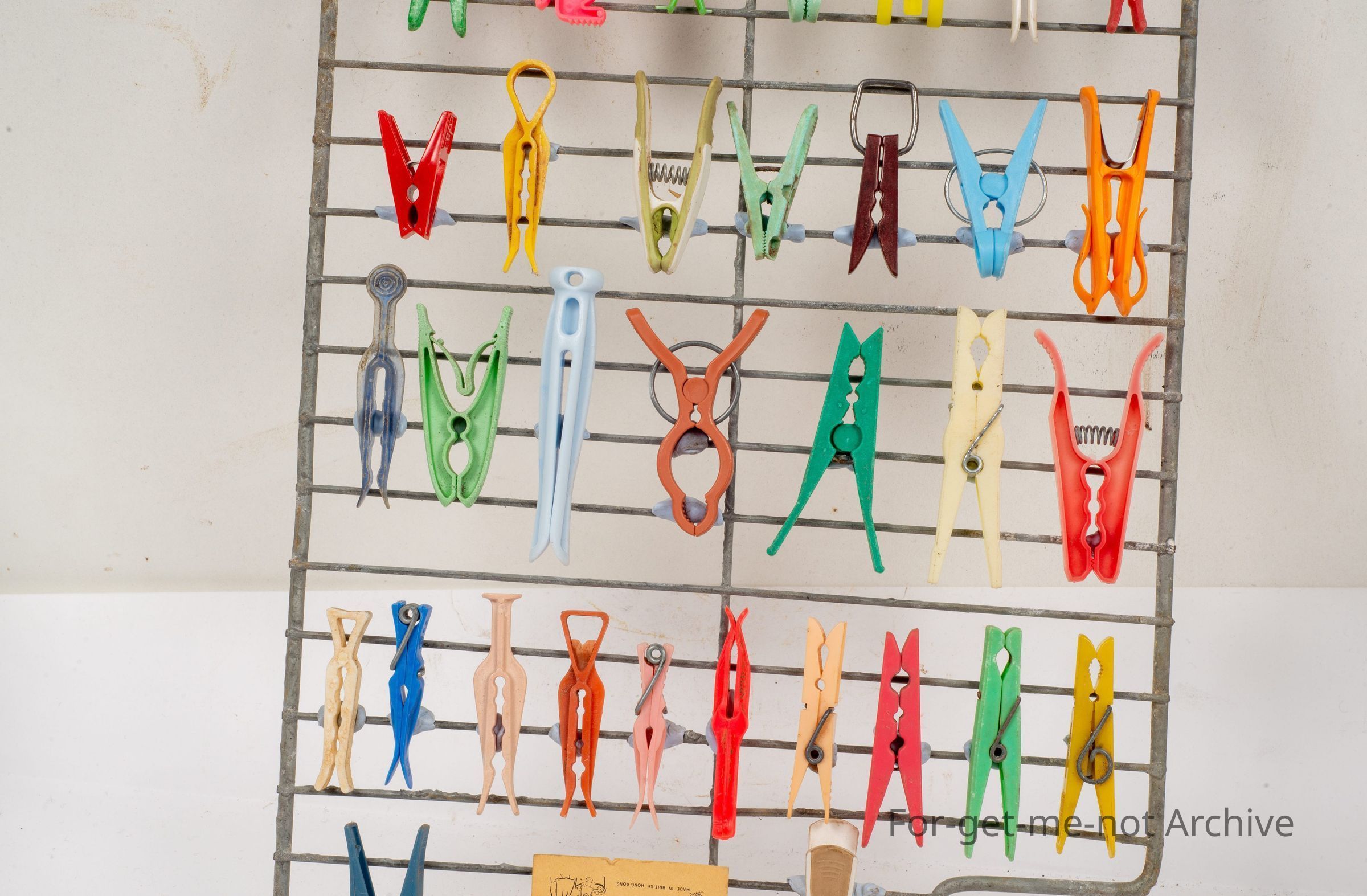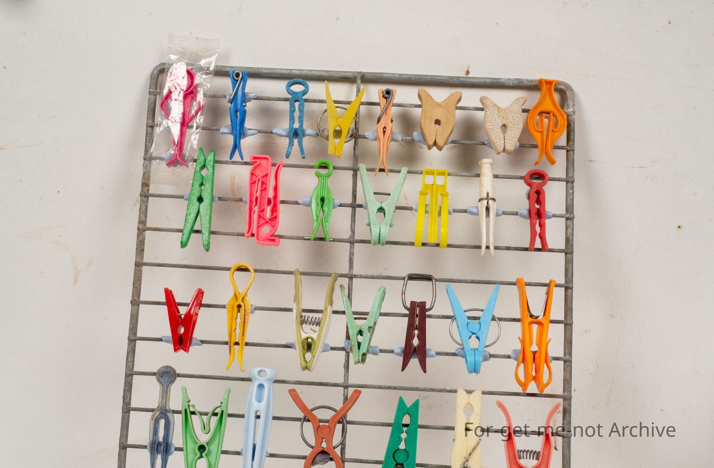 Is a wire rack of plastic pegs of all different designs, colours, shapes. Quite a few of them, the rack.