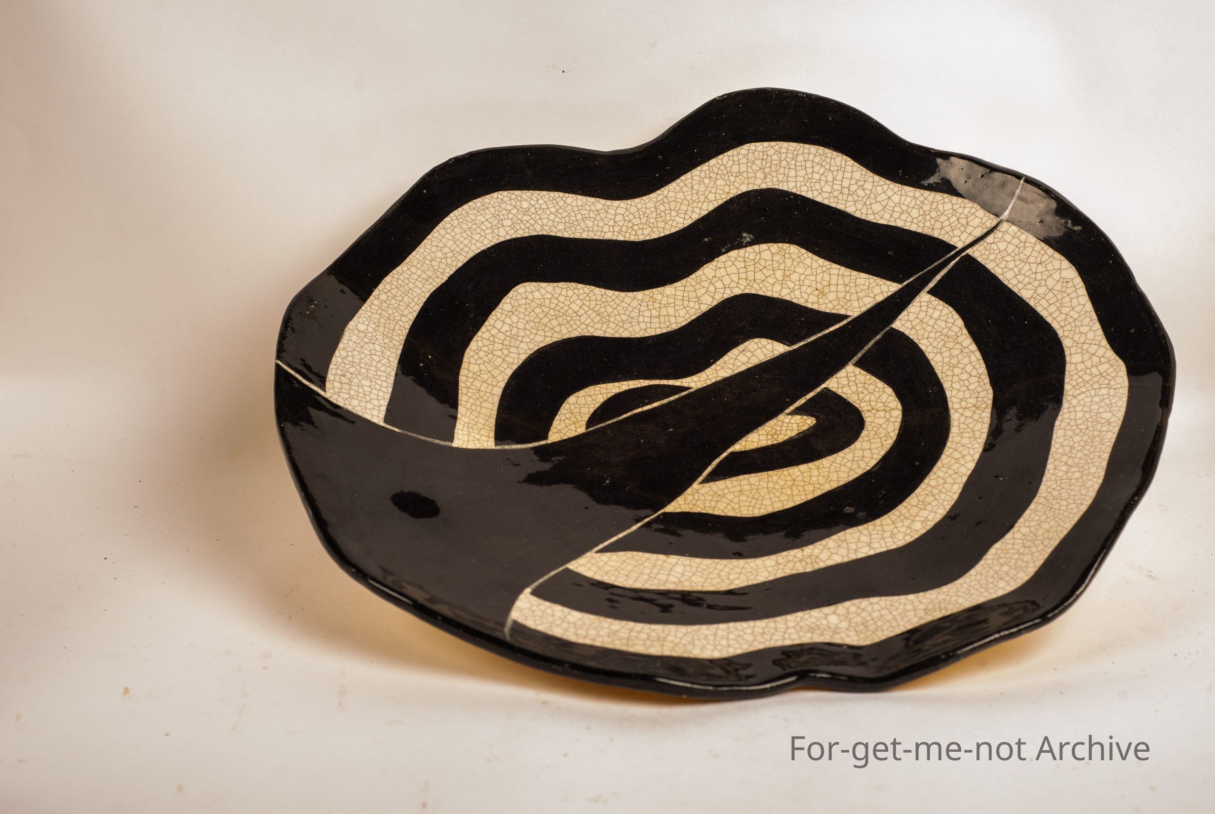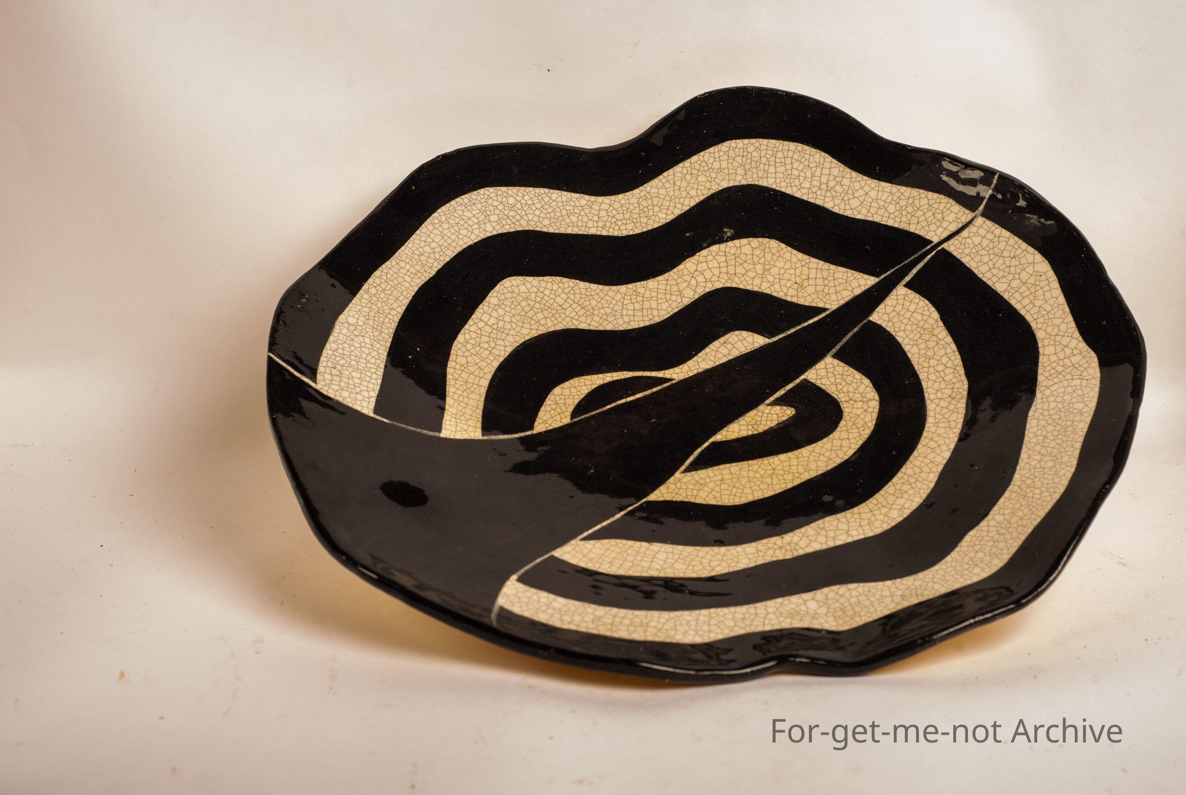 Large studio pottery plate. Unusual design may be attributed to Aboriginal folklore. Signed on the back, no information available.