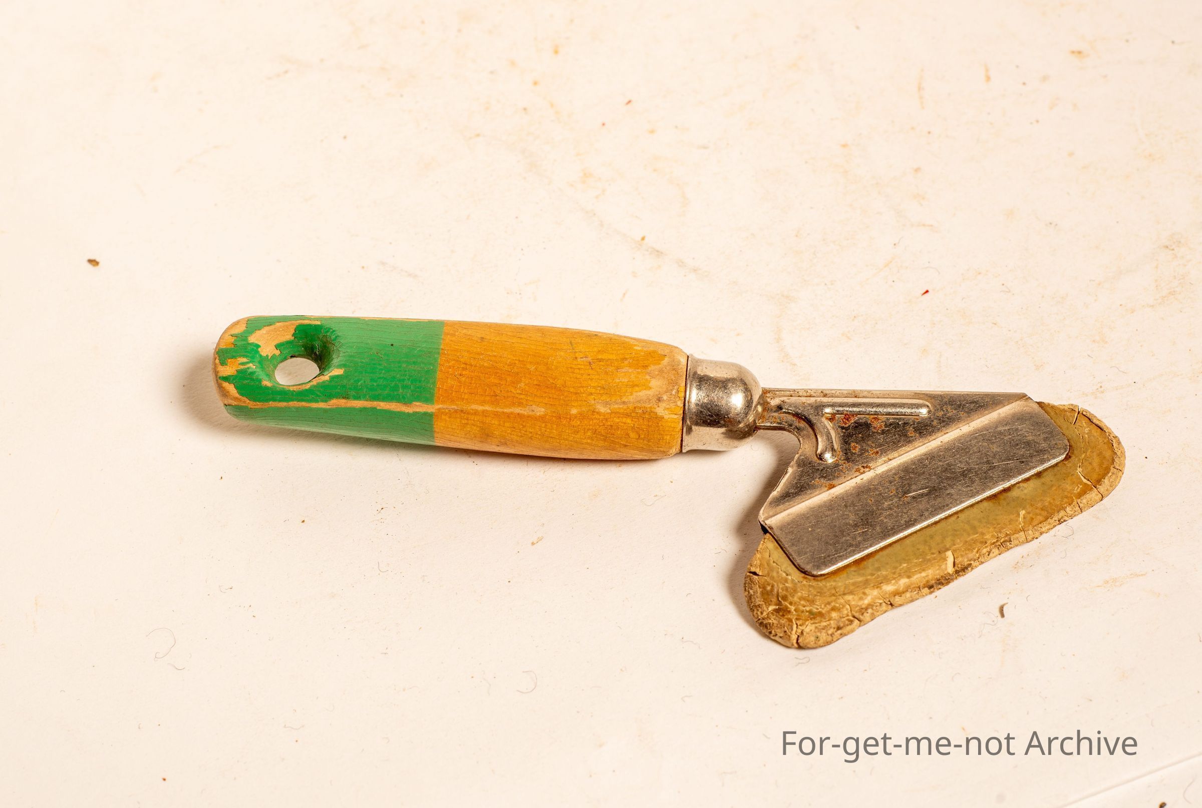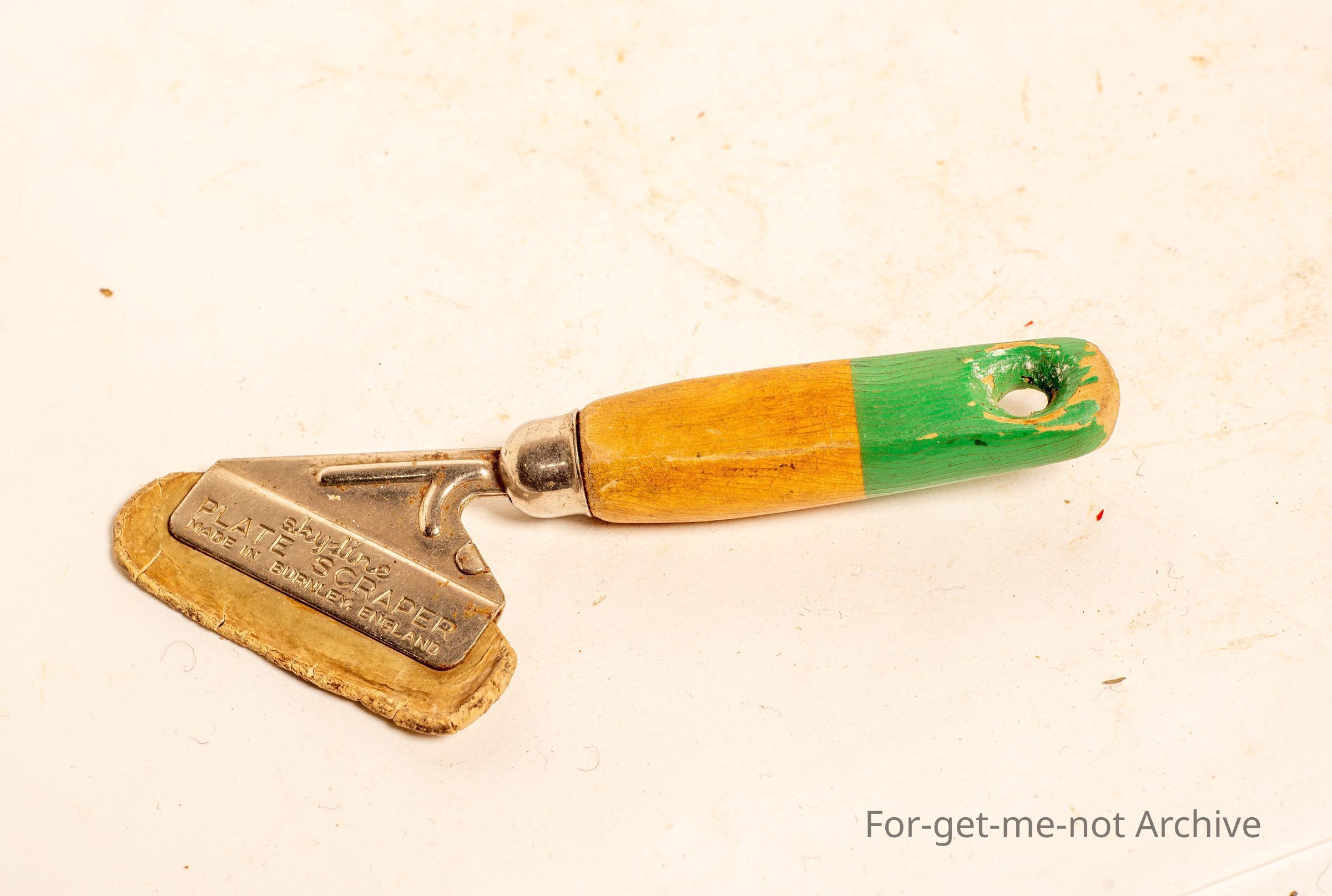 Wooden handle kitchen tool called the Skyline Plate Scraper made in England. Has a piece of, like, hard rubber to clean plates before dishwashing.
