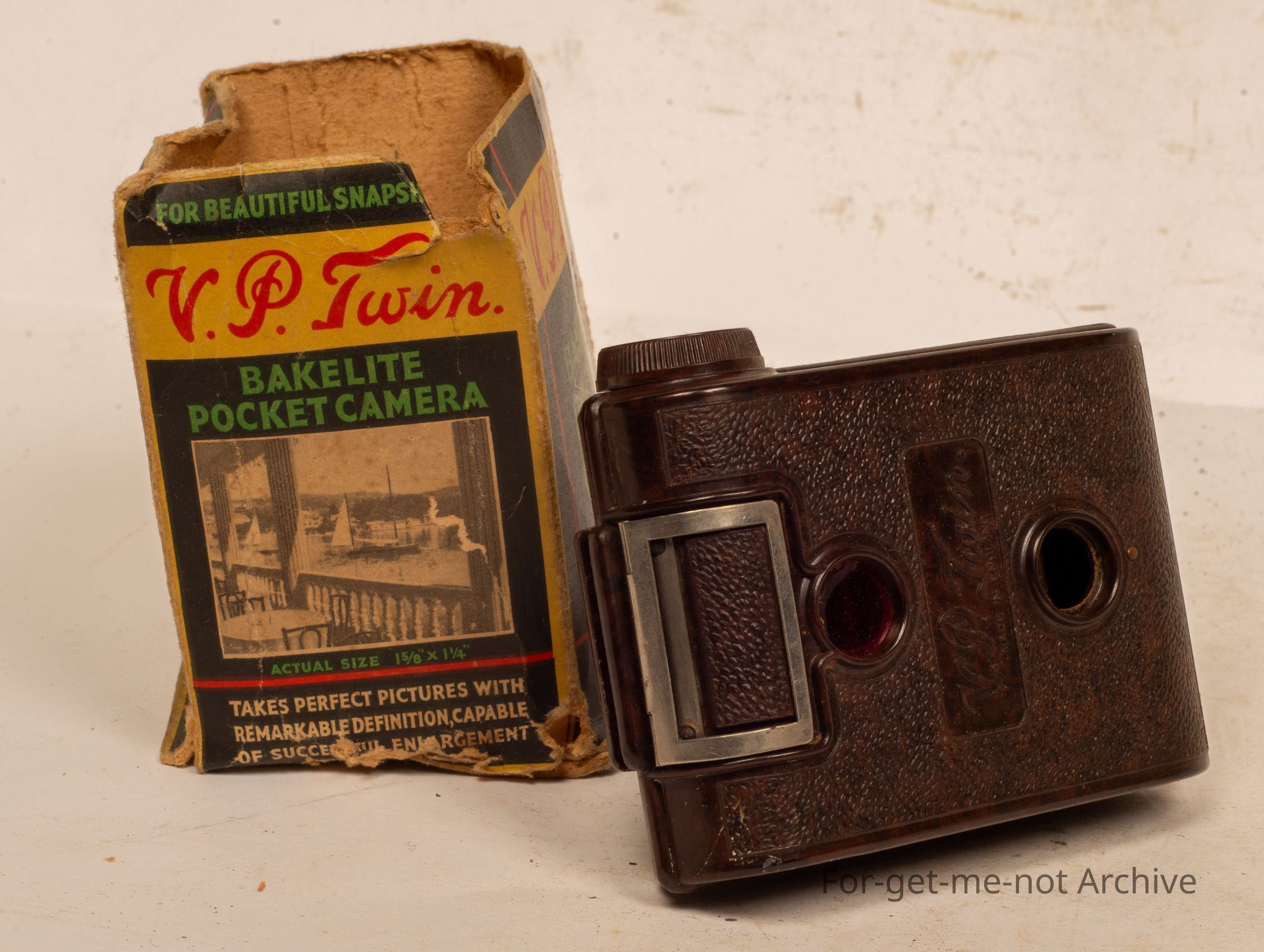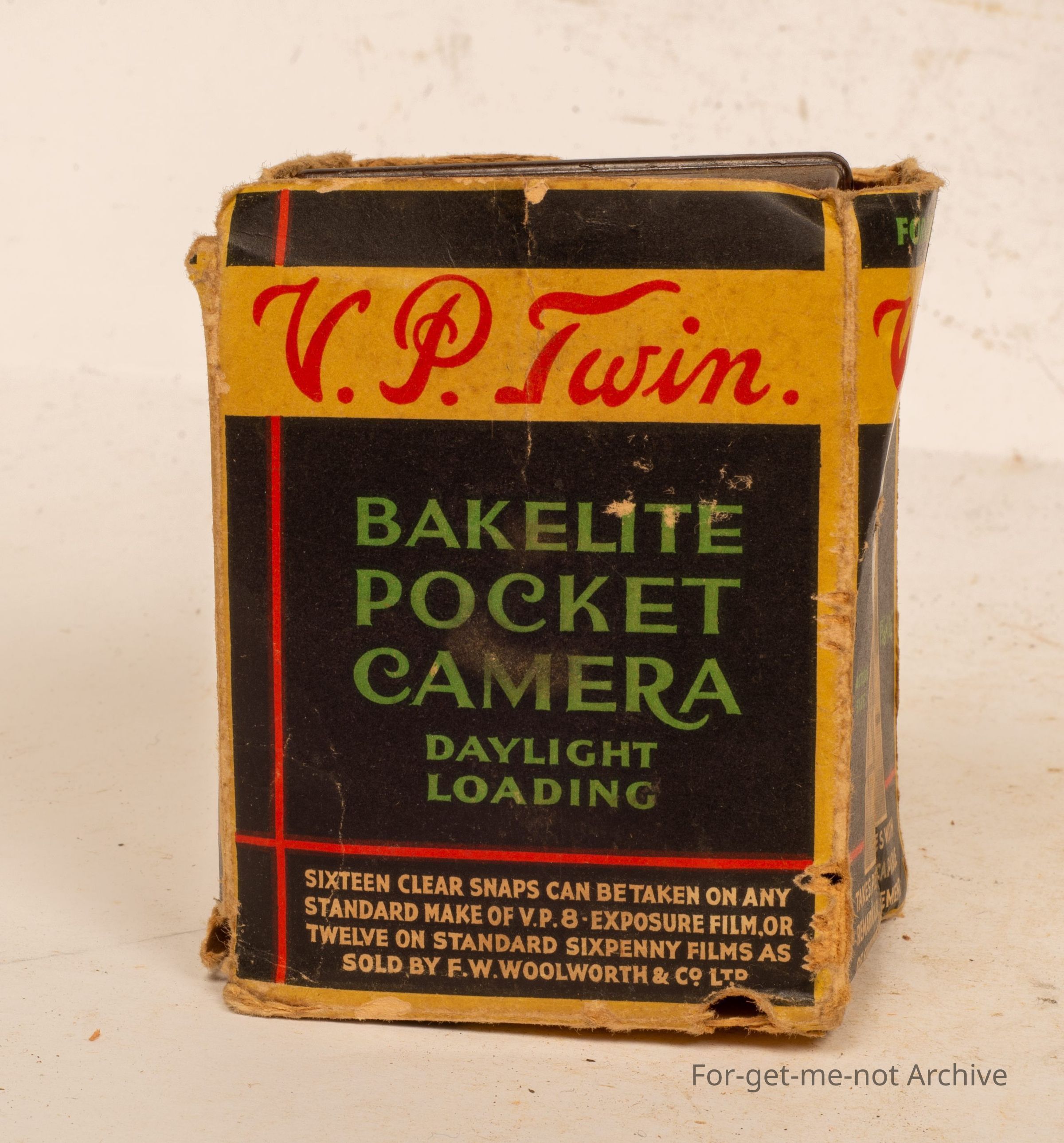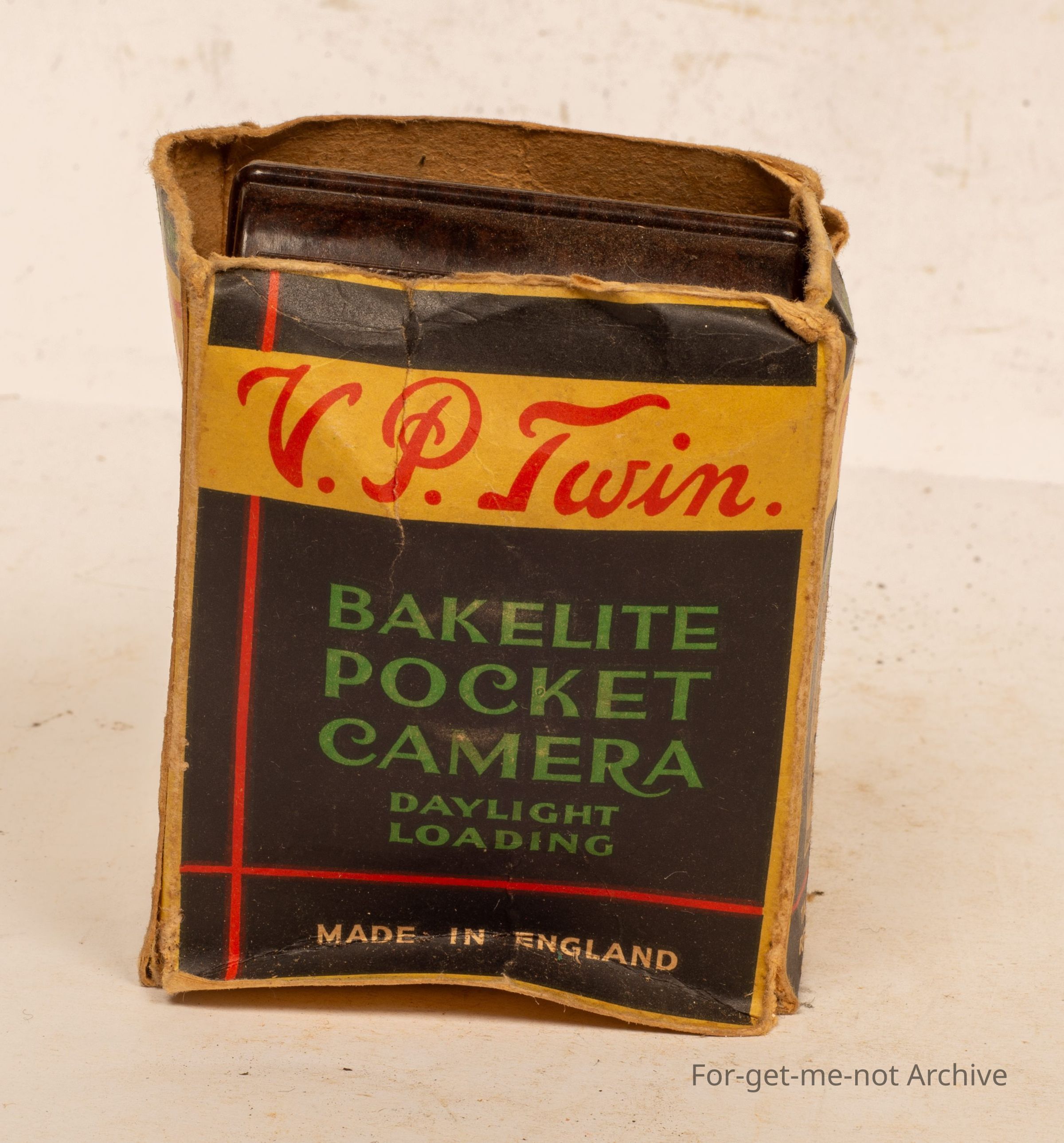Cardboard box, housing, Bakelite, pocket camera, daylight loading, called the V P Twin. Takes quite a small photo of just after just over an inch width and an inch, 2 inches long. Sold by Woolworths and Co.Collection