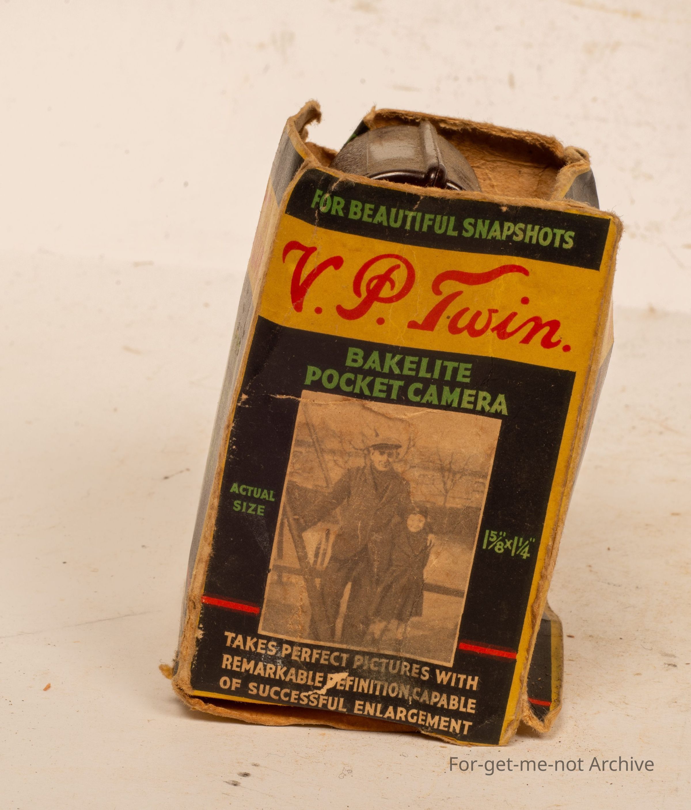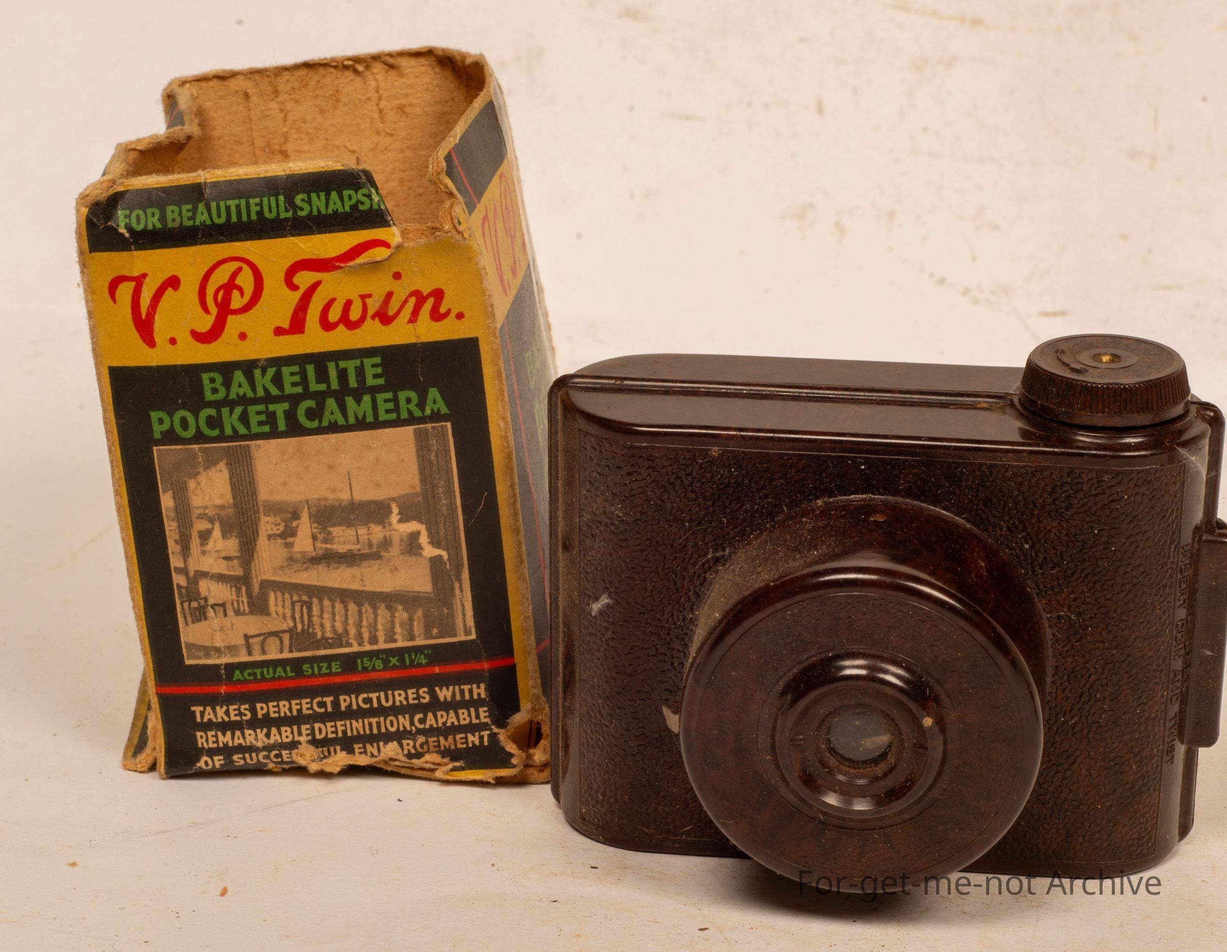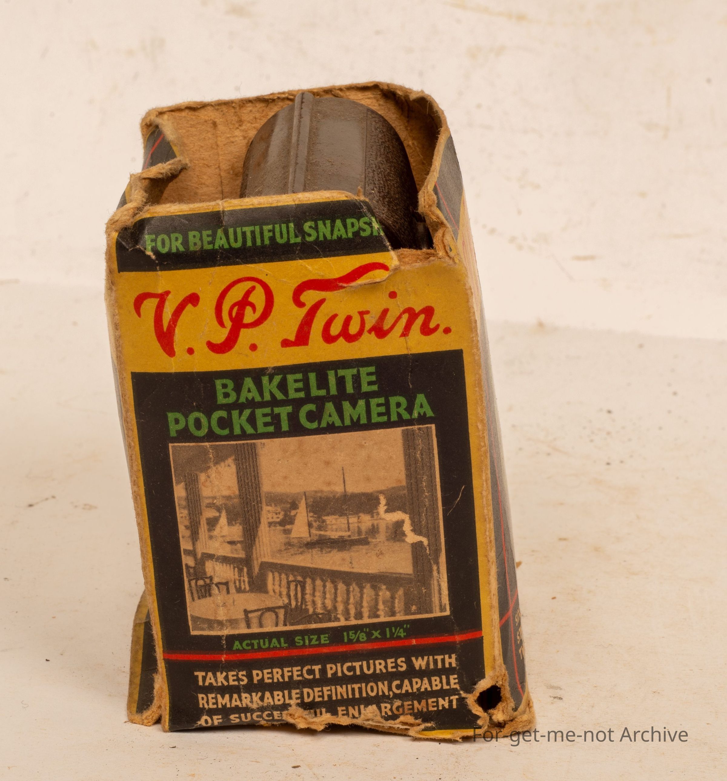 Cardboard box, housing, Bakelite, pocket camera, daylight loading, called the V P Twin. Takes quite a small photo of just after just over an inch width and an inch, 2 inches long. Sold by Woolworths and Co.Collection