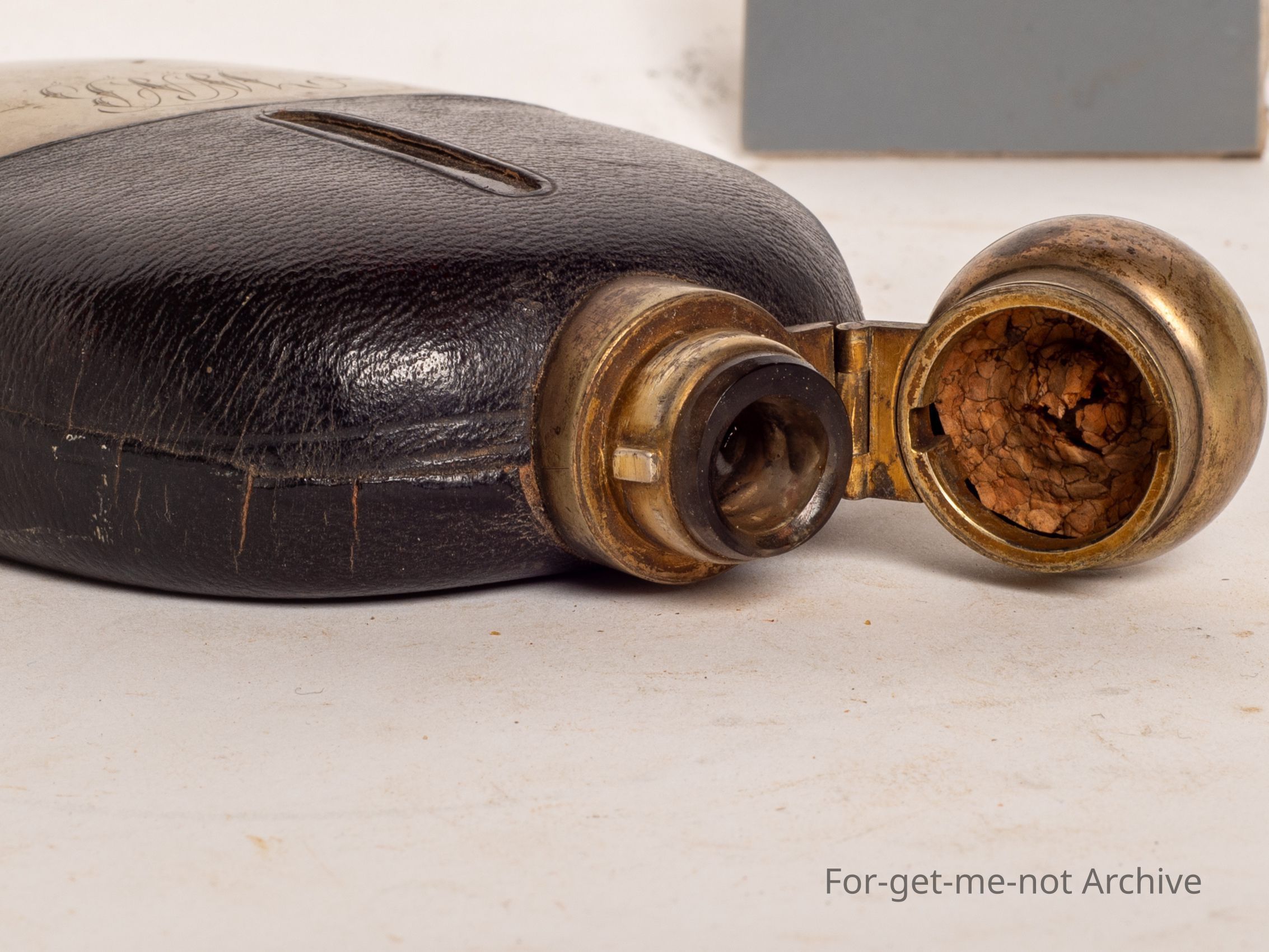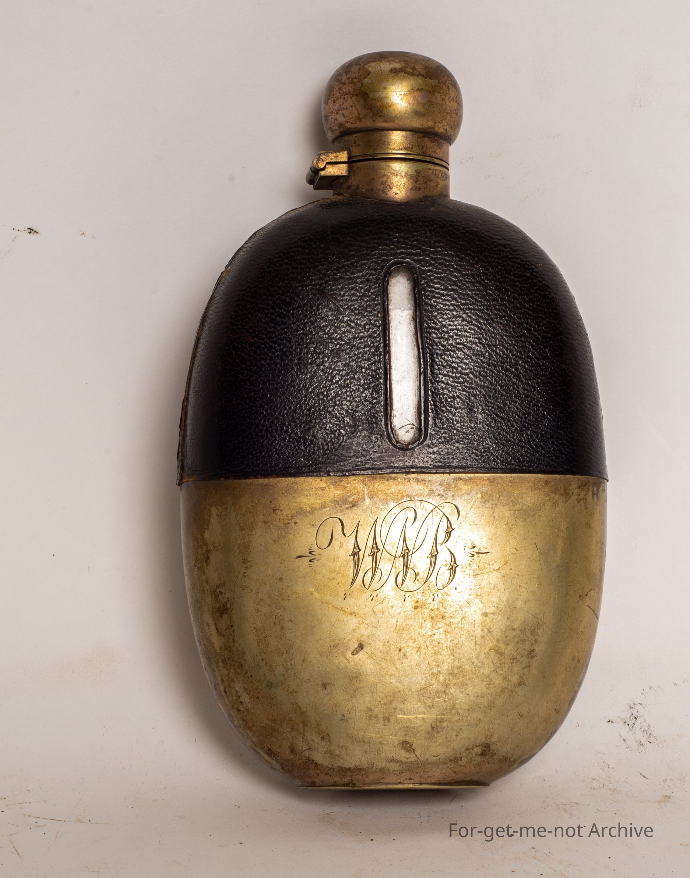 This is a beautiful little pocket flask that belonged to William Manry Booth, in perfect condition. It's got a leather top half with a viewing slot through the leather to see what the what amount of drink is left. The base of it is silver, in fabulous order.Collection