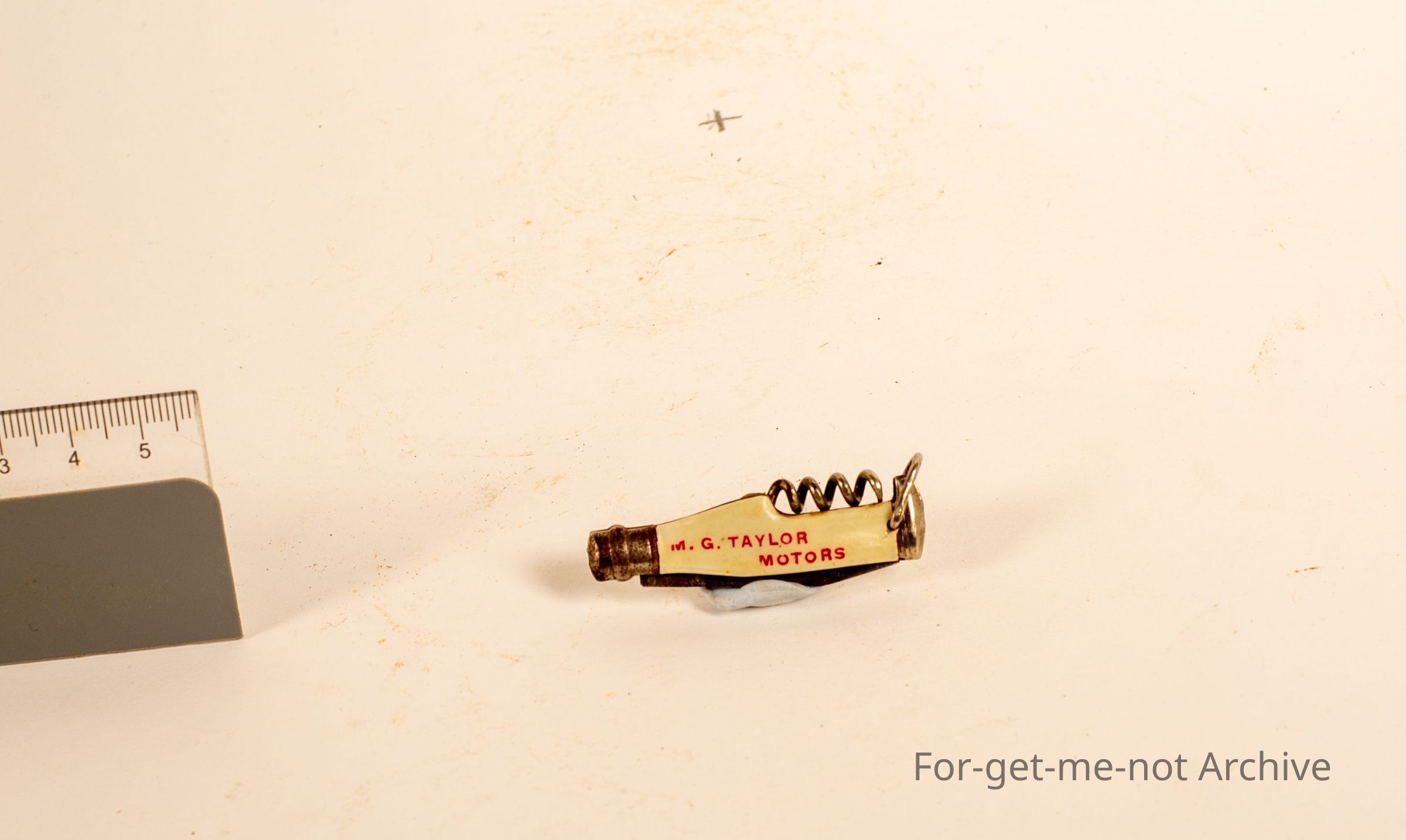 Advertising Corkscrew, Pocket Knife, advertising MG Taylor Motors, Ballarat, Mair Street.