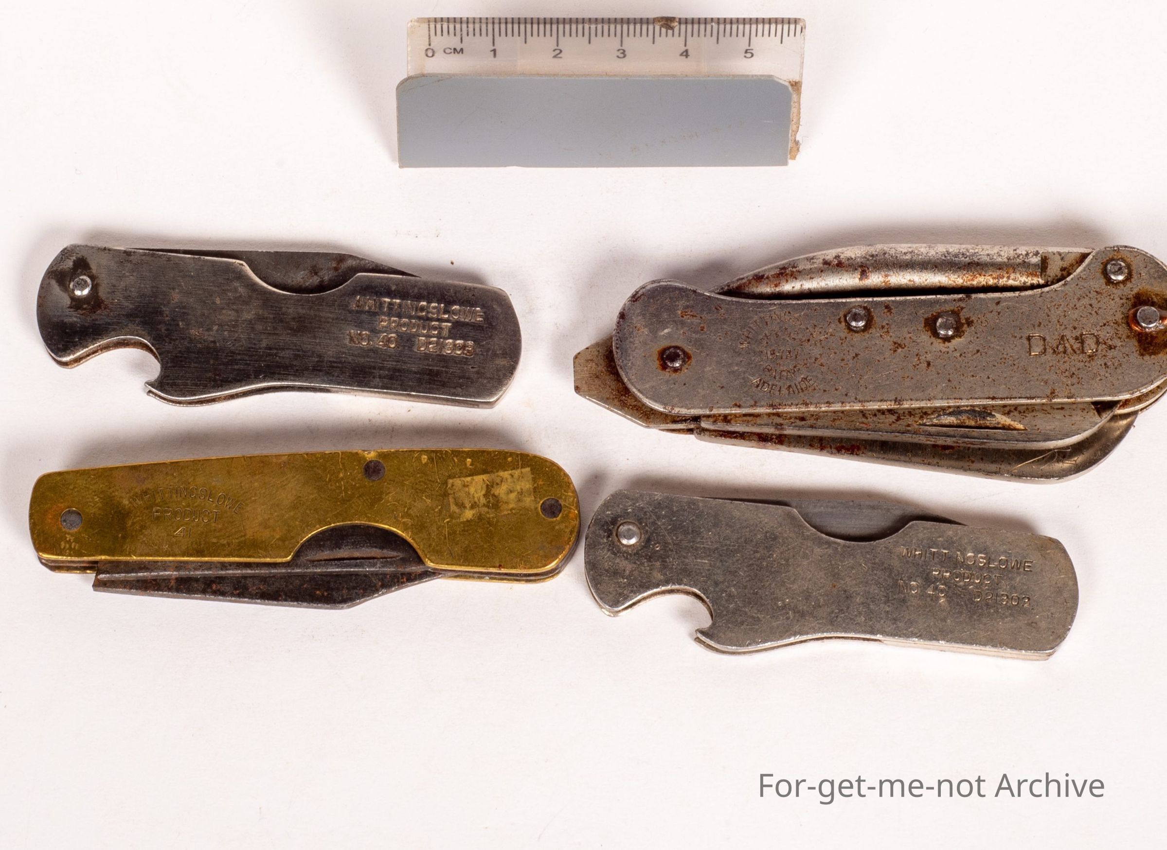 The first group is from Whittingslow Product, Adelaide, a knife and a bottle opener. The second one is Whittingslow Adelaide, a couple of heavy blades and a pig sticker. The third one, Whittingslow Product Adelaide, bottle opener and a large blade. The 4th one is a very early Whittingslow product, a brass knife, product number 41, 2 bladesCollection