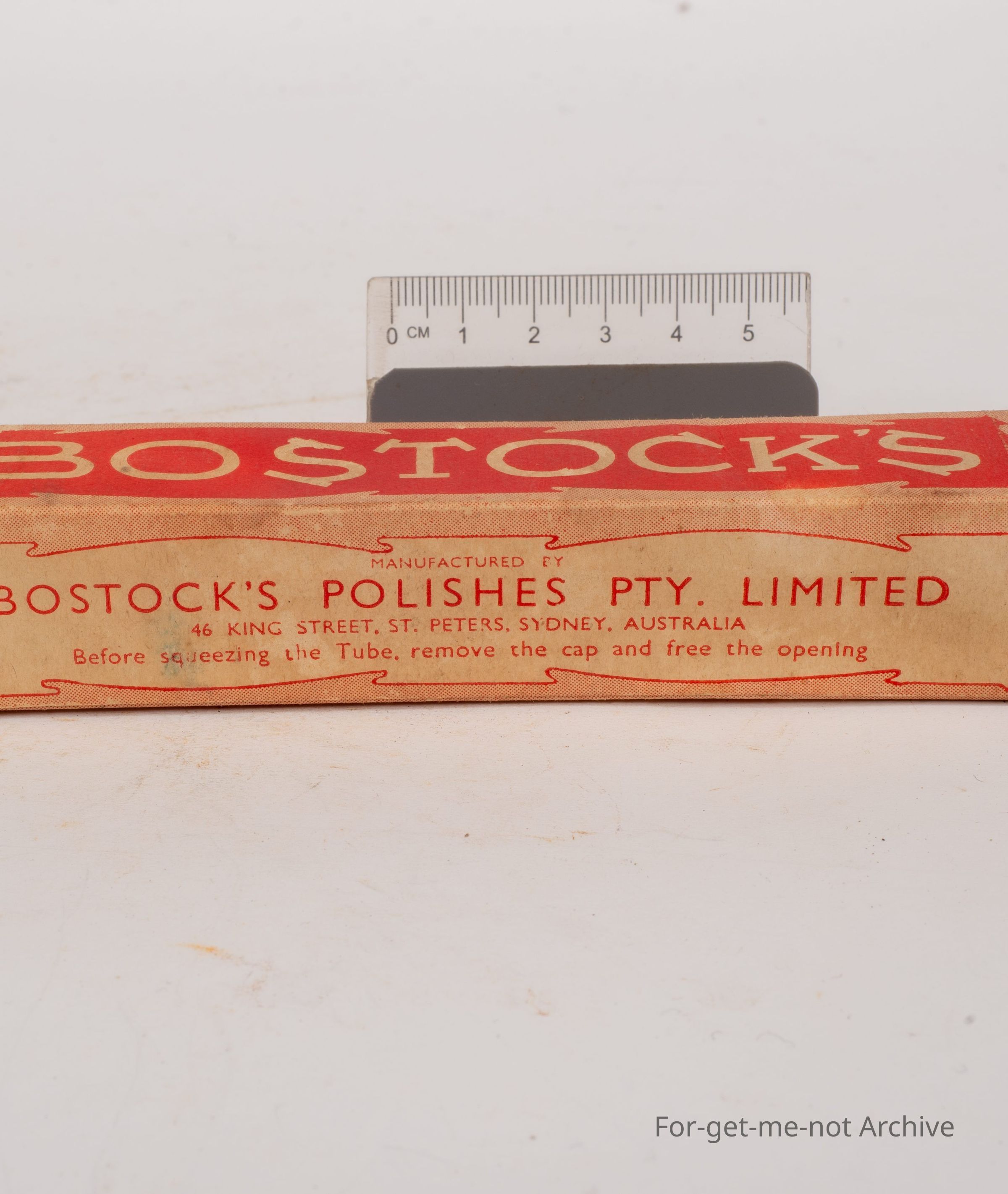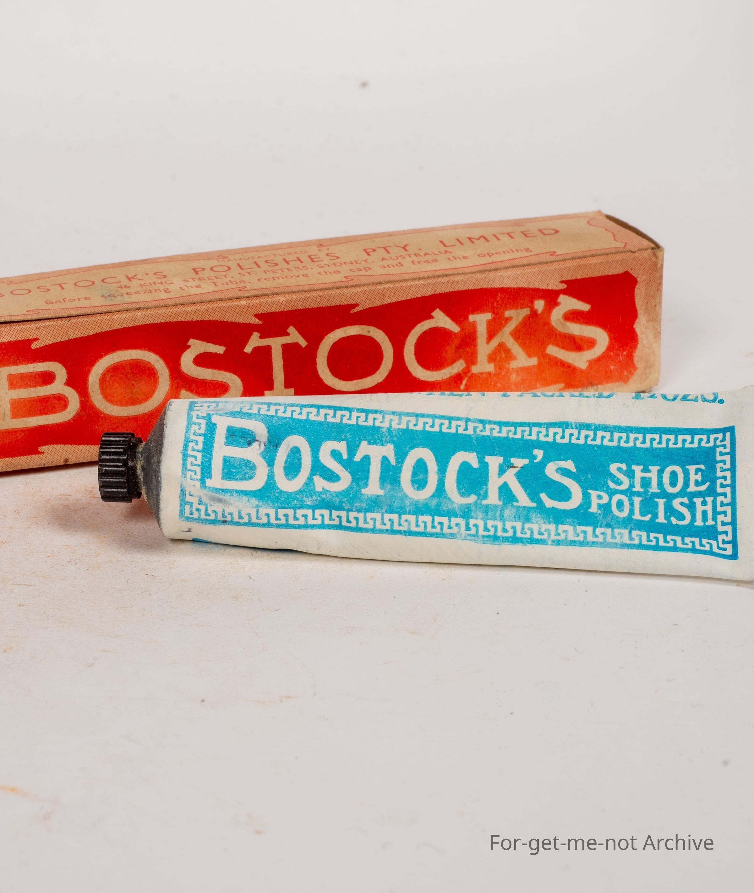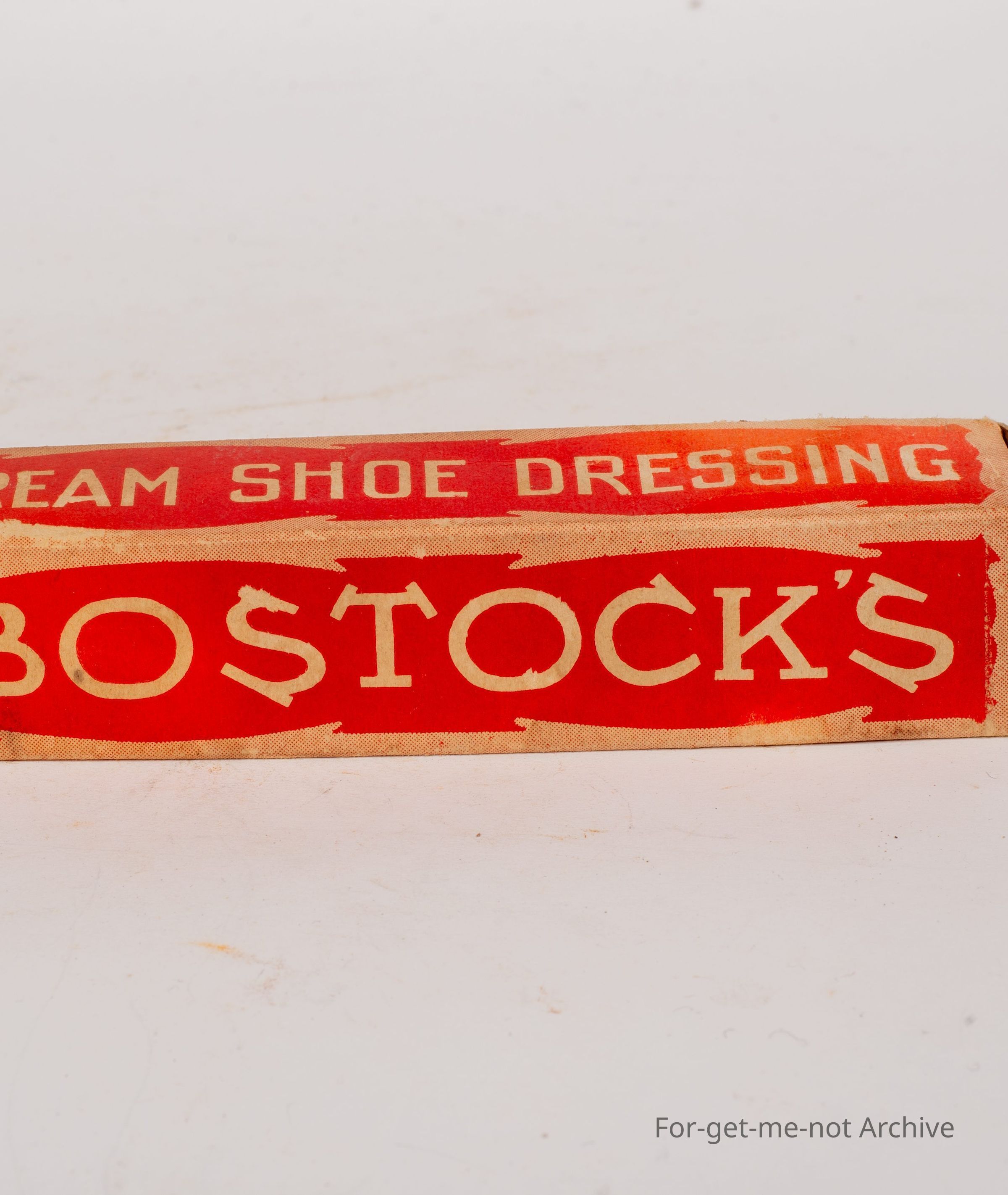 Cardboard box of Bostock's polishers, tube intact from King st Peters, Sydney, Australia. Shoe Cream dressing from Bostocks.