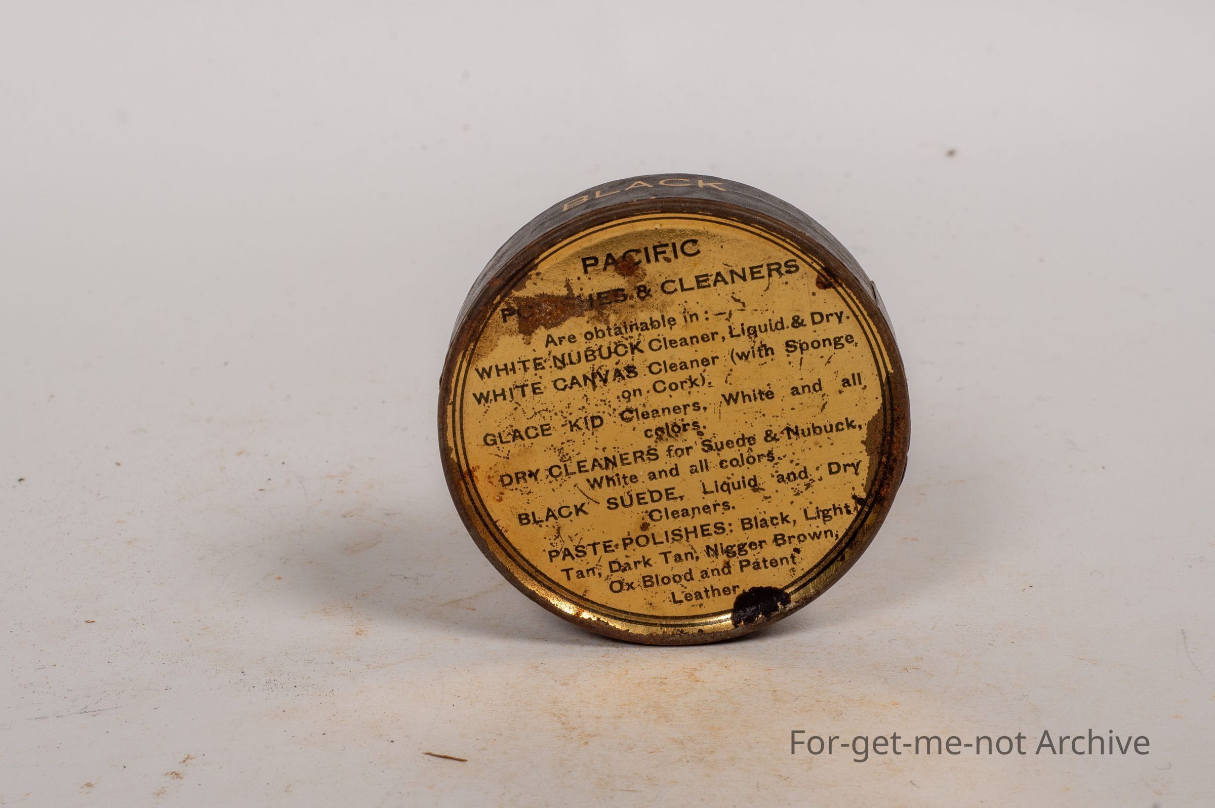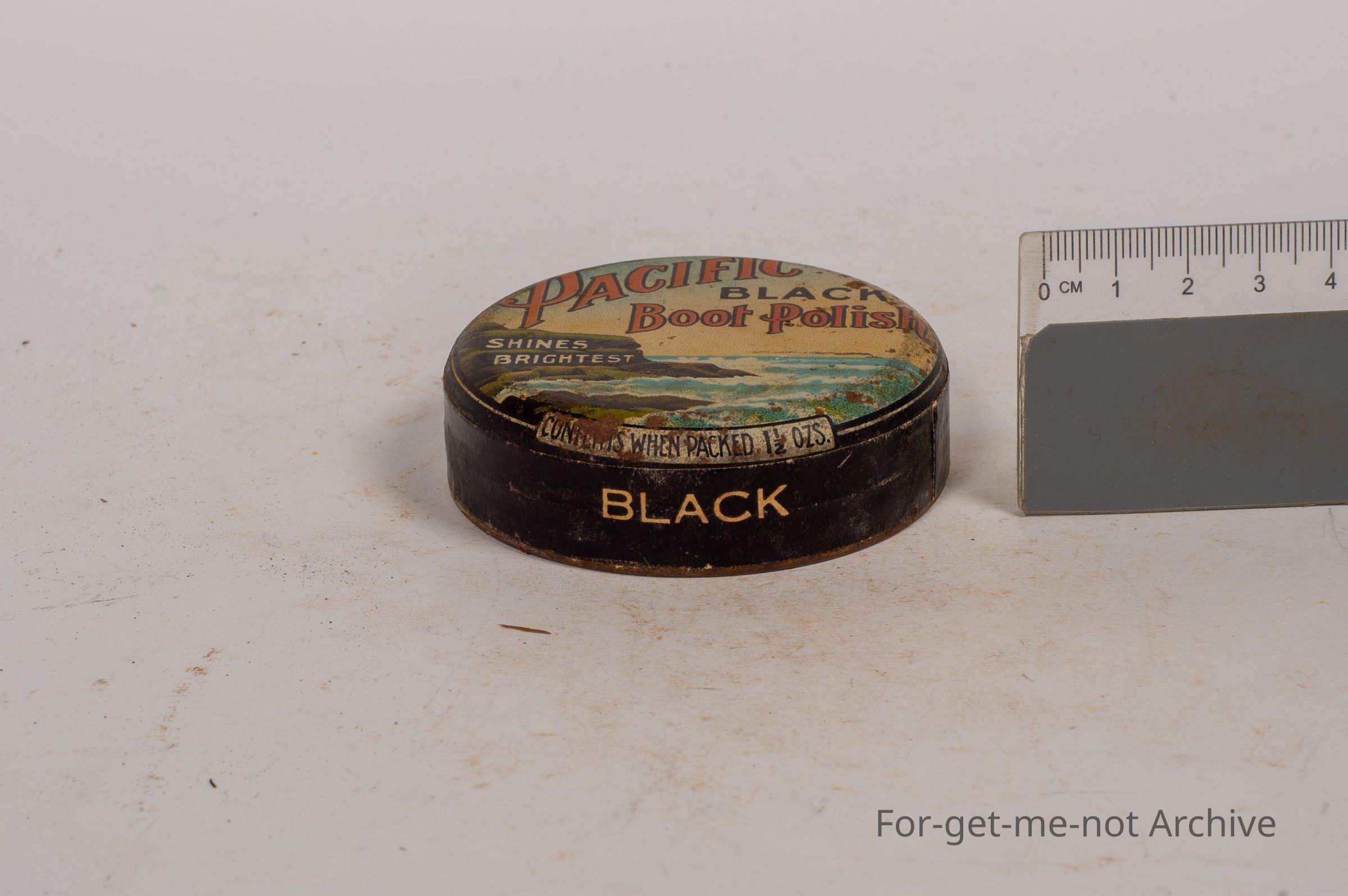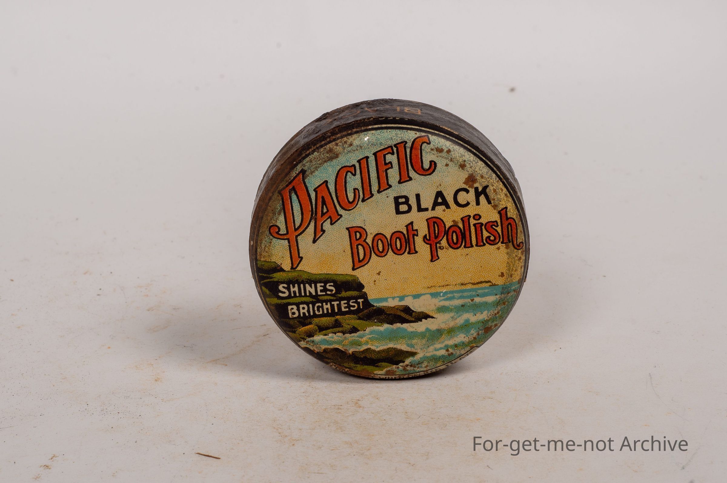 Boot Polish Tin. Pacific Black boot polish shines brightest, 1 and a half ounce tin, black colour with scene of coastal area, ship in the background, a rare early tin.