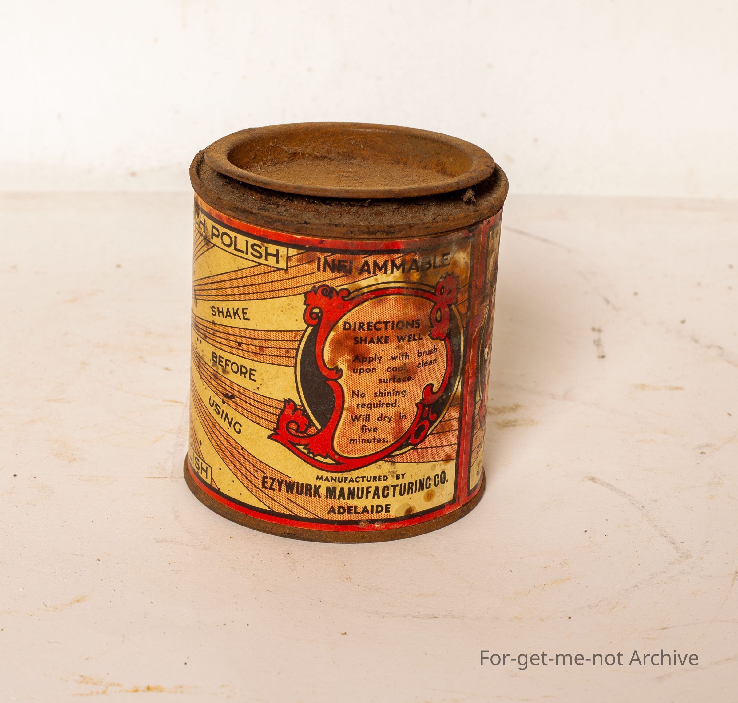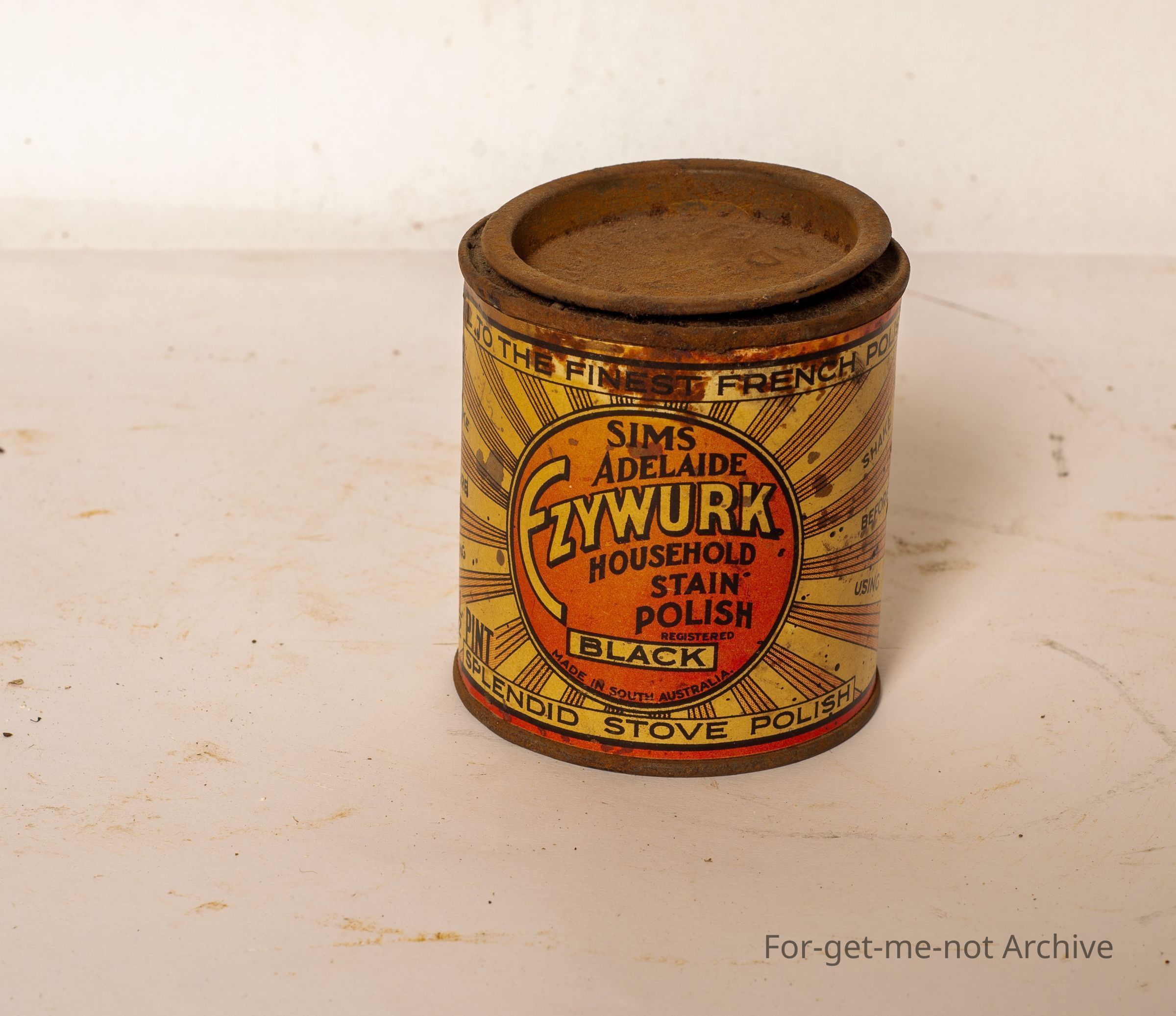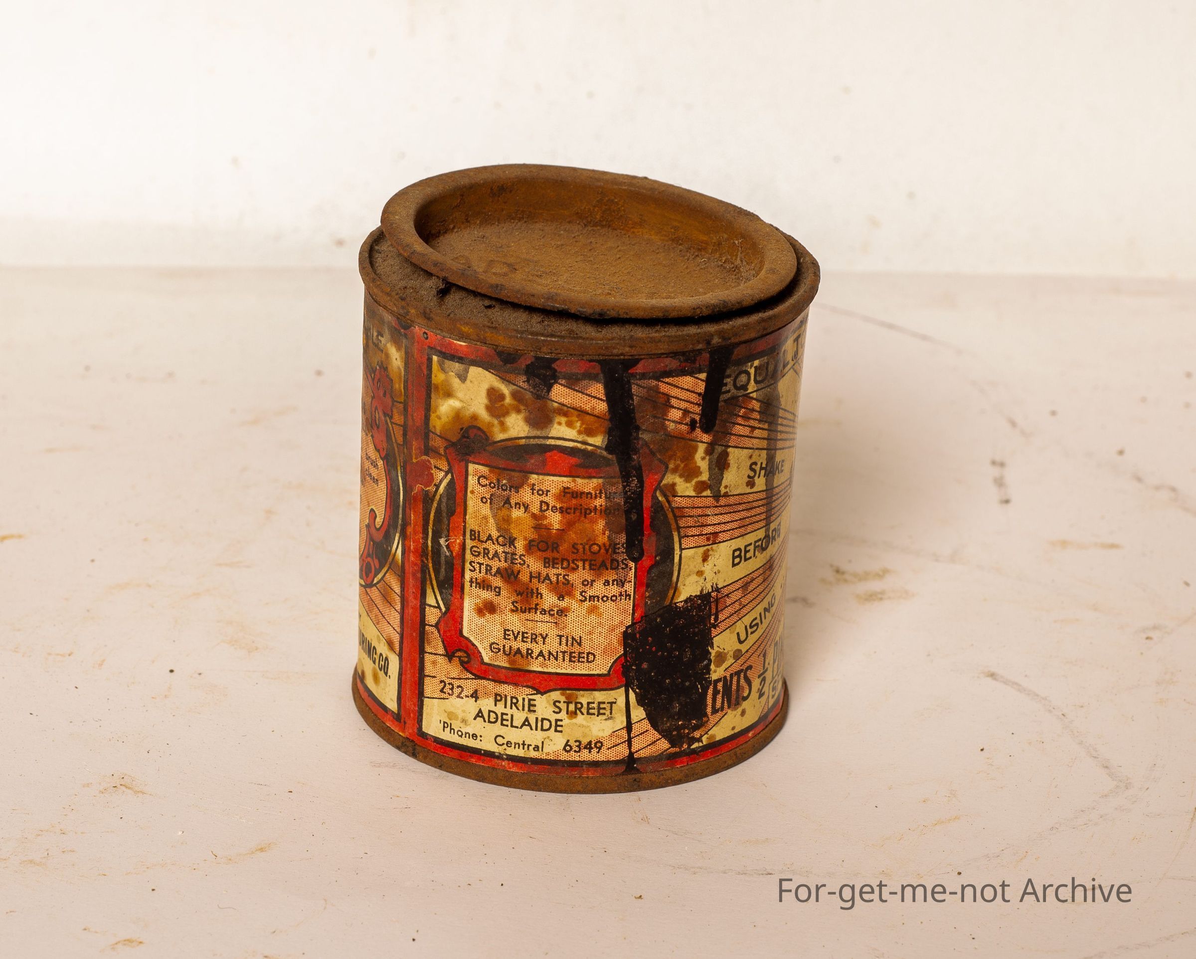 Paint tin, this tin, it's from Sims Adelaide Easy Work Household. Stain polish black, splendid stove polish. Lovely graphics. Half pint, tin, classic bit of Adelaide work.Collection
