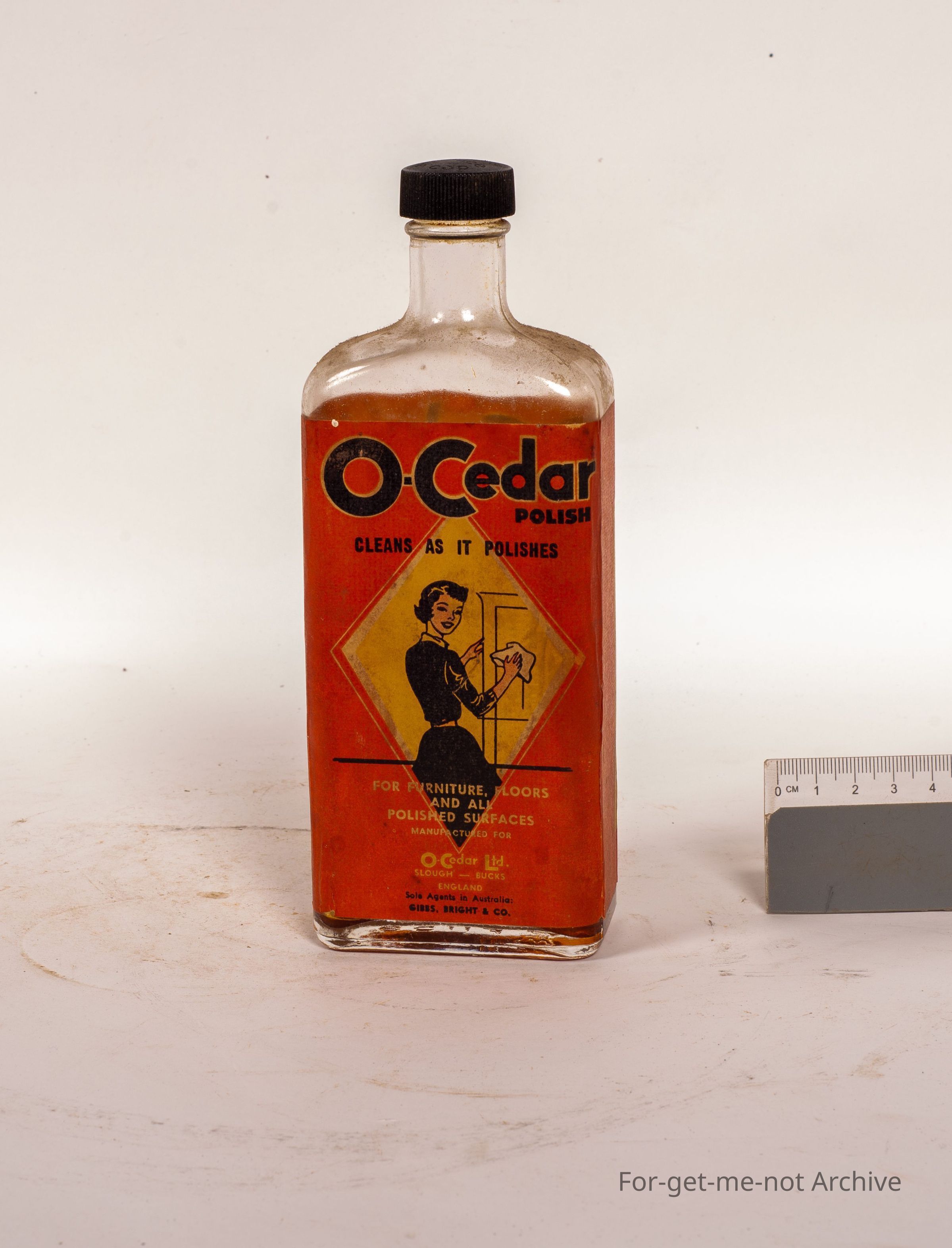 O-Cedar Polish for Wood. Contents 12 fluid ounces. Plenty of instructions how to use. Has its original paper label with a lady polishing furniture with this product.