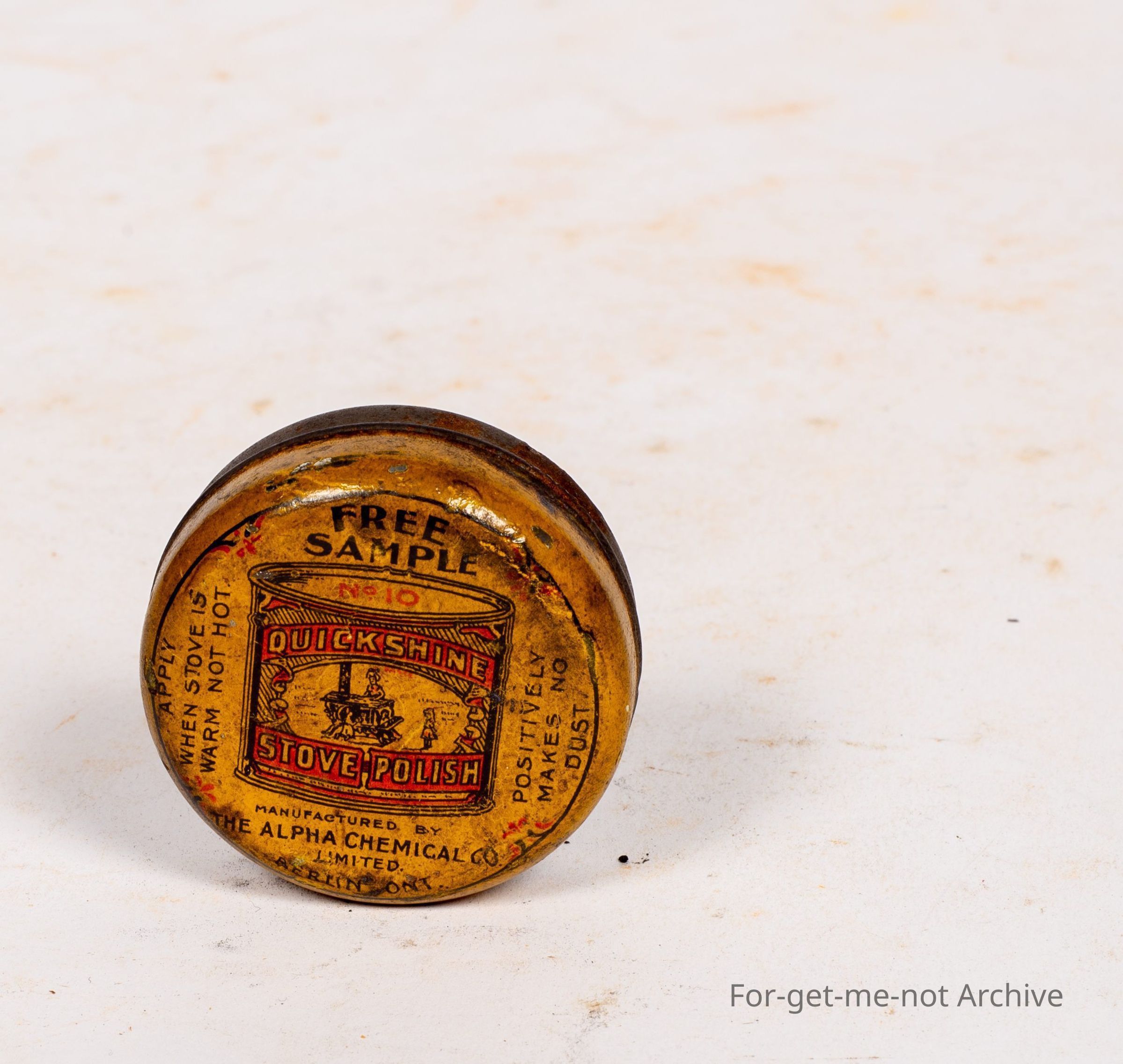 A small free sample tin of Quick Shine Stove Polish. Beautiful image on the front of the stove, plenty of text, this would be quite a rare tin,