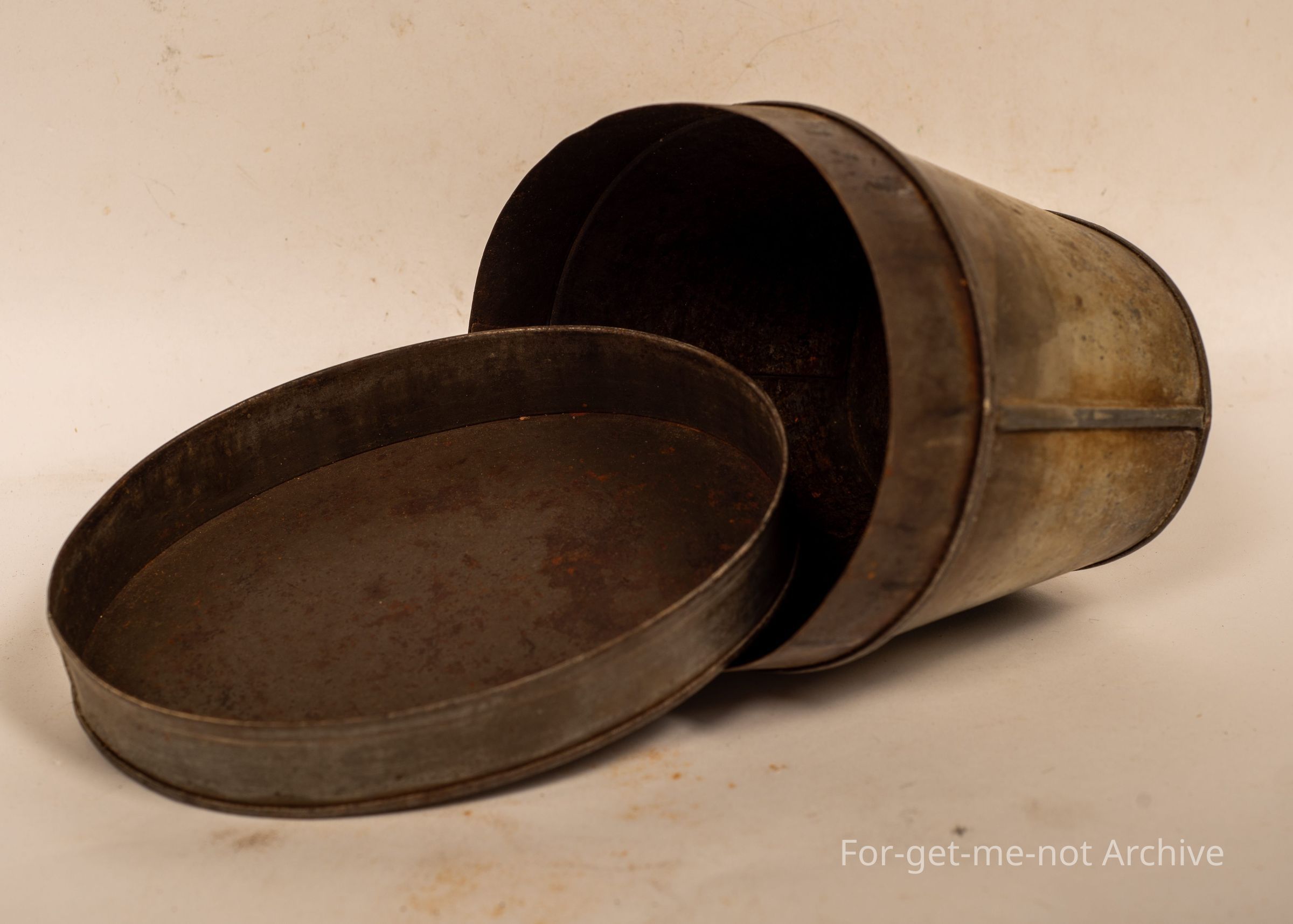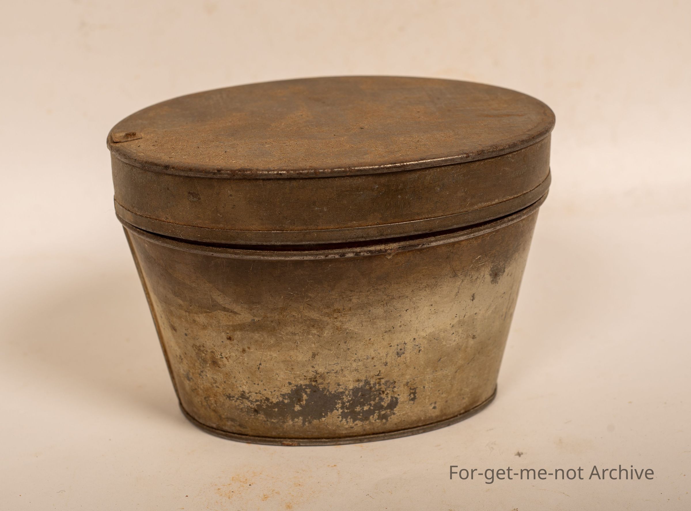 This is a pork pie tin with lid handle. The little wire handle missing. These were once a very popular pie. The tin is now very hard to find.