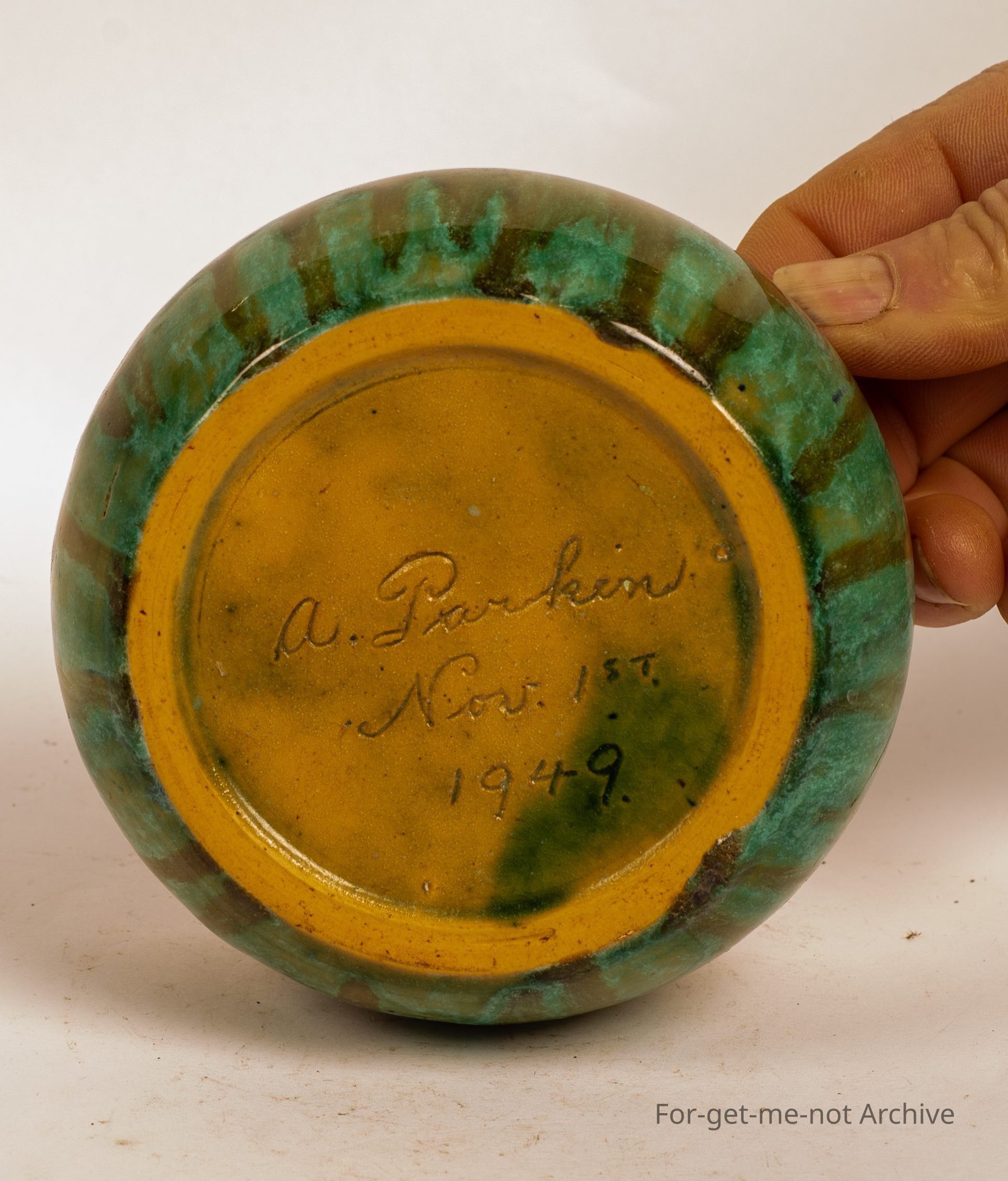Small studio pot inscribed on the base, A Parkin, November 1, 1949