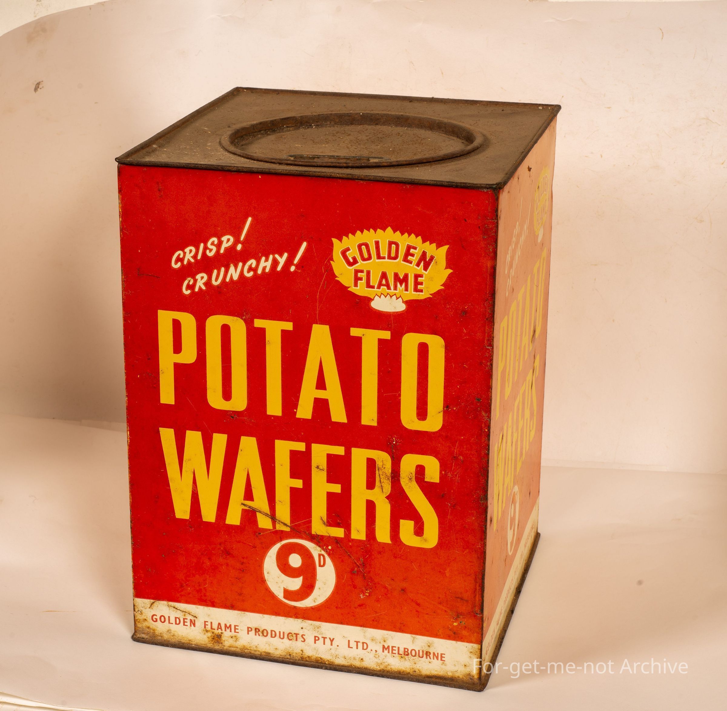 This is a large square shop counter tin from Golden Flame Potato Wafers, 9 pence, I imagine per packet, Golden Flame Products Melbourne. This is certainly not a common tin, has original lid, The colour is still good.Collection